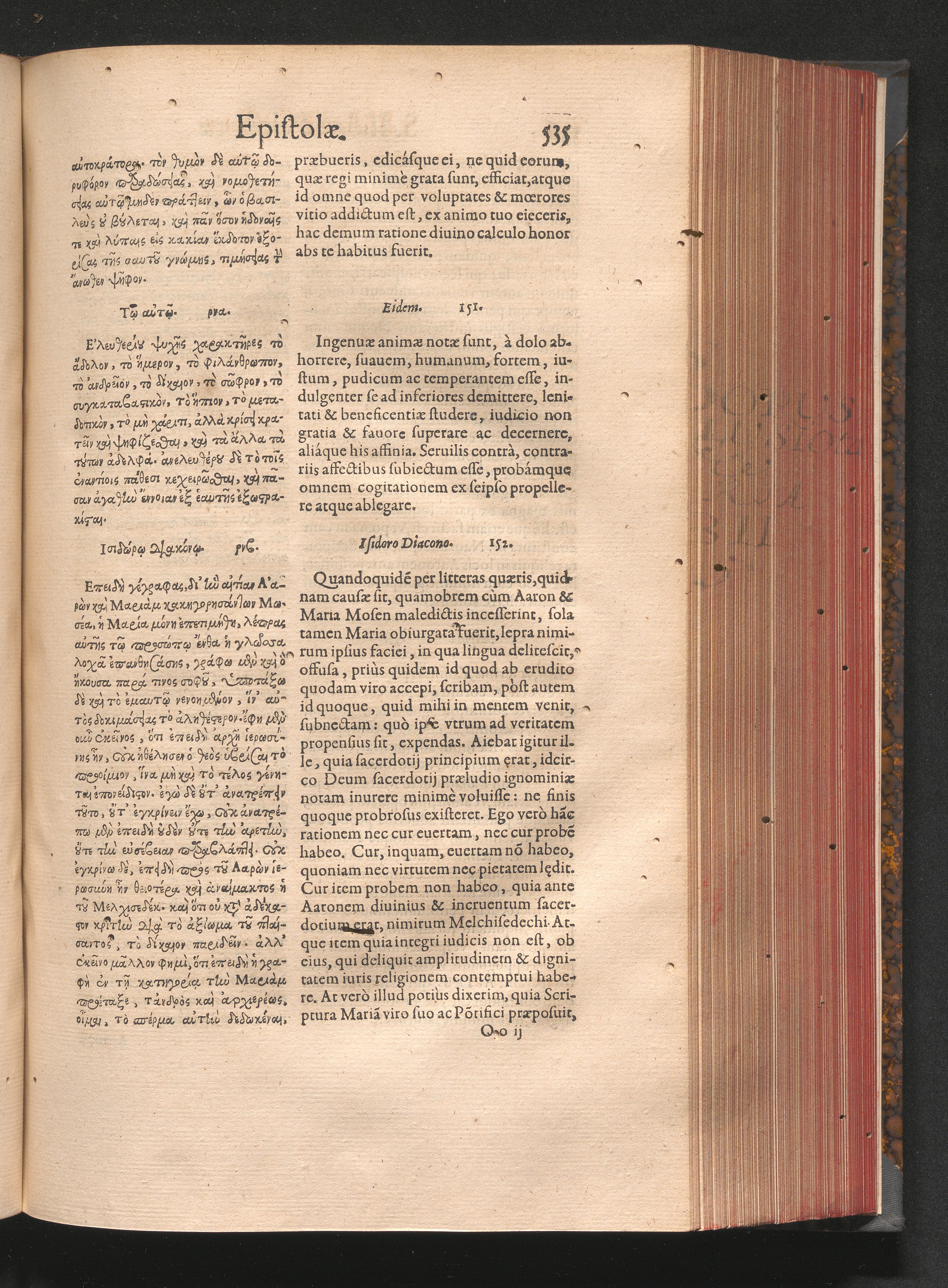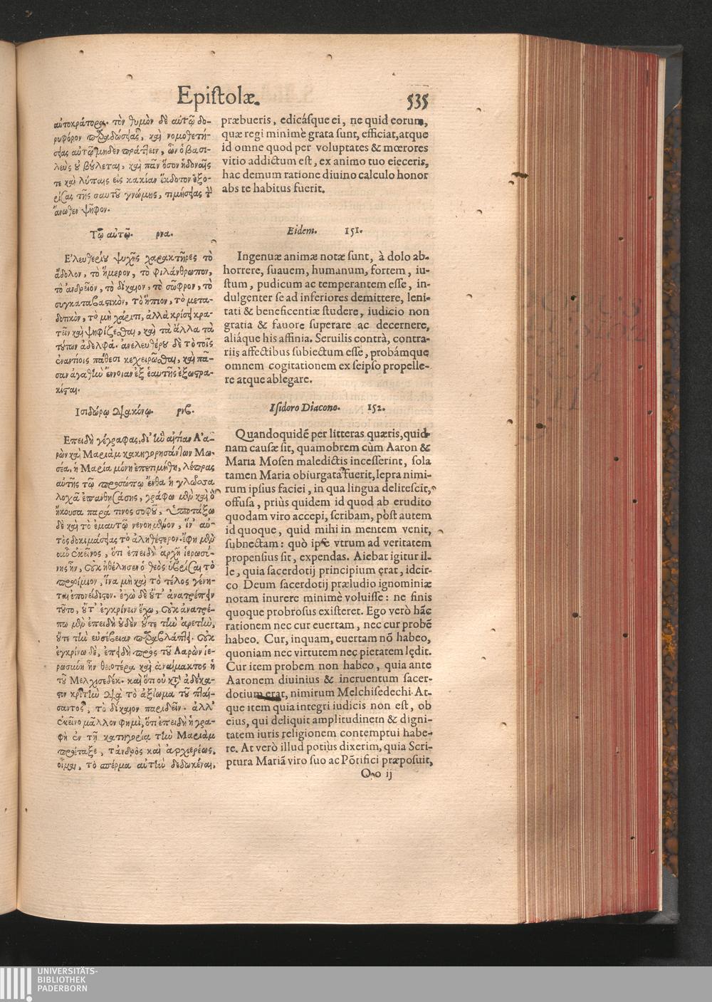 Epistolai tu hagiu Isidōru tu Pēlusiōtu / Quibus è regione accessit latina Clariss. viri Iacobi Billii Prunęi, S. Michaëlis in Eremo quondam Cœnobiarchæ, interpretatio