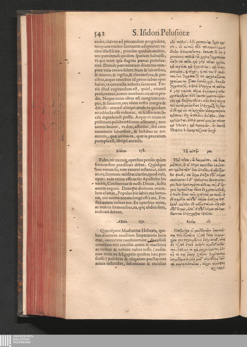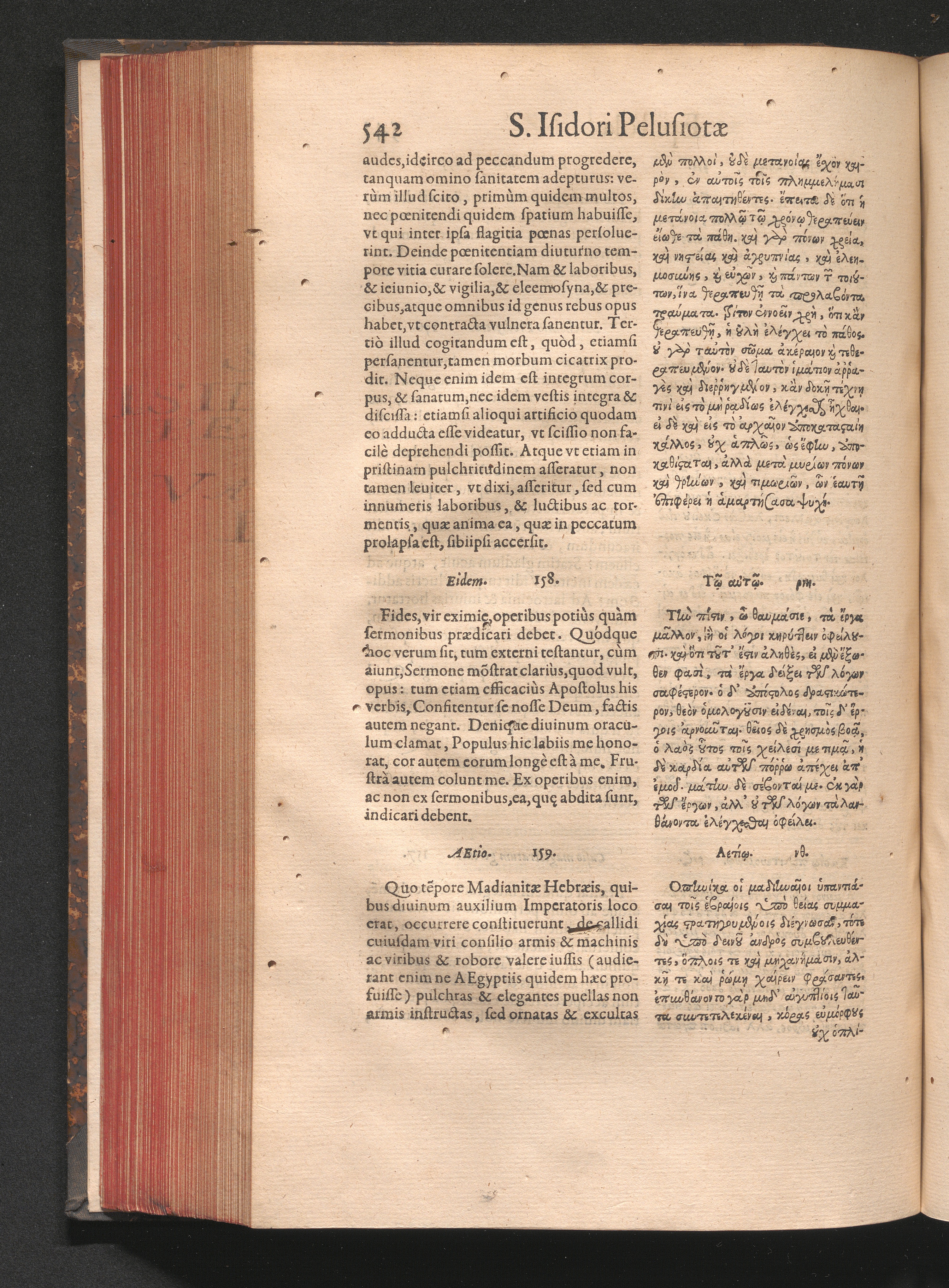 Epistolai tu hagiu Isidōru tu Pēlusiōtu / Quibus è regione accessit latina Clariss. viri Iacobi Billii Prunęi, S. Michaëlis in Eremo quondam Cœnobiarchæ, interpretatio