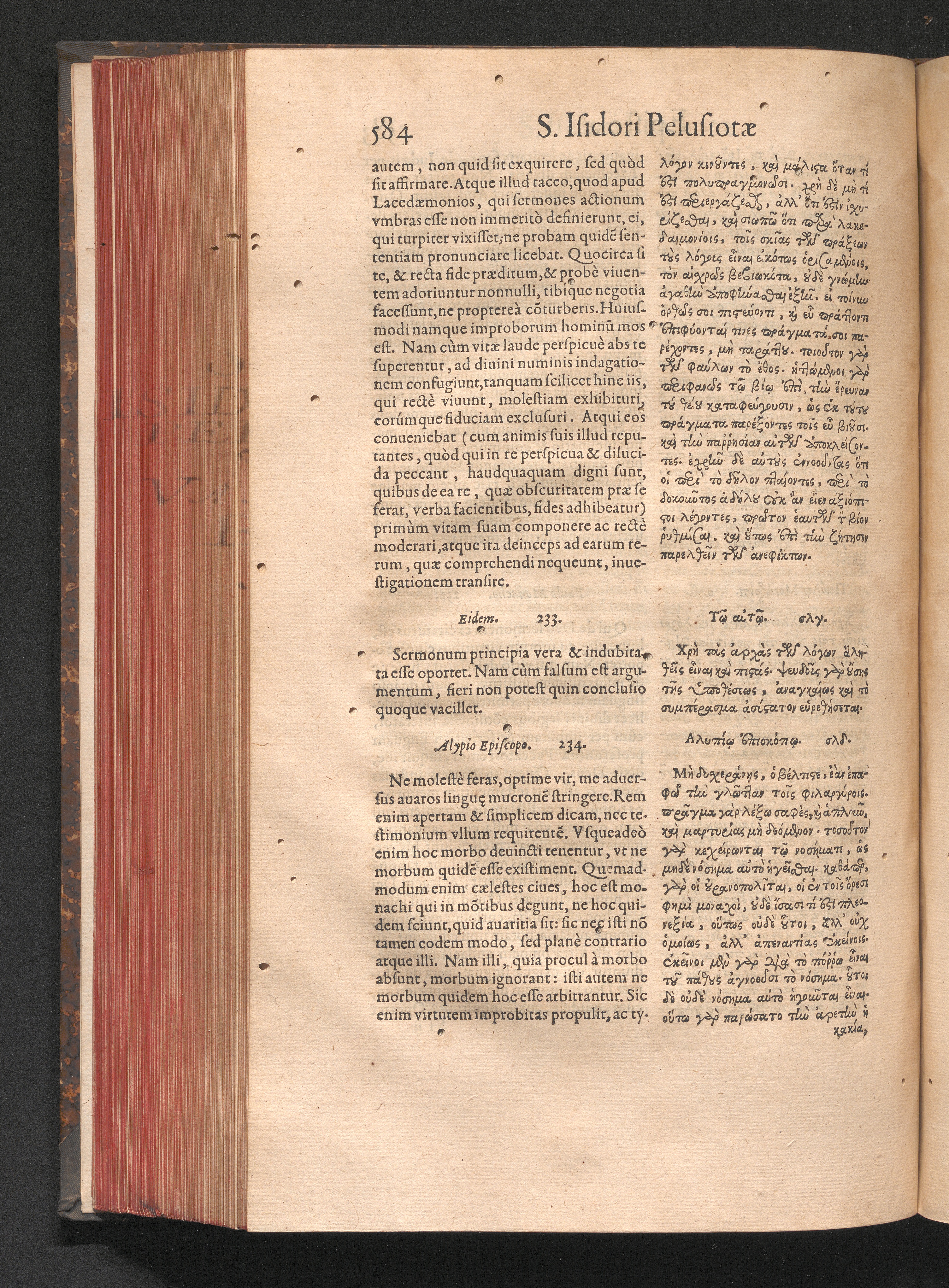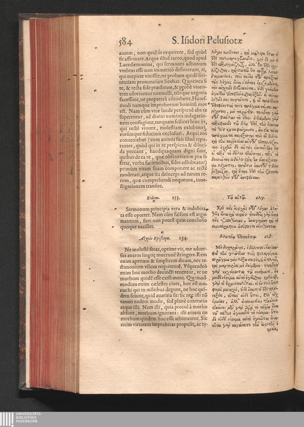 Epistolai tu hagiu Isidōru tu Pēlusiōtu / Quibus è regione accessit latina Clariss. viri Iacobi Billii Prunęi, S. Michaëlis in Eremo quondam Cœnobiarchæ, interpretatio