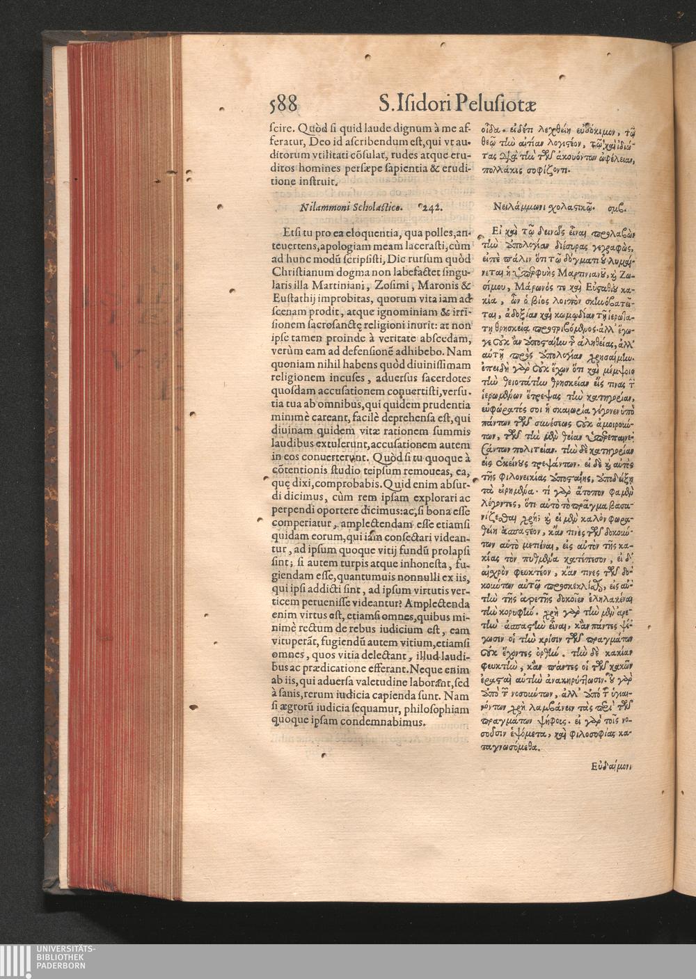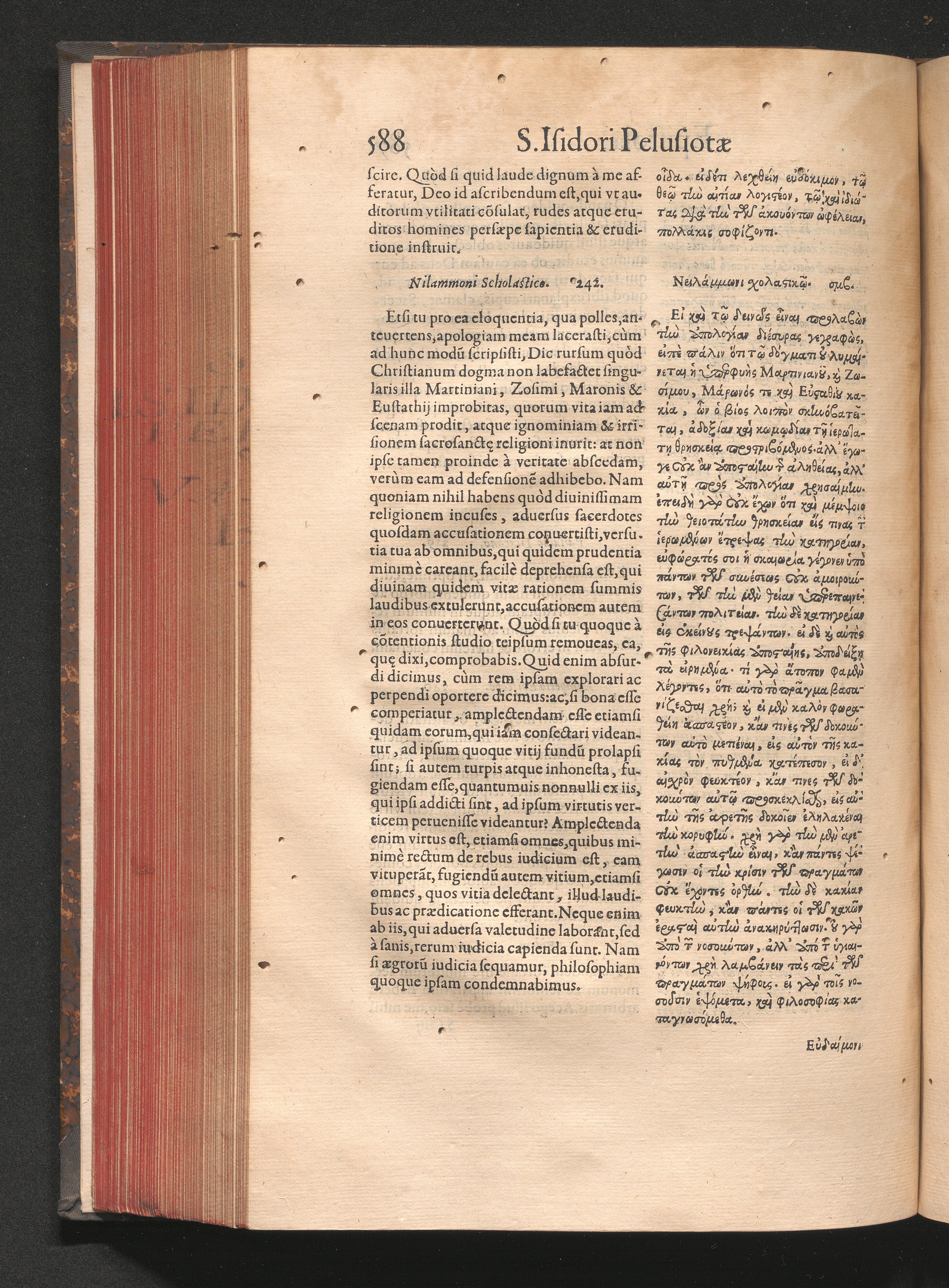 Epistolai tu hagiu Isidōru tu Pēlusiōtu / Quibus è regione accessit latina Clariss. viri Iacobi Billii Prunęi, S. Michaëlis in Eremo quondam Cœnobiarchæ, interpretatio