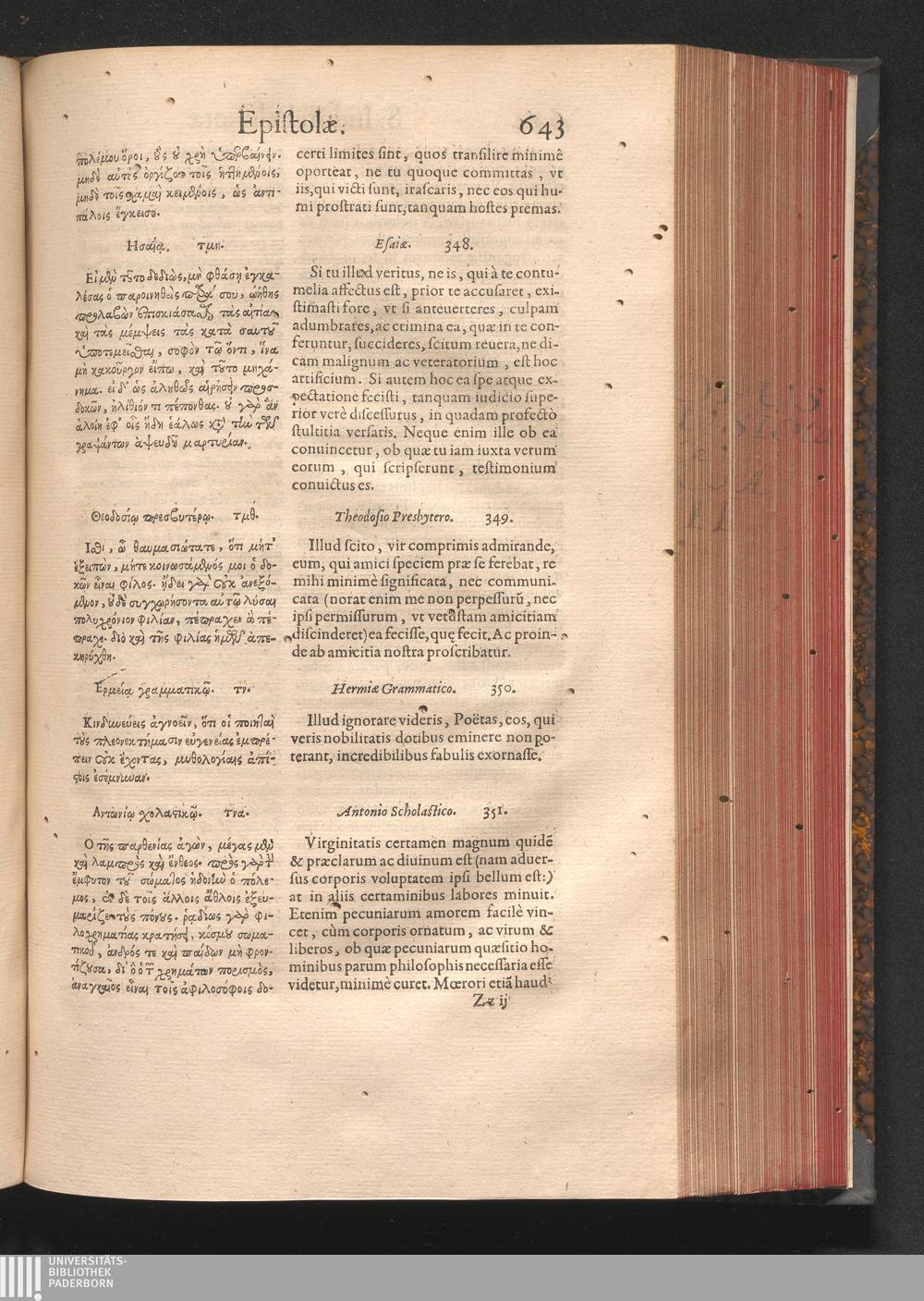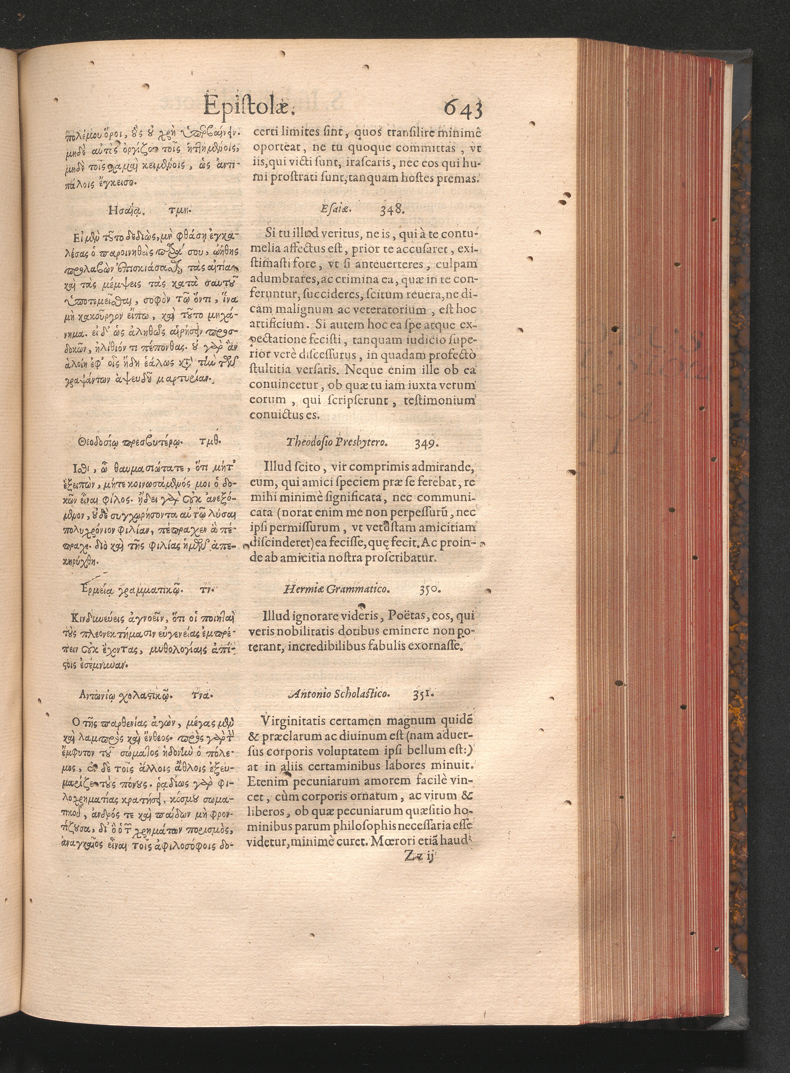 Epistolai tu hagiu Isidōru tu Pēlusiōtu / Quibus è regione accessit latina Clariss. viri Iacobi Billii Prunęi, S. Michaëlis in Eremo quondam Cœnobiarchæ, interpretatio