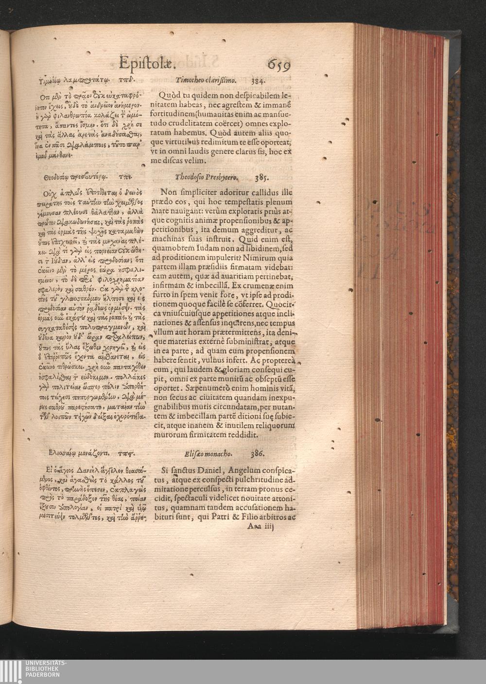 Epistolai tu hagiu Isidōru tu Pēlusiōtu / Quibus è regione accessit latina Clariss. viri Iacobi Billii Prunęi, S. Michaëlis in Eremo quondam Cœnobiarchæ, interpretatio