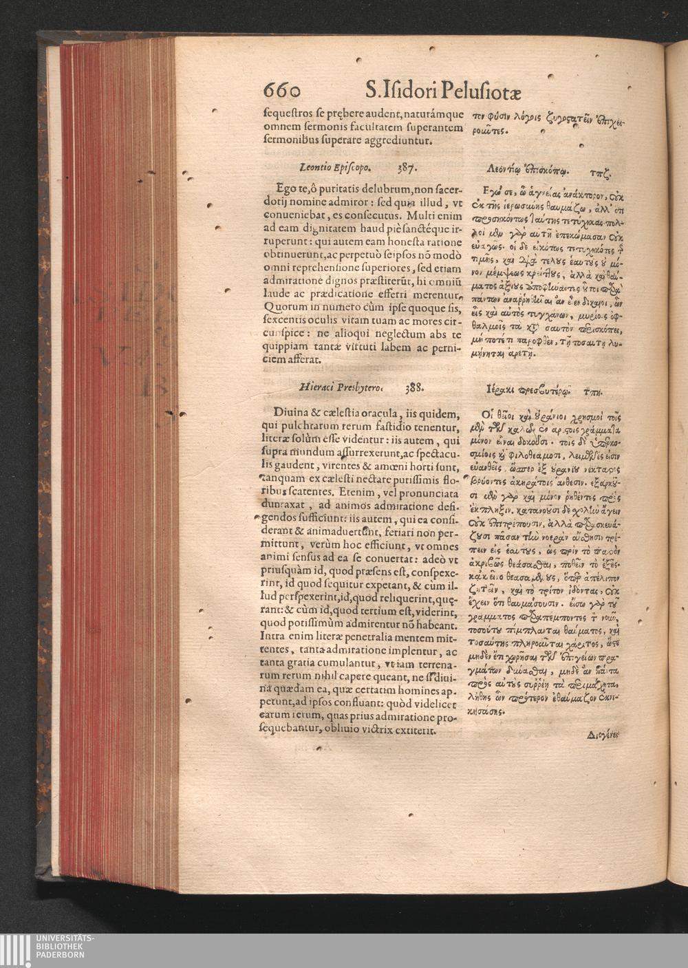 Epistolai tu hagiu Isidōru tu Pēlusiōtu / Quibus è regione accessit latina Clariss. viri Iacobi Billii Prunęi, S. Michaëlis in Eremo quondam Cœnobiarchæ, interpretatio
