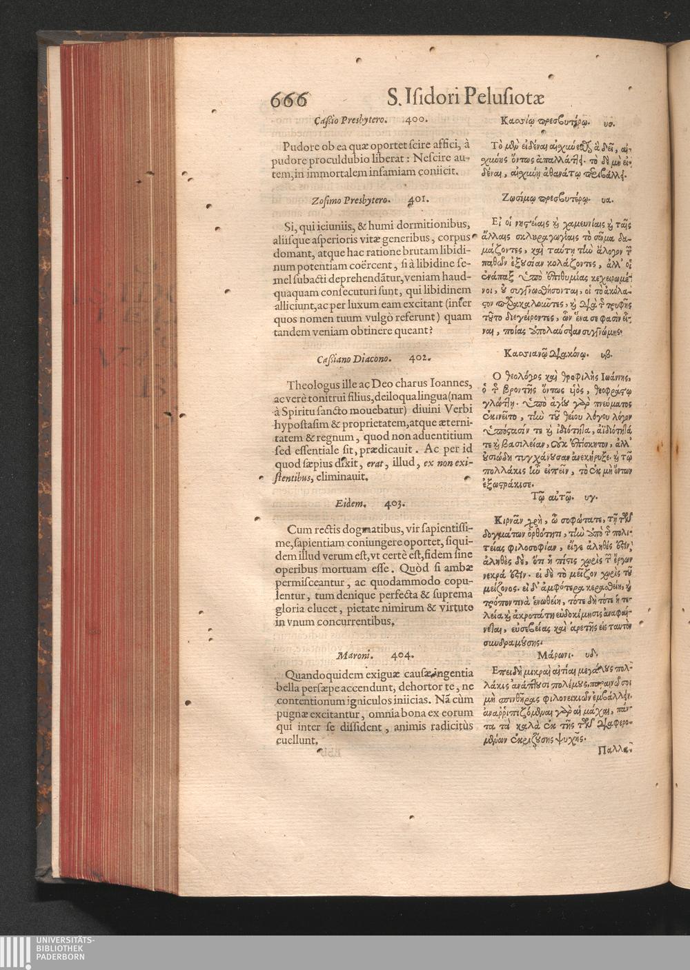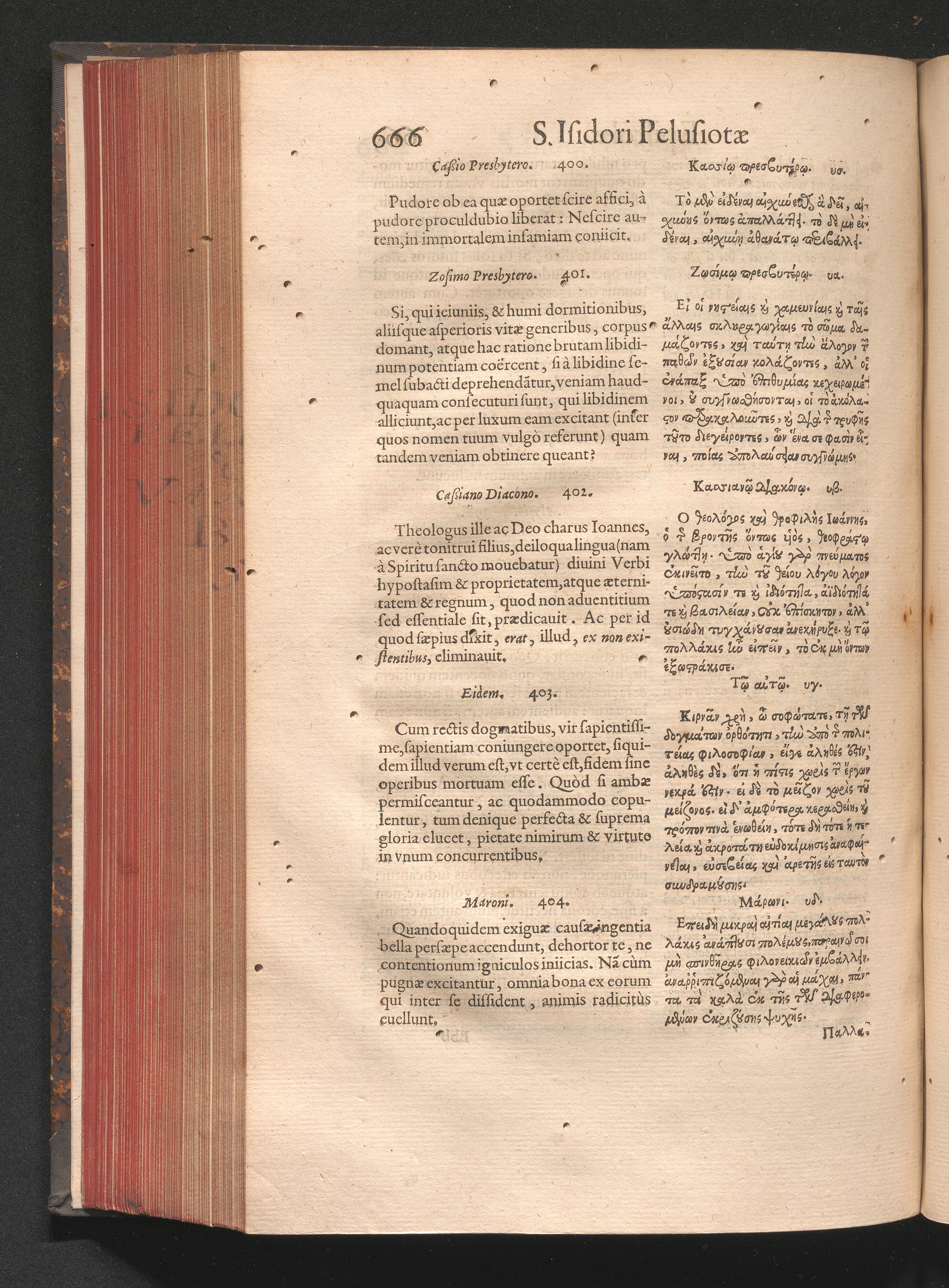 Epistolai tu hagiu Isidōru tu Pēlusiōtu / Quibus è regione accessit latina Clariss. viri Iacobi Billii Prunęi, S. Michaëlis in Eremo quondam Cœnobiarchæ, interpretatio
