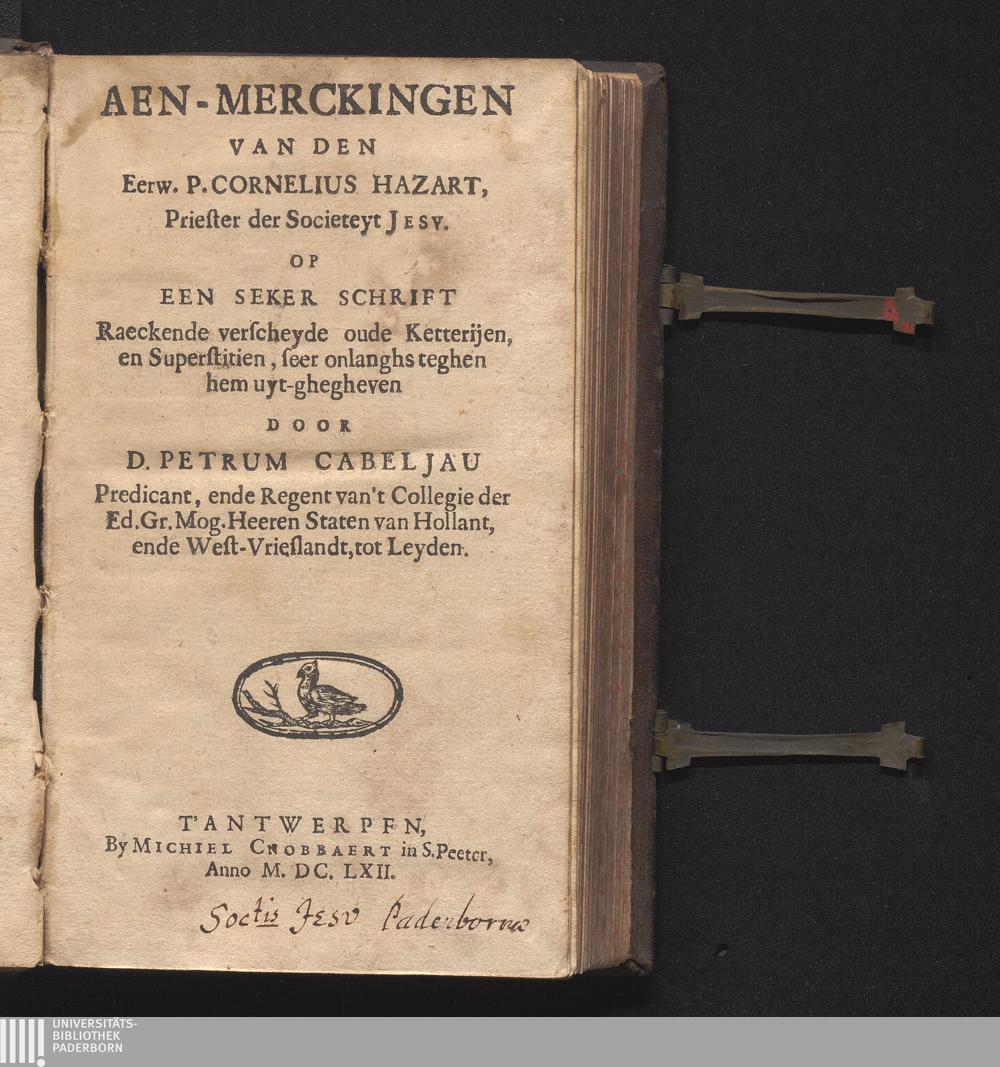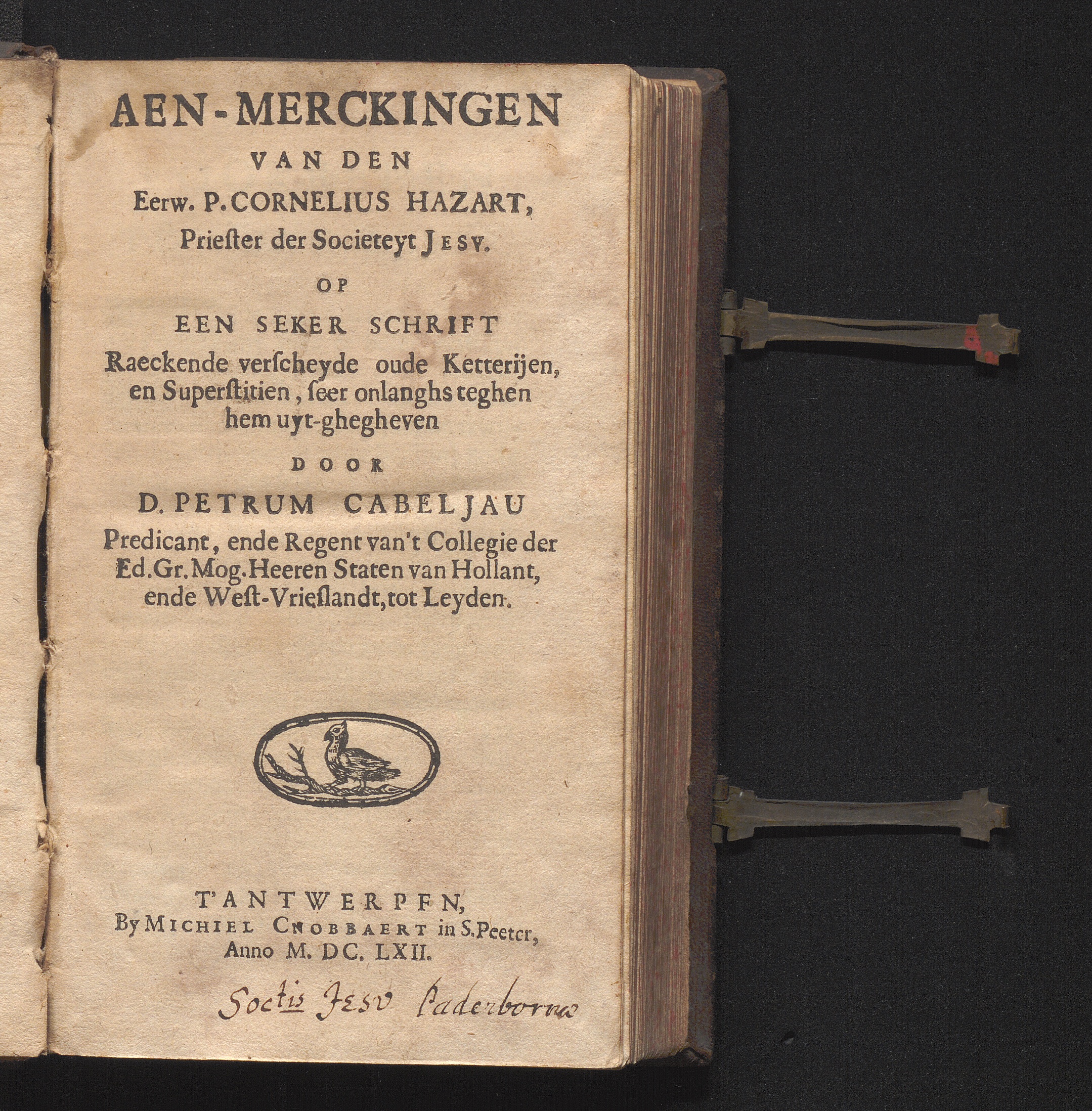 Aen-Merckingen Van Den Eerw. P. Cornelius Hazart, Priester der Societeyt Jesv. : Op Een Seker Schrift Raeckende verscheyde oude Ketterijen, en Superstitien, seer onlanghs teghen hem uyt-ghegheven / Door D. Petrum Cabeljau Predicant, ende Regent van't Collegie der Ed.Gr.Mog.-Heeren Staten van Hollant, ende West-Vrieslandt, tot Leyden