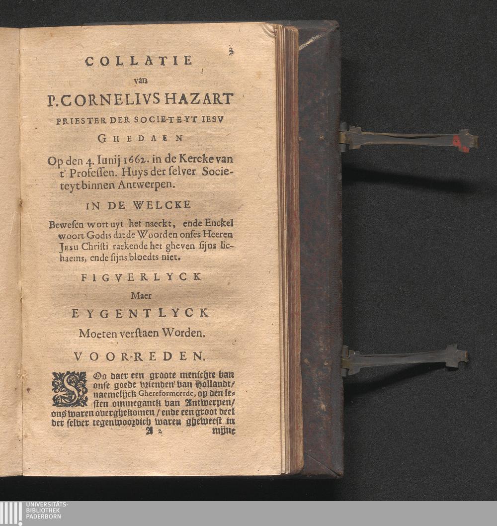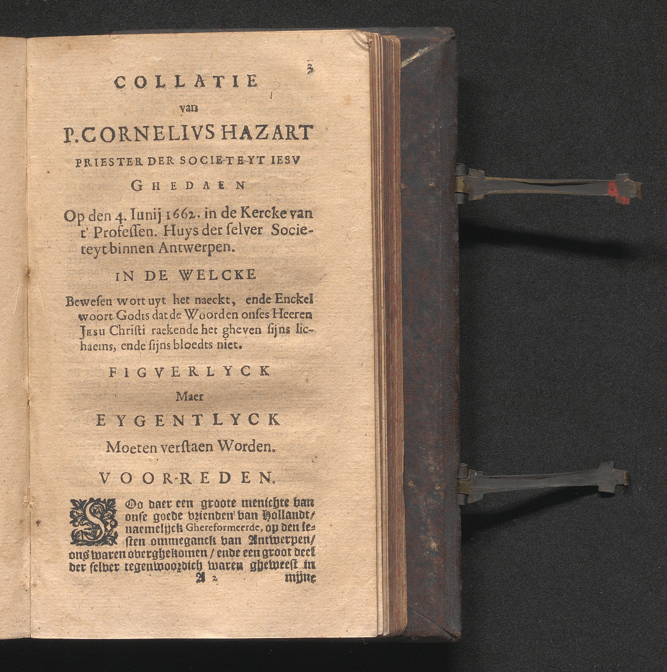 Collatie van P. Cornelius Hazart Priester Der Societeyt Jesv : Gedaen Inde Kercke van't Professen-huys binnen De Stadt Van Antwerpen Op Den IV. Junij 1662. In De Welcke Uyt Het Naeckt En Enkel Gods-VVoort Bewesen wort, dat de woorden Christi Rakende Het H. Sacrament Des Avtaers Niet Figverlyk Maer Eygentlyck Moeten verstaen worden