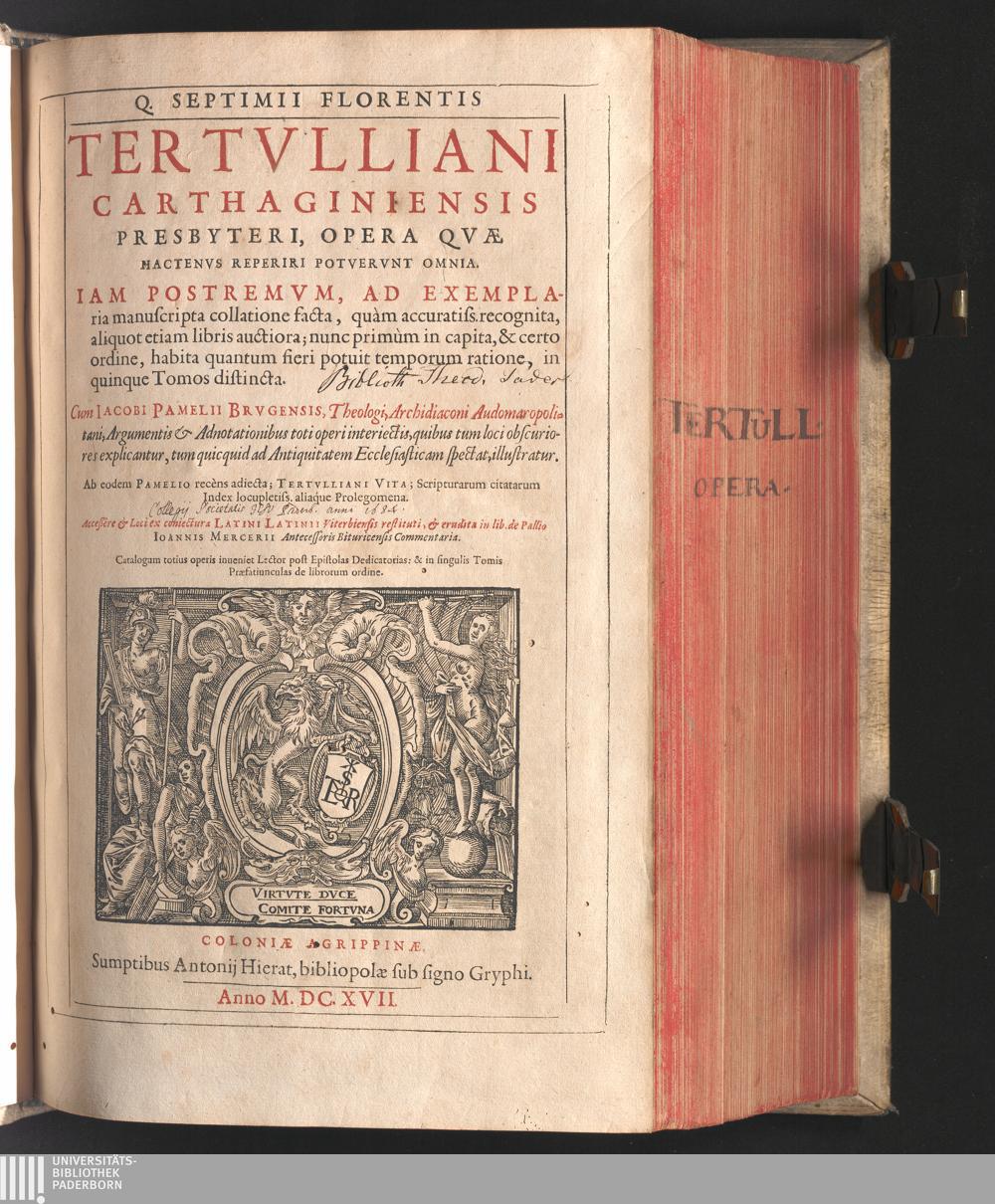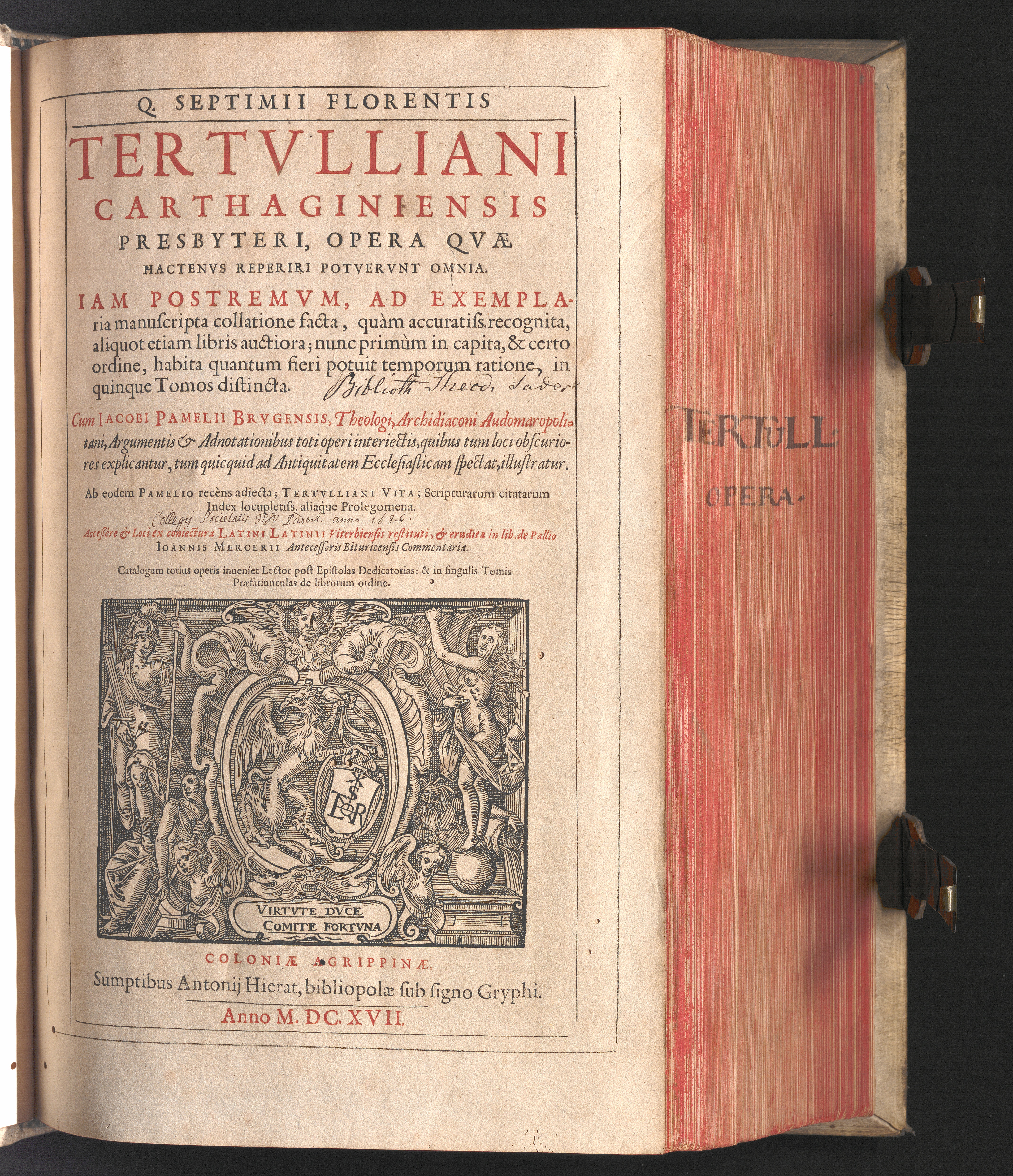 Q. Septimii Florentis Tertvlliani Carthaginiensis Presbyteri, Opera Qvæ Hactenvs Reperiri Potvervnt Omnia : Iam Postremvm, Ad Exemplaria manuscripta collatione facta, quàm accuratiss. recognita, aliquot etiam libris auctiora; nunc primùm in capita, & certo ordine, habita quantum fieri potuit temporum ratione, in quinque Tomos distincta / Cum Iacobi Pamelii Brvgensis, Theologi, Archidiaconi Audomaropolitani, Argumentis & Adnotationibus toti operi interiectis, quibus tum loci obscuriores explicantur, tum quicquid ad Antiquitatem Ecclesiasticam spectat, illustratur ... Acceßère & Loci ex coniectura Latini Latinii Viterbiensis restituti, & erudita in lib. de Pallio Joannis Mercerii Antecessoris Bituricensis Commentaria