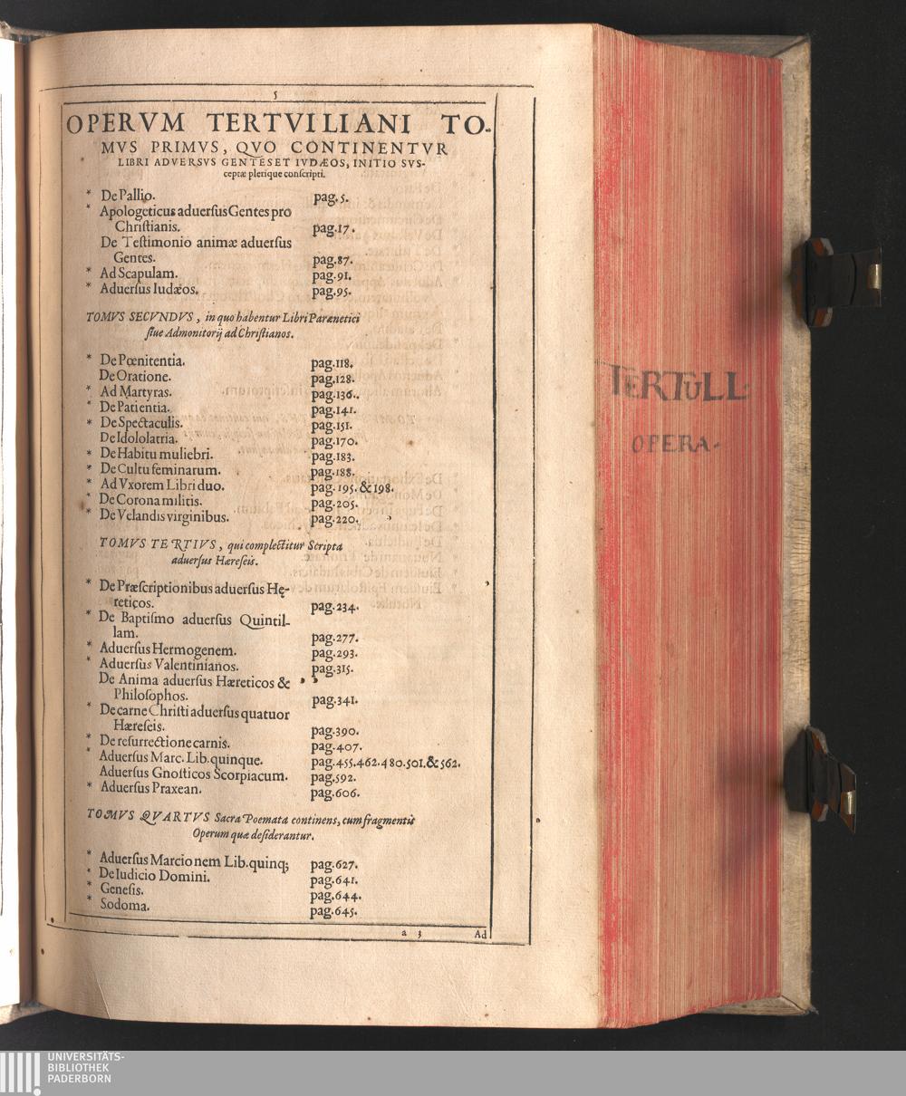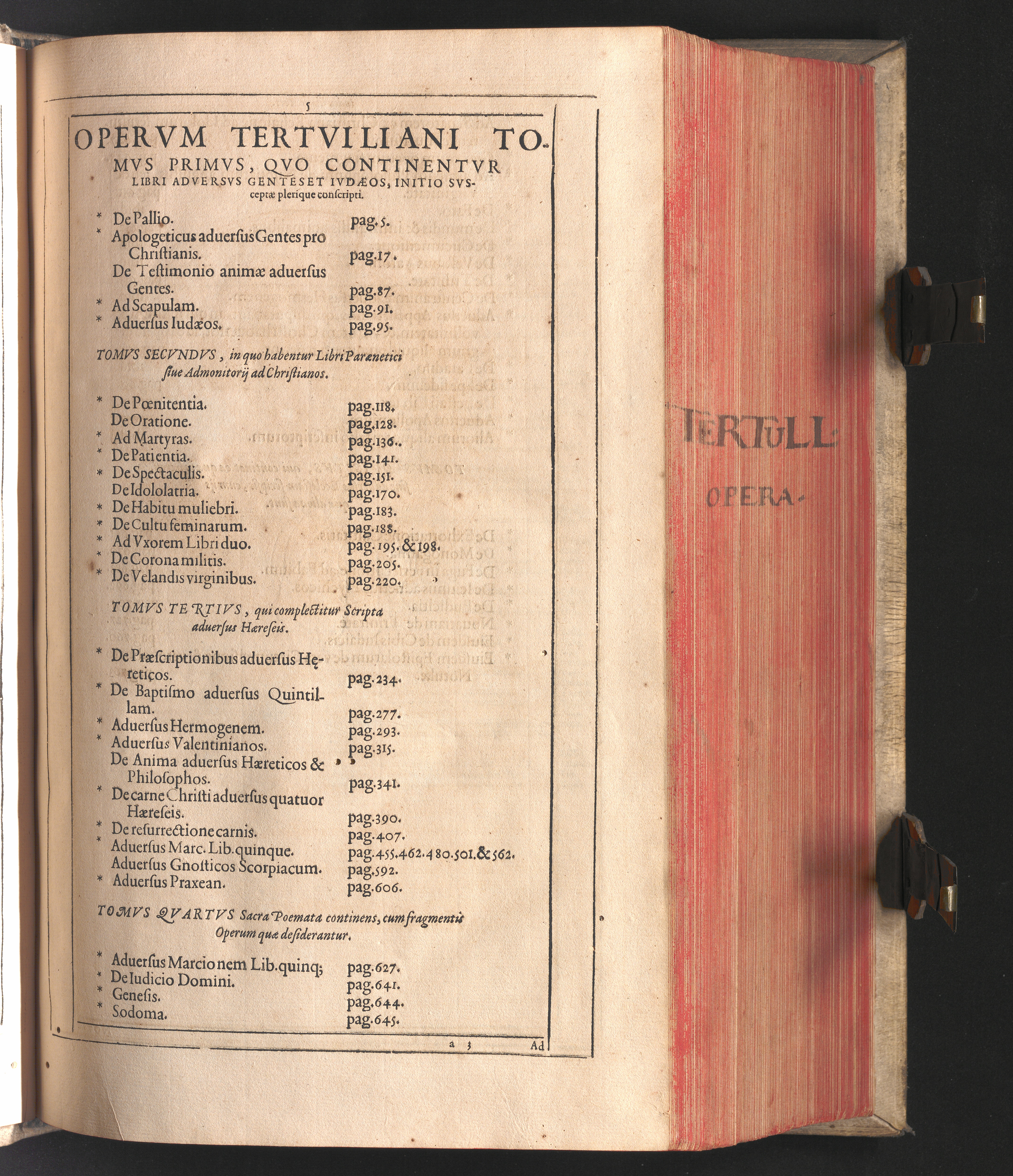 Q. Septimii Florentis Tertvlliani Carthaginiensis Presbyteri, Opera Qvæ Hactenvs Reperiri Potvervnt Omnia : Iam Postremvm, Ad Exemplaria manuscripta collatione facta, quàm accuratiss. recognita, aliquot etiam libris auctiora; nunc primùm in capita, & certo ordine, habita quantum fieri potuit temporum ratione, in quinque Tomos distincta / Cum Iacobi Pamelii Brvgensis, Theologi, Archidiaconi Audomaropolitani, Argumentis & Adnotationibus toti operi interiectis, quibus tum loci obscuriores explicantur, tum quicquid ad Antiquitatem Ecclesiasticam spectat, illustratur ... Acceßère & Loci ex coniectura Latini Latinii Viterbiensis restituti, & erudita in lib. de Pallio Joannis Mercerii Antecessoris Bituricensis Commentaria