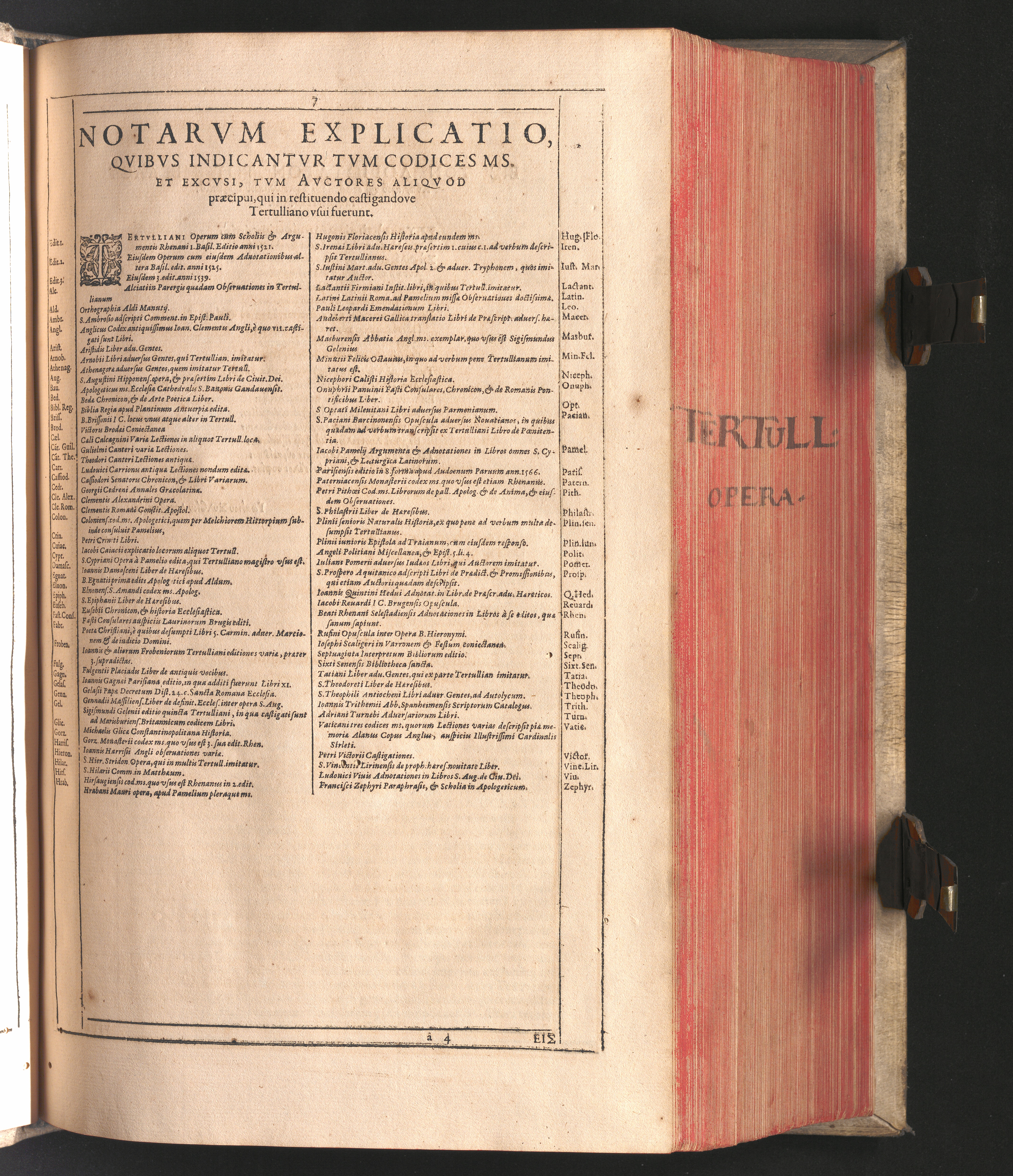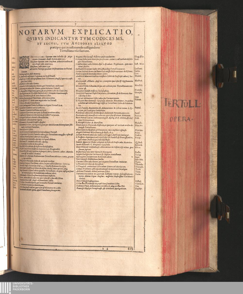 Q. Septimii Florentis Tertvlliani Carthaginiensis Presbyteri, Opera Qvæ Hactenvs Reperiri Potvervnt Omnia : Iam Postremvm, Ad Exemplaria manuscripta collatione facta, quàm accuratiss. recognita, aliquot etiam libris auctiora; nunc primùm in capita, & certo ordine, habita quantum fieri potuit temporum ratione, in quinque Tomos distincta / Cum Iacobi Pamelii Brvgensis, Theologi, Archidiaconi Audomaropolitani, Argumentis & Adnotationibus toti operi interiectis, quibus tum loci obscuriores explicantur, tum quicquid ad Antiquitatem Ecclesiasticam spectat, illustratur ... Acceßère & Loci ex coniectura Latini Latinii Viterbiensis restituti, & erudita in lib. de Pallio Joannis Mercerii Antecessoris Bituricensis Commentaria