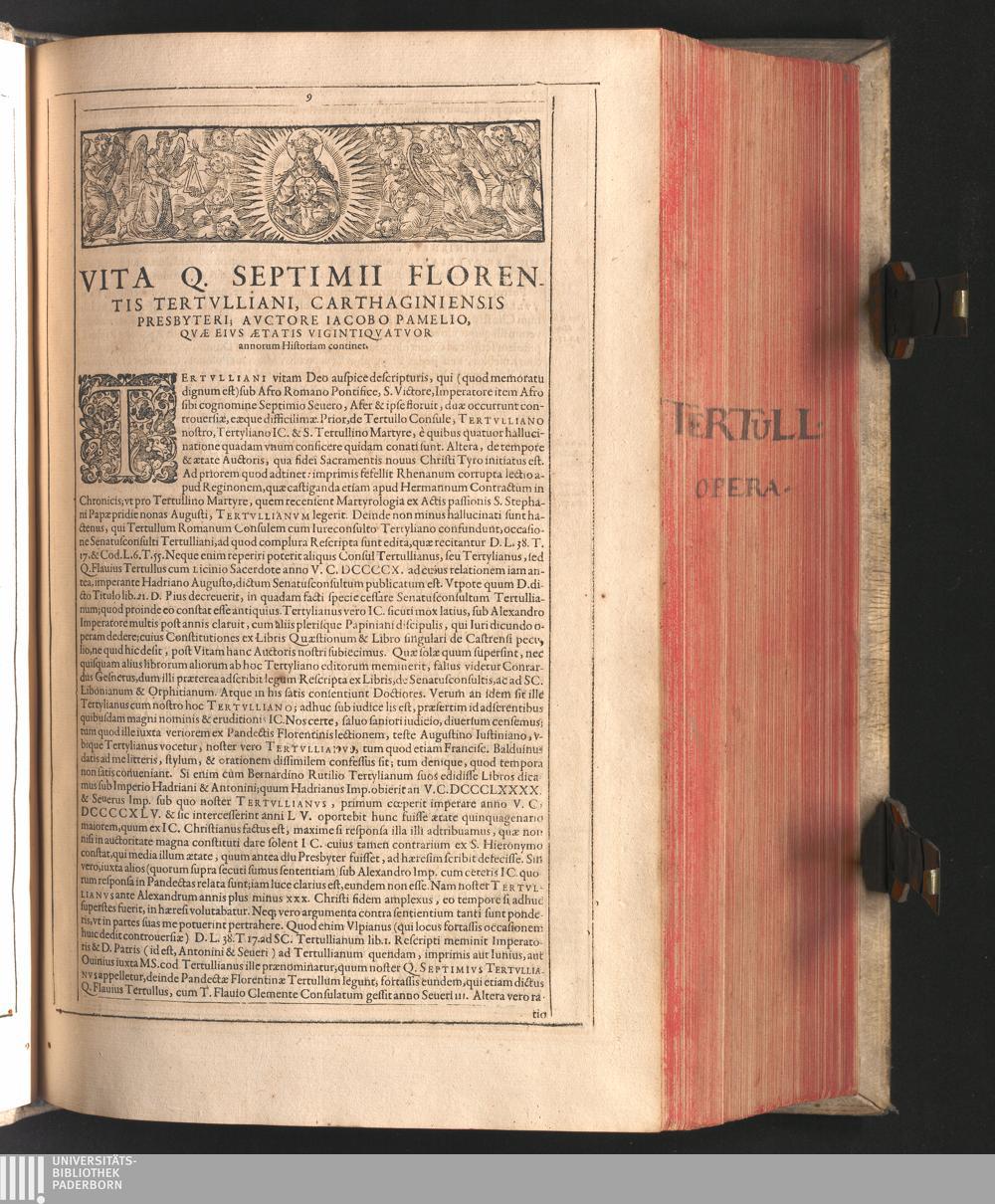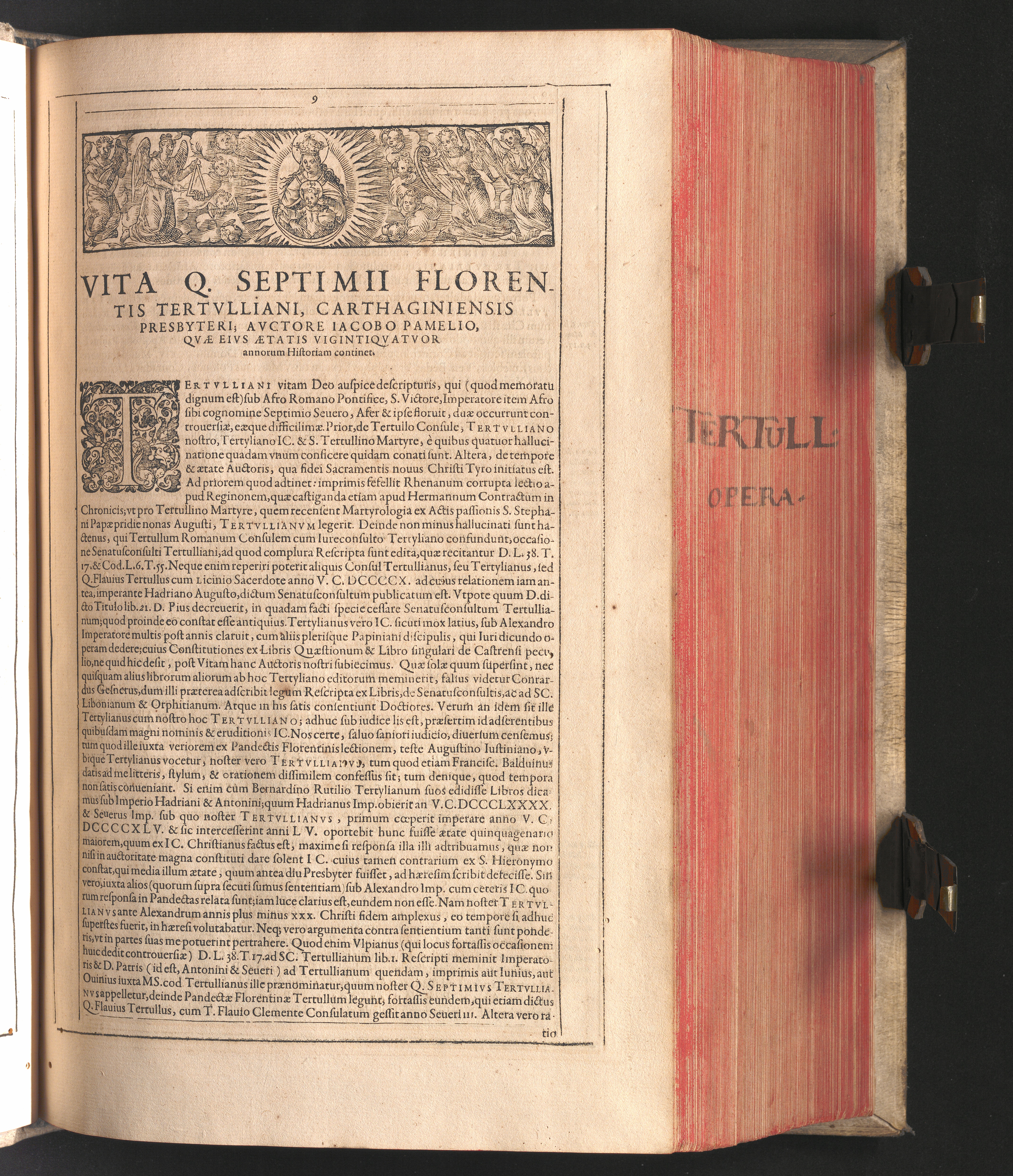 Q. Septimii Florentis Tertvlliani Carthaginiensis Presbyteri, Opera Qvæ Hactenvs Reperiri Potvervnt Omnia : Iam Postremvm, Ad Exemplaria manuscripta collatione facta, quàm accuratiss. recognita, aliquot etiam libris auctiora; nunc primùm in capita, & certo ordine, habita quantum fieri potuit temporum ratione, in quinque Tomos distincta / Cum Iacobi Pamelii Brvgensis, Theologi, Archidiaconi Audomaropolitani, Argumentis & Adnotationibus toti operi interiectis, quibus tum loci obscuriores explicantur, tum quicquid ad Antiquitatem Ecclesiasticam spectat, illustratur ... Acceßère & Loci ex coniectura Latini Latinii Viterbiensis restituti, & erudita in lib. de Pallio Joannis Mercerii Antecessoris Bituricensis Commentaria