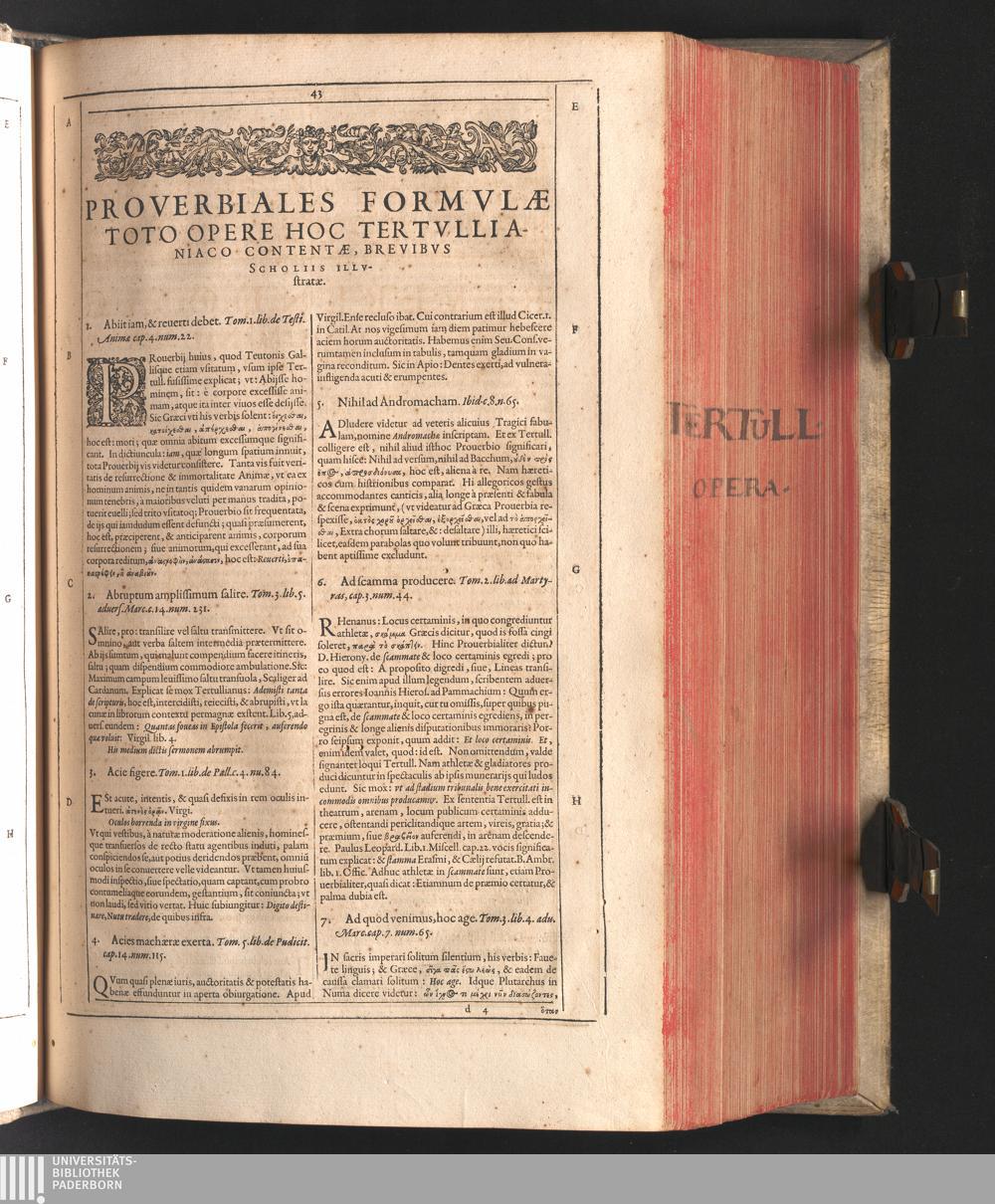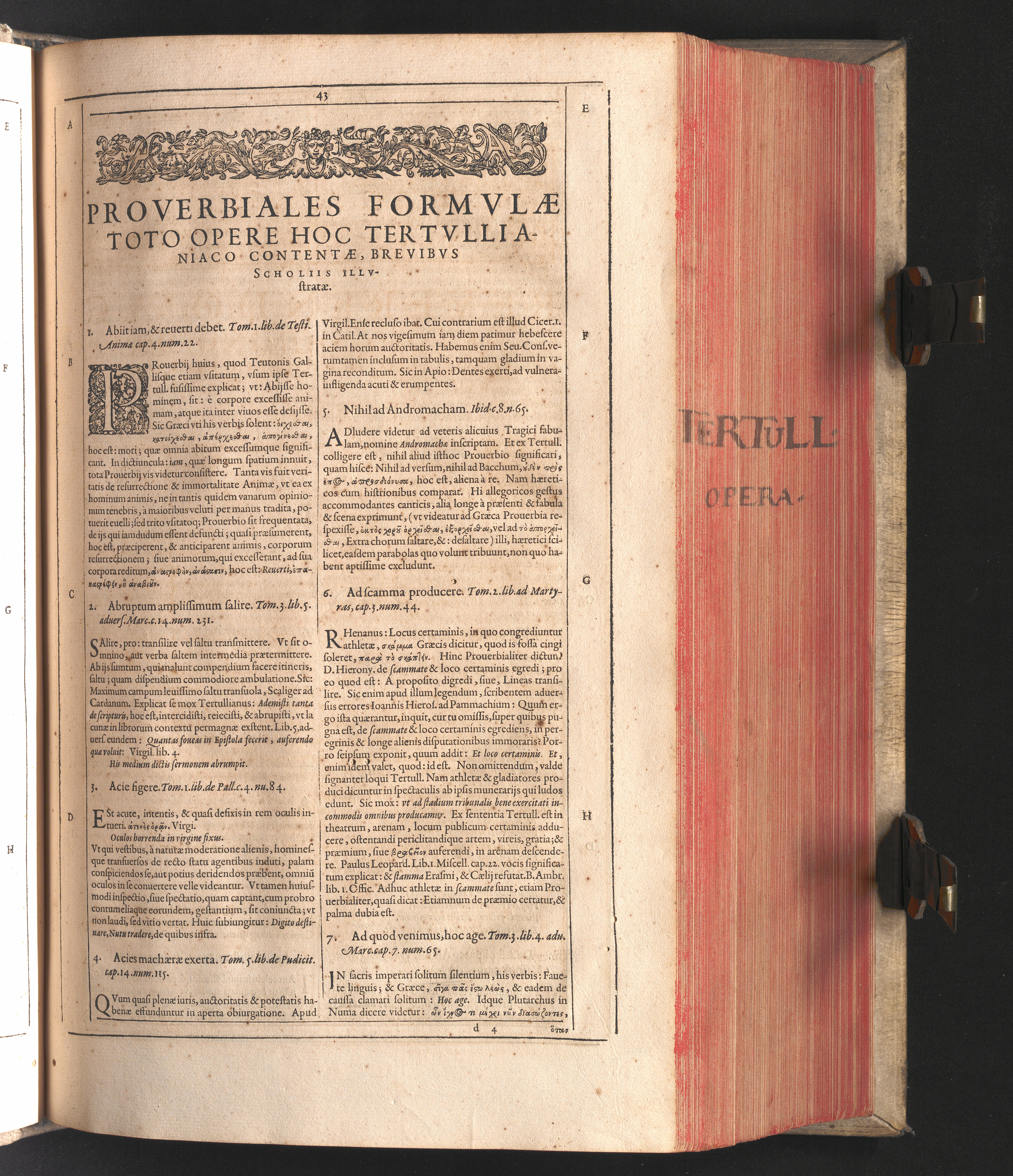 Q. Septimii Florentis Tertvlliani Carthaginiensis Presbyteri, Opera Qvæ Hactenvs Reperiri Potvervnt Omnia : Iam Postremvm, Ad Exemplaria manuscripta collatione facta, quàm accuratiss. recognita, aliquot etiam libris auctiora; nunc primùm in capita, & certo ordine, habita quantum fieri potuit temporum ratione, in quinque Tomos distincta / Cum Iacobi Pamelii Brvgensis, Theologi, Archidiaconi Audomaropolitani, Argumentis & Adnotationibus toti operi interiectis, quibus tum loci obscuriores explicantur, tum quicquid ad Antiquitatem Ecclesiasticam spectat, illustratur ... Acceßère & Loci ex coniectura Latini Latinii Viterbiensis restituti, & erudita in lib. de Pallio Joannis Mercerii Antecessoris Bituricensis Commentaria
