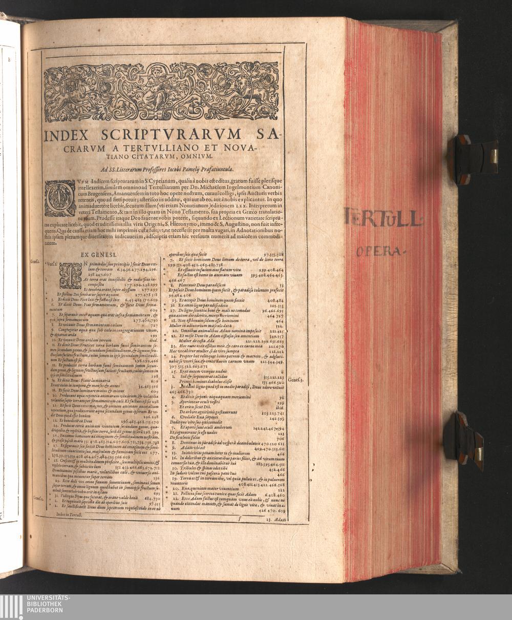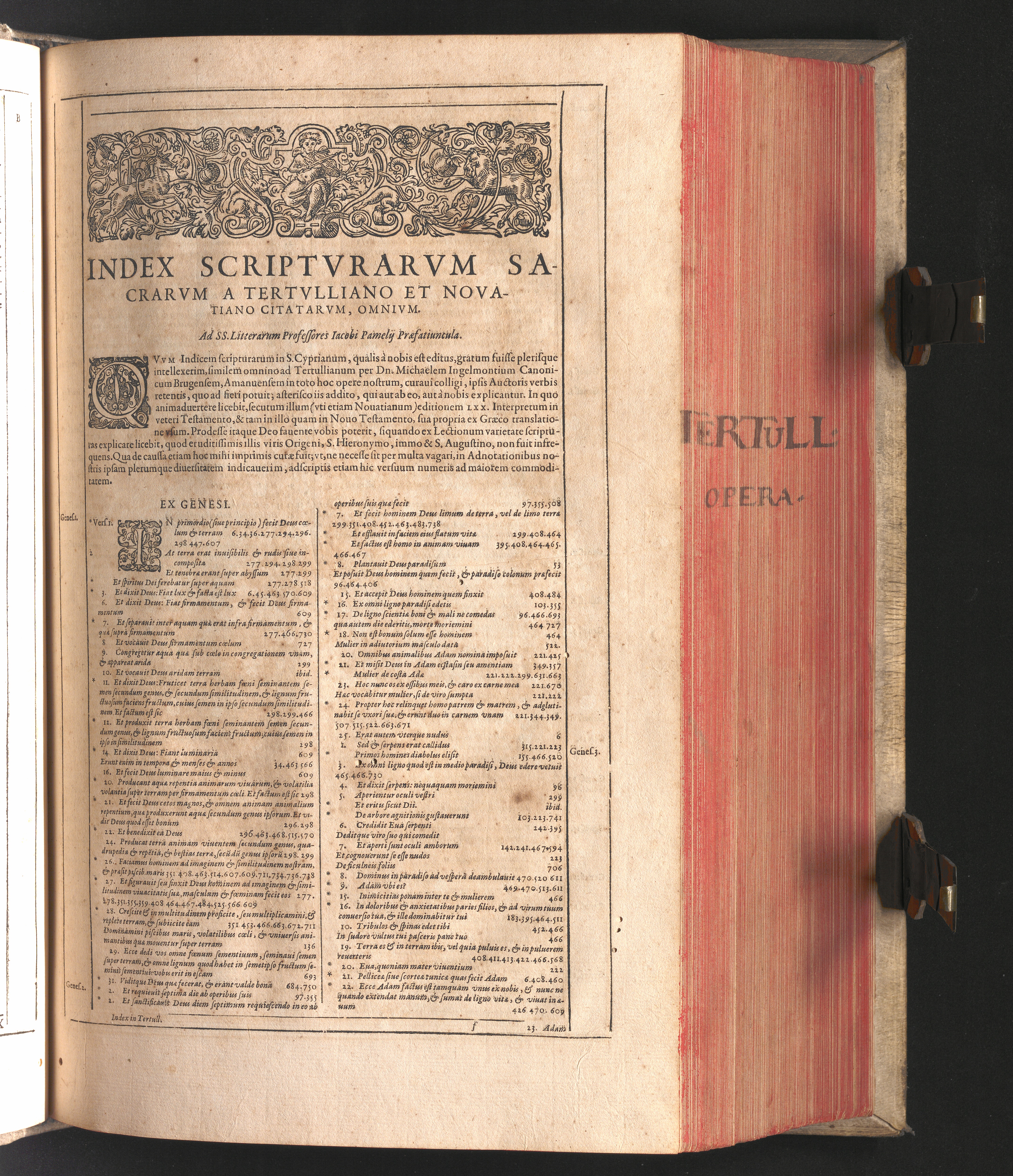 Q. Septimii Florentis Tertvlliani Carthaginiensis Presbyteri, Opera Qvæ Hactenvs Reperiri Potvervnt Omnia : Iam Postremvm, Ad Exemplaria manuscripta collatione facta, quàm accuratiss. recognita, aliquot etiam libris auctiora; nunc primùm in capita, & certo ordine, habita quantum fieri potuit temporum ratione, in quinque Tomos distincta / Cum Iacobi Pamelii Brvgensis, Theologi, Archidiaconi Audomaropolitani, Argumentis & Adnotationibus toti operi interiectis, quibus tum loci obscuriores explicantur, tum quicquid ad Antiquitatem Ecclesiasticam spectat, illustratur ... Acceßère & Loci ex coniectura Latini Latinii Viterbiensis restituti, & erudita in lib. de Pallio Joannis Mercerii Antecessoris Bituricensis Commentaria