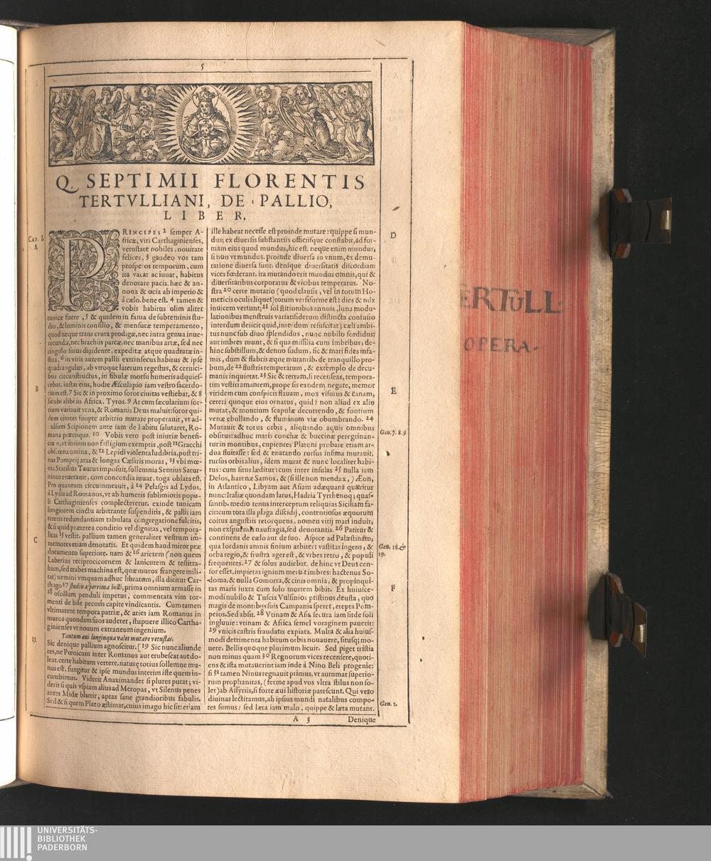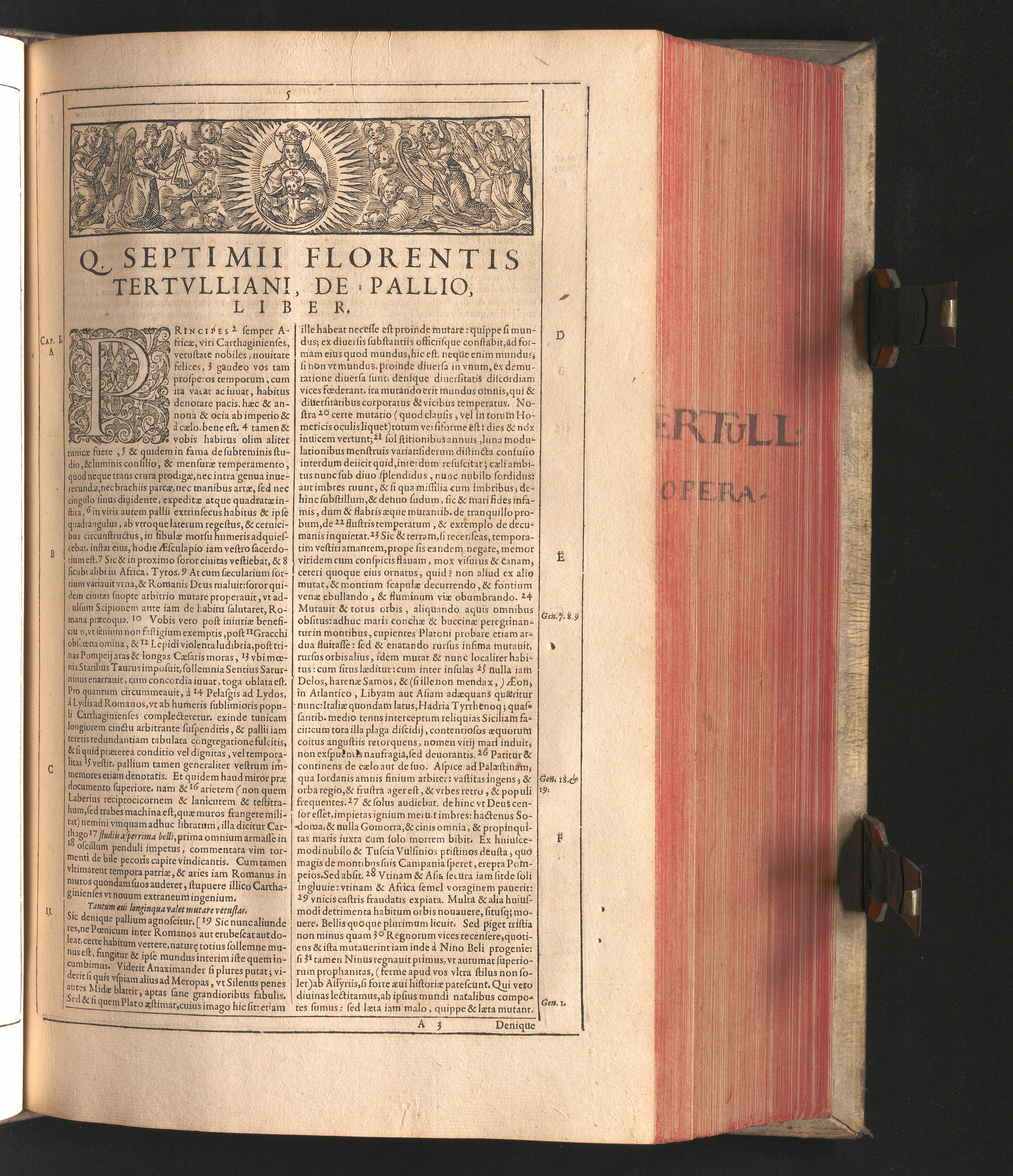 Q. Septimii Florentis Tertvlliani Carthaginiensis Presbyteri, Opera Qvæ Hactenvs Reperiri Potvervnt Omnia : Iam Postremvm, Ad Exemplaria manuscripta collatione facta, quàm accuratiss. recognita, aliquot etiam libris auctiora; nunc primùm in capita, & certo ordine, habita quantum fieri potuit temporum ratione, in quinque Tomos distincta / Cum Iacobi Pamelii Brvgensis, Theologi, Archidiaconi Audomaropolitani, Argumentis & Adnotationibus toti operi interiectis, quibus tum loci obscuriores explicantur, tum quicquid ad Antiquitatem Ecclesiasticam spectat, illustratur ... Acceßère & Loci ex coniectura Latini Latinii Viterbiensis restituti, & erudita in lib. de Pallio Joannis Mercerii Antecessoris Bituricensis Commentaria