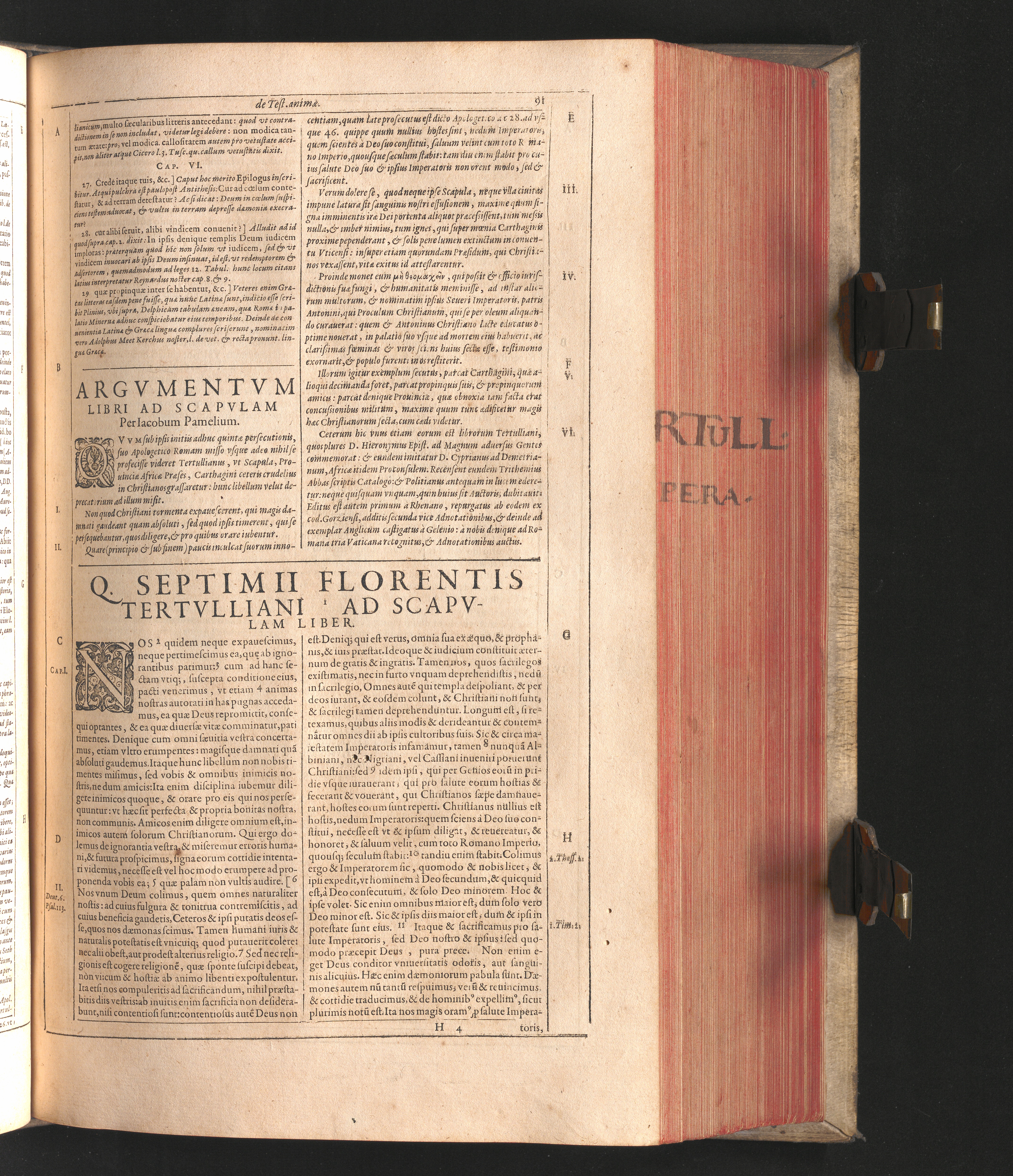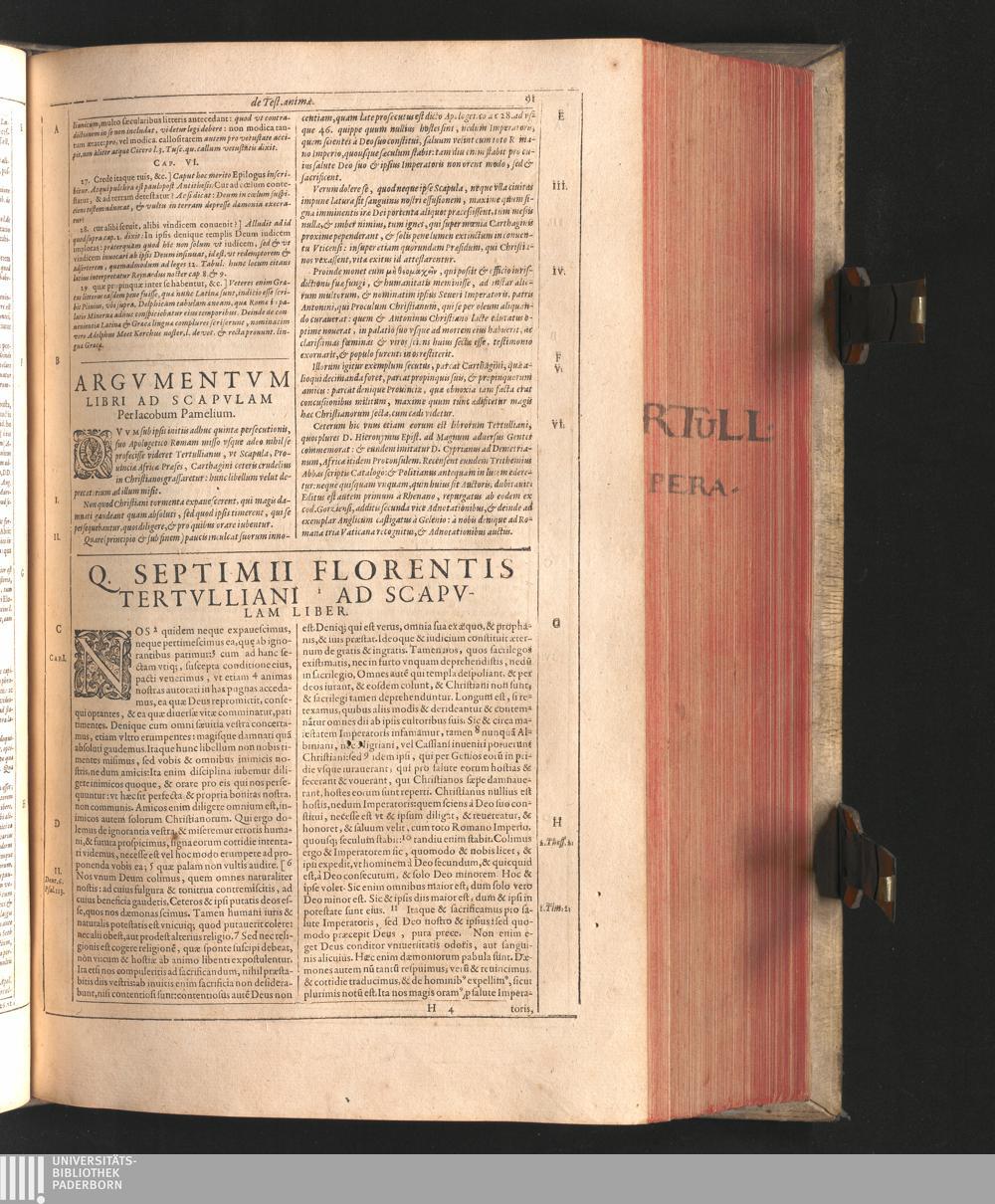 Q. Septimii Florentis Tertvlliani Carthaginiensis Presbyteri, Opera Qvæ Hactenvs Reperiri Potvervnt Omnia : Iam Postremvm, Ad Exemplaria manuscripta collatione facta, quàm accuratiss. recognita, aliquot etiam libris auctiora; nunc primùm in capita, & certo ordine, habita quantum fieri potuit temporum ratione, in quinque Tomos distincta / Cum Iacobi Pamelii Brvgensis, Theologi, Archidiaconi Audomaropolitani, Argumentis & Adnotationibus toti operi interiectis, quibus tum loci obscuriores explicantur, tum quicquid ad Antiquitatem Ecclesiasticam spectat, illustratur ... Acceßère & Loci ex coniectura Latini Latinii Viterbiensis restituti, & erudita in lib. de Pallio Joannis Mercerii Antecessoris Bituricensis Commentaria