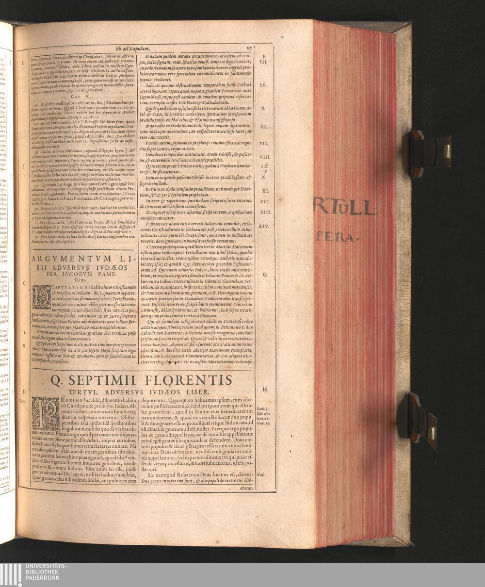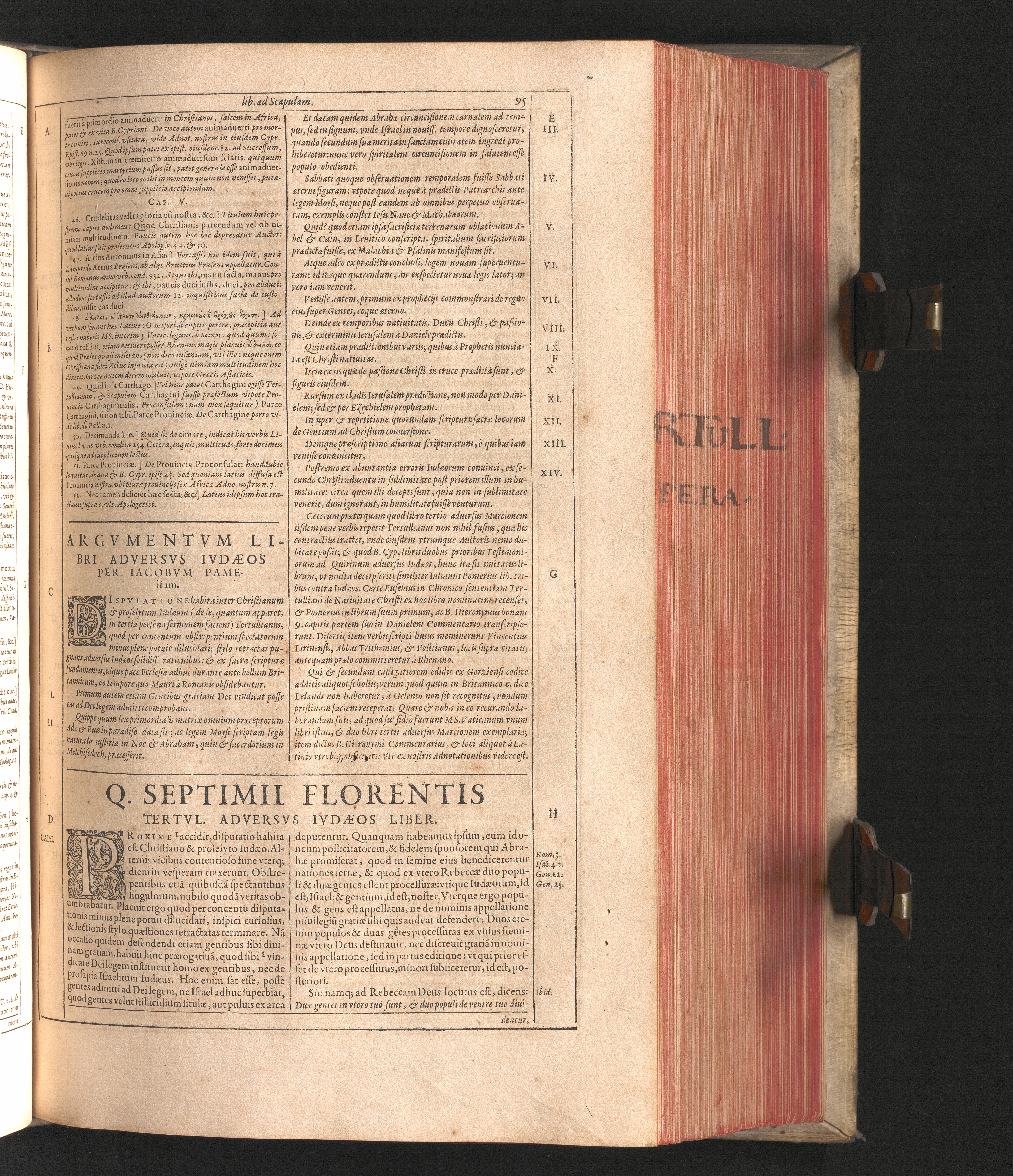 Q. Septimii Florentis Tertvlliani Carthaginiensis Presbyteri, Opera Qvæ Hactenvs Reperiri Potvervnt Omnia : Iam Postremvm, Ad Exemplaria manuscripta collatione facta, quàm accuratiss. recognita, aliquot etiam libris auctiora; nunc primùm in capita, & certo ordine, habita quantum fieri potuit temporum ratione, in quinque Tomos distincta / Cum Iacobi Pamelii Brvgensis, Theologi, Archidiaconi Audomaropolitani, Argumentis & Adnotationibus toti operi interiectis, quibus tum loci obscuriores explicantur, tum quicquid ad Antiquitatem Ecclesiasticam spectat, illustratur ... Acceßère & Loci ex coniectura Latini Latinii Viterbiensis restituti, & erudita in lib. de Pallio Joannis Mercerii Antecessoris Bituricensis Commentaria