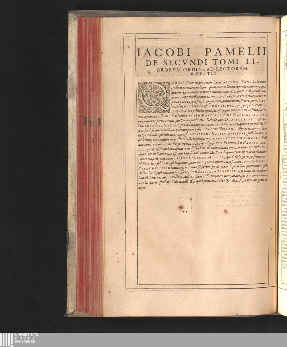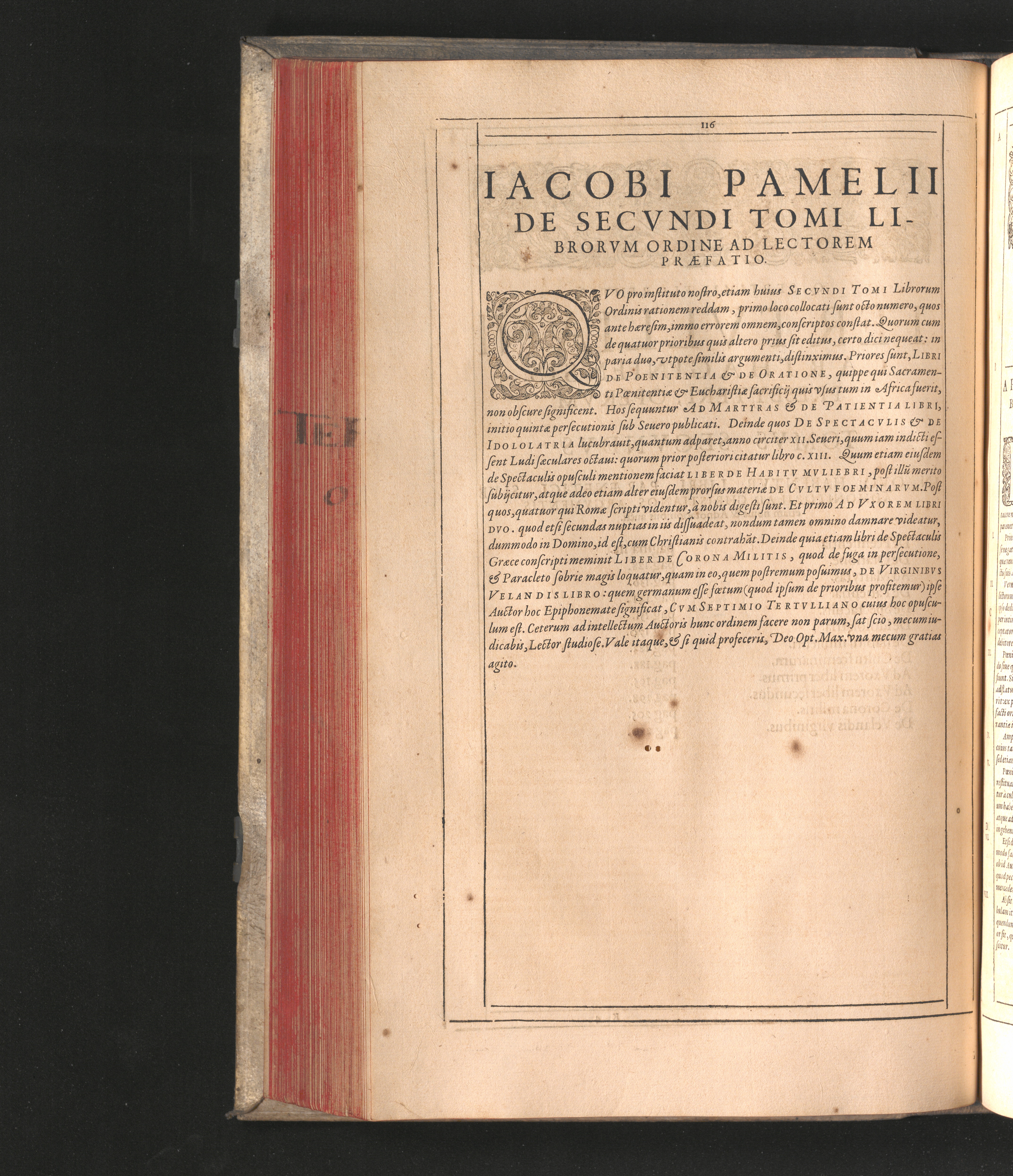Q. Septimii Florentis Tertvlliani Carthaginiensis Presbyteri, Opera Qvæ Hactenvs Reperiri Potvervnt Omnia : Iam Postremvm, Ad Exemplaria manuscripta collatione facta, quàm accuratiss. recognita, aliquot etiam libris auctiora; nunc primùm in capita, & certo ordine, habita quantum fieri potuit temporum ratione, in quinque Tomos distincta / Cum Iacobi Pamelii Brvgensis, Theologi, Archidiaconi Audomaropolitani, Argumentis & Adnotationibus toti operi interiectis, quibus tum loci obscuriores explicantur, tum quicquid ad Antiquitatem Ecclesiasticam spectat, illustratur ... Acceßère & Loci ex coniectura Latini Latinii Viterbiensis restituti, & erudita in lib. de Pallio Joannis Mercerii Antecessoris Bituricensis Commentaria
