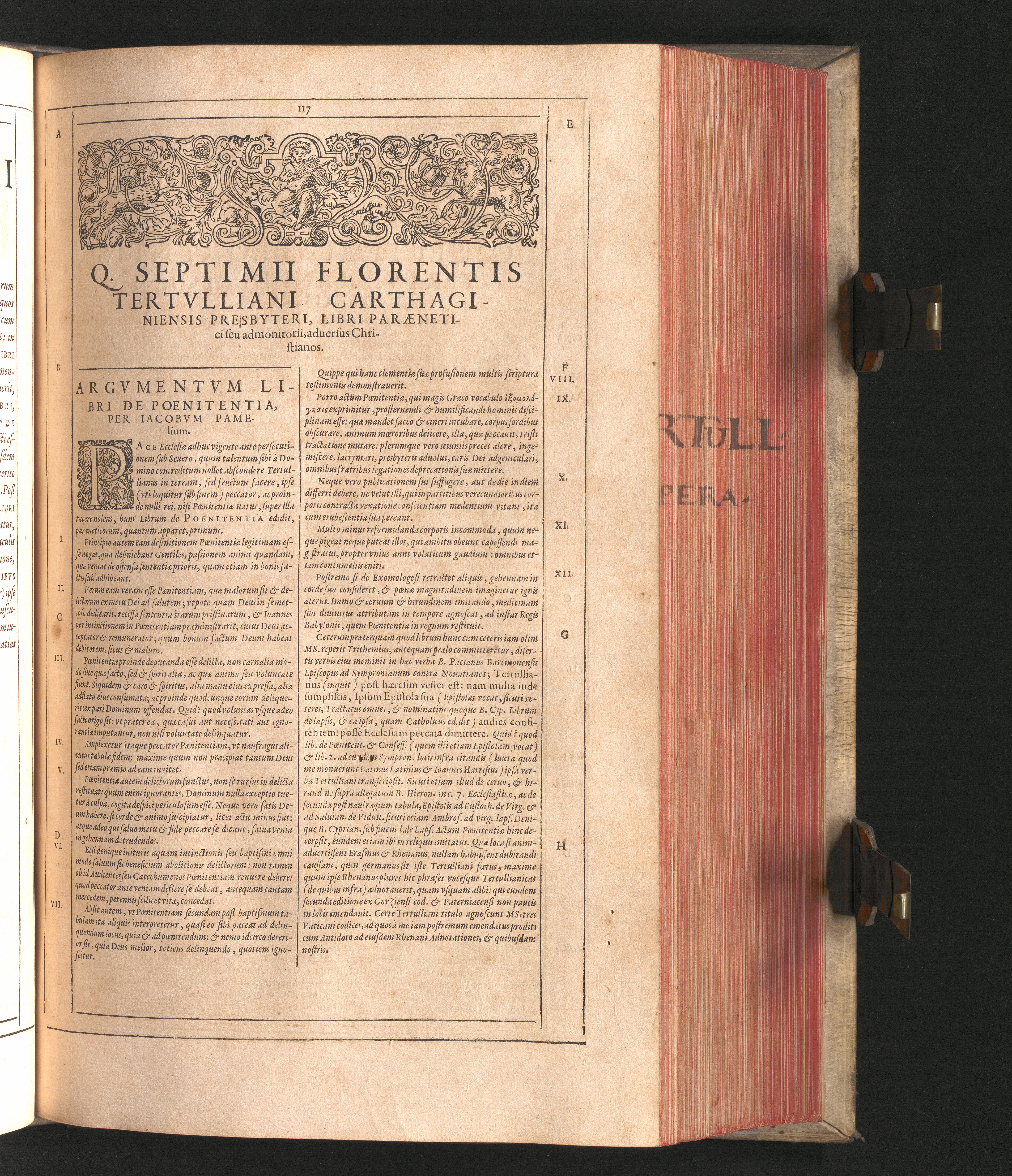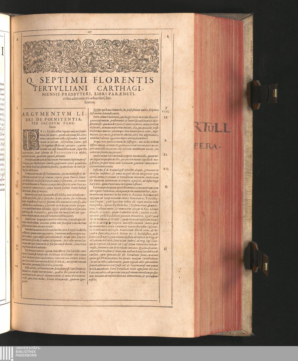 Q. Septimii Florentis Tertvlliani Carthaginiensis Presbyteri, Opera Qvæ Hactenvs Reperiri Potvervnt Omnia : Iam Postremvm, Ad Exemplaria manuscripta collatione facta, quàm accuratiss. recognita, aliquot etiam libris auctiora; nunc primùm in capita, & certo ordine, habita quantum fieri potuit temporum ratione, in quinque Tomos distincta / Cum Iacobi Pamelii Brvgensis, Theologi, Archidiaconi Audomaropolitani, Argumentis & Adnotationibus toti operi interiectis, quibus tum loci obscuriores explicantur, tum quicquid ad Antiquitatem Ecclesiasticam spectat, illustratur ... Acceßère & Loci ex coniectura Latini Latinii Viterbiensis restituti, & erudita in lib. de Pallio Joannis Mercerii Antecessoris Bituricensis Commentaria