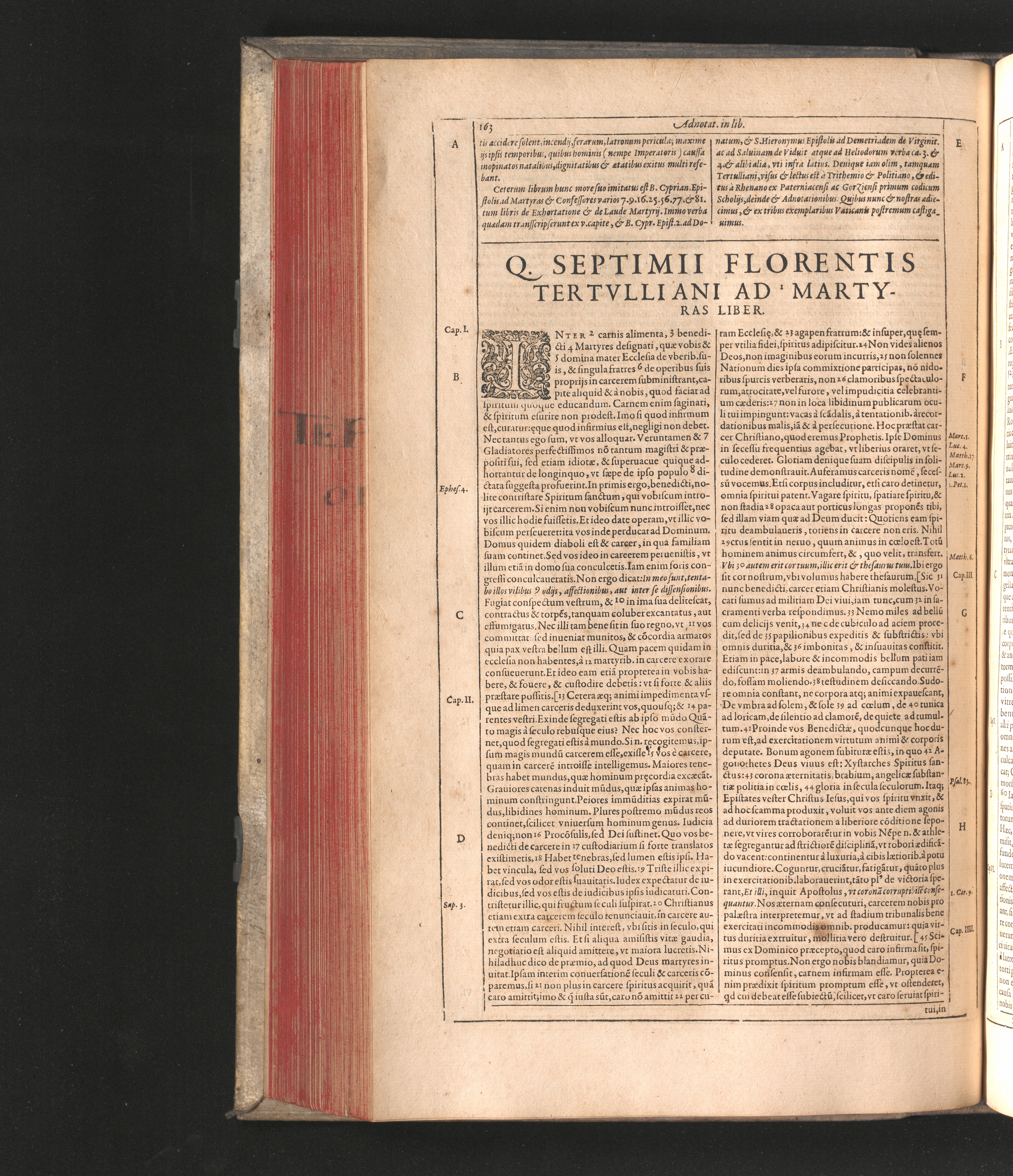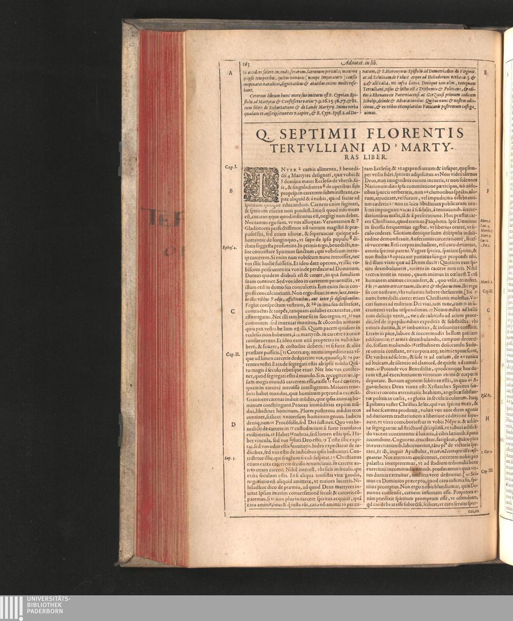 Q. Septimii Florentis Tertvlliani Carthaginiensis Presbyteri, Opera Qvæ Hactenvs Reperiri Potvervnt Omnia : Iam Postremvm, Ad Exemplaria manuscripta collatione facta, quàm accuratiss. recognita, aliquot etiam libris auctiora; nunc primùm in capita, & certo ordine, habita quantum fieri potuit temporum ratione, in quinque Tomos distincta / Cum Iacobi Pamelii Brvgensis, Theologi, Archidiaconi Audomaropolitani, Argumentis & Adnotationibus toti operi interiectis, quibus tum loci obscuriores explicantur, tum quicquid ad Antiquitatem Ecclesiasticam spectat, illustratur ... Acceßère & Loci ex coniectura Latini Latinii Viterbiensis restituti, & erudita in lib. de Pallio Joannis Mercerii Antecessoris Bituricensis Commentaria