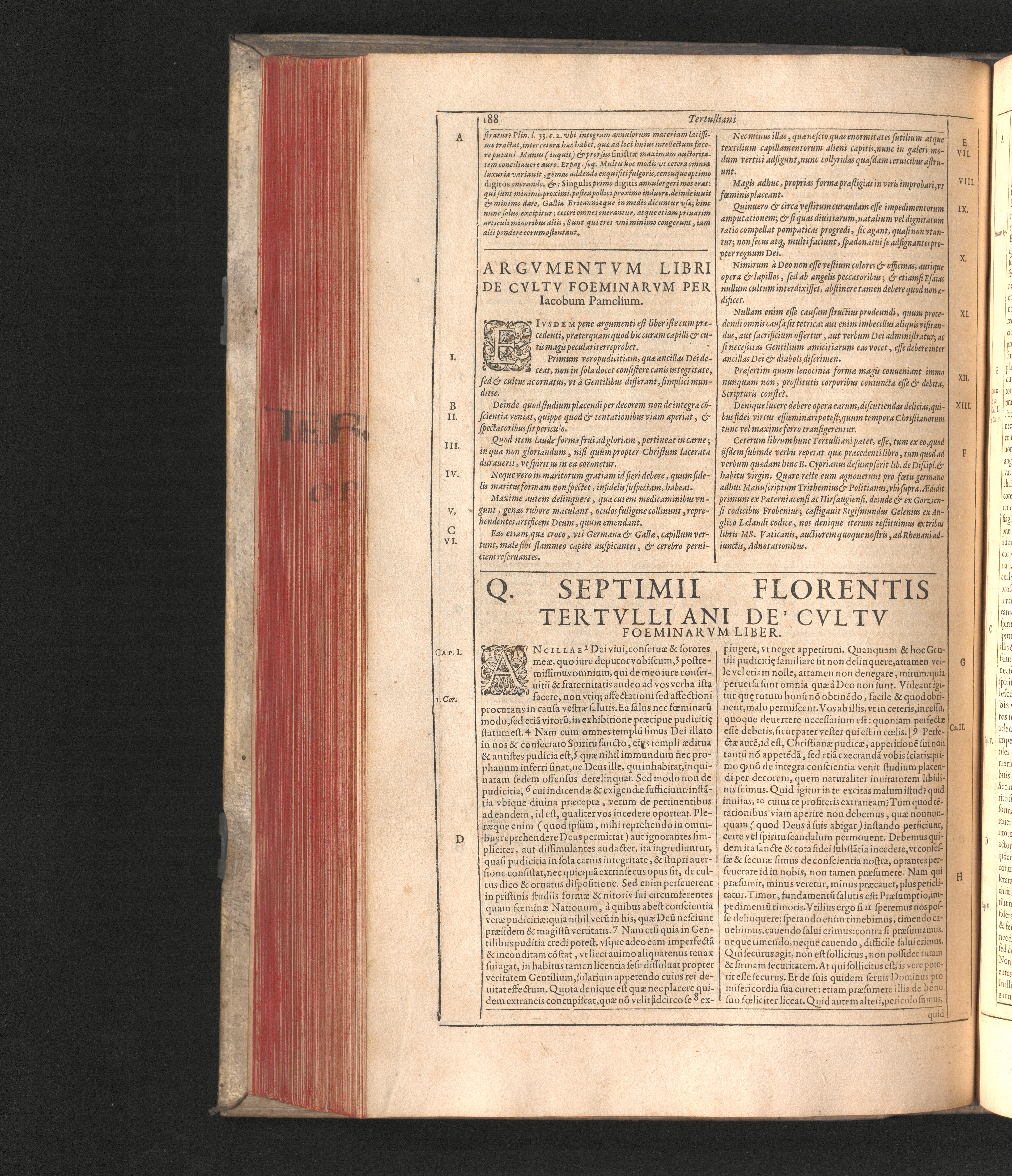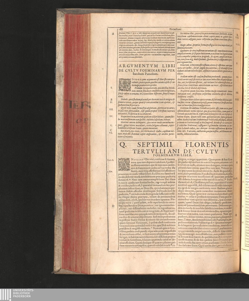 Q. Septimii Florentis Tertvlliani Carthaginiensis Presbyteri, Opera Qvæ Hactenvs Reperiri Potvervnt Omnia : Iam Postremvm, Ad Exemplaria manuscripta collatione facta, quàm accuratiss. recognita, aliquot etiam libris auctiora; nunc primùm in capita, & certo ordine, habita quantum fieri potuit temporum ratione, in quinque Tomos distincta / Cum Iacobi Pamelii Brvgensis, Theologi, Archidiaconi Audomaropolitani, Argumentis & Adnotationibus toti operi interiectis, quibus tum loci obscuriores explicantur, tum quicquid ad Antiquitatem Ecclesiasticam spectat, illustratur ... Acceßère & Loci ex coniectura Latini Latinii Viterbiensis restituti, & erudita in lib. de Pallio Joannis Mercerii Antecessoris Bituricensis Commentaria