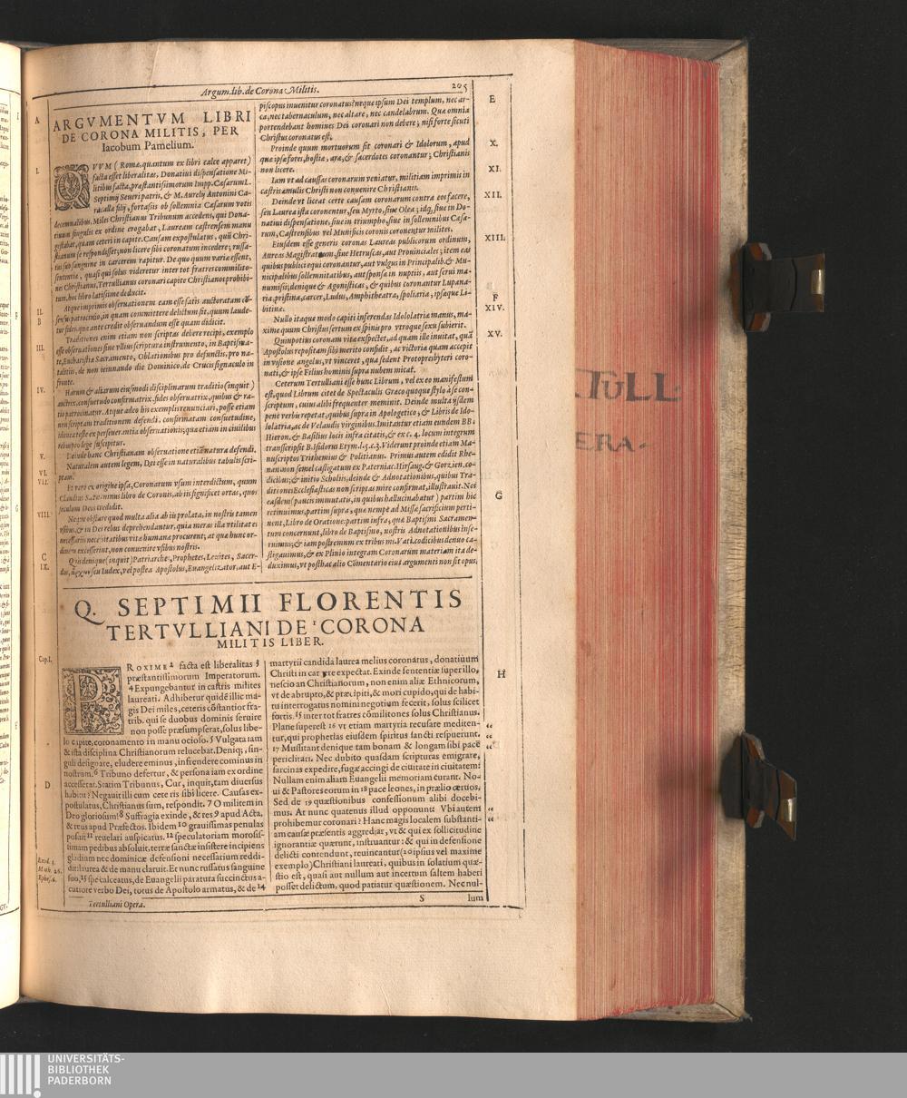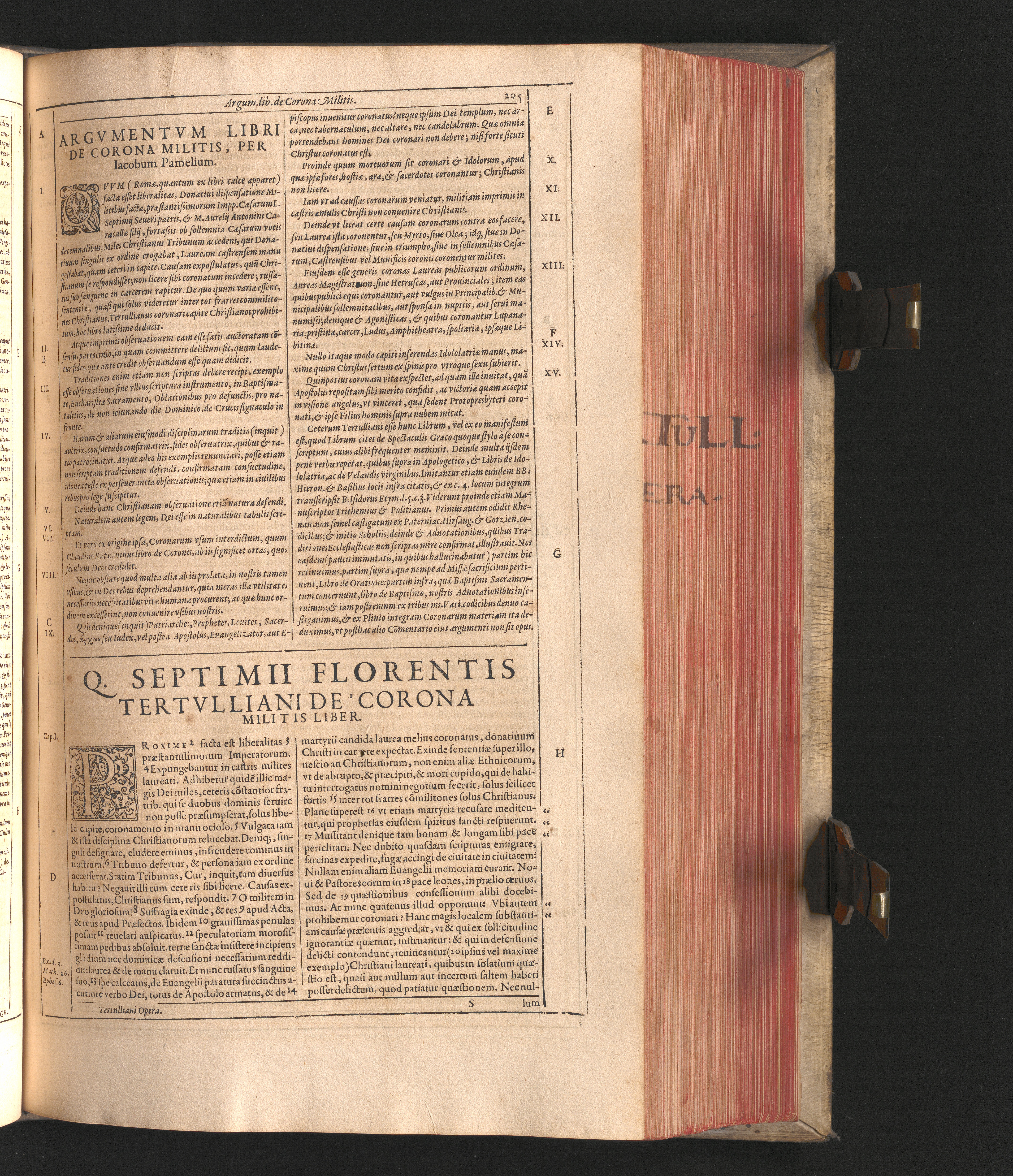 Q. Septimii Florentis Tertvlliani Carthaginiensis Presbyteri, Opera Qvæ Hactenvs Reperiri Potvervnt Omnia : Iam Postremvm, Ad Exemplaria manuscripta collatione facta, quàm accuratiss. recognita, aliquot etiam libris auctiora; nunc primùm in capita, & certo ordine, habita quantum fieri potuit temporum ratione, in quinque Tomos distincta / Cum Iacobi Pamelii Brvgensis, Theologi, Archidiaconi Audomaropolitani, Argumentis & Adnotationibus toti operi interiectis, quibus tum loci obscuriores explicantur, tum quicquid ad Antiquitatem Ecclesiasticam spectat, illustratur ... Acceßère & Loci ex coniectura Latini Latinii Viterbiensis restituti, & erudita in lib. de Pallio Joannis Mercerii Antecessoris Bituricensis Commentaria