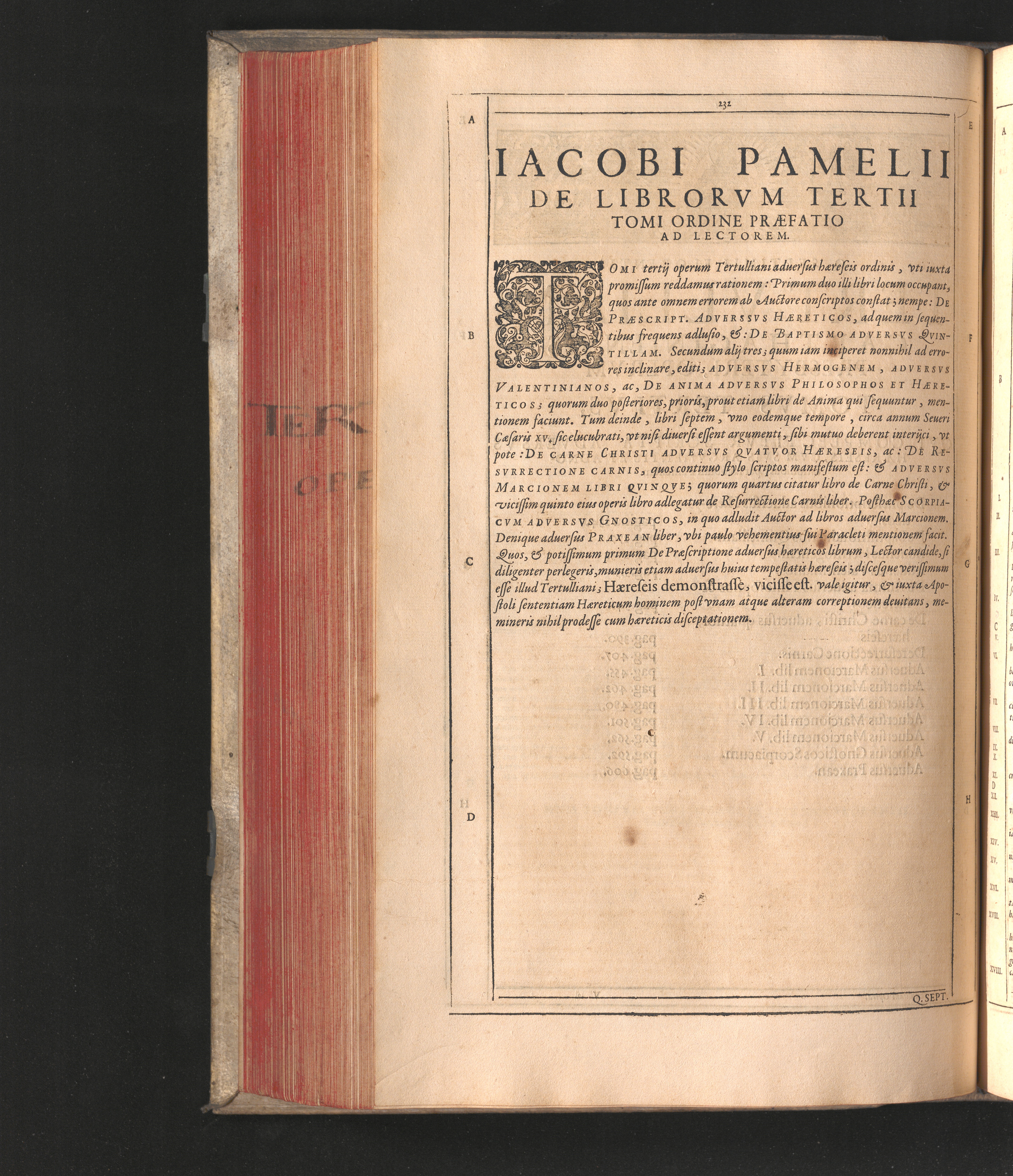 Q. Septimii Florentis Tertvlliani Carthaginiensis Presbyteri, Opera Qvæ Hactenvs Reperiri Potvervnt Omnia : Iam Postremvm, Ad Exemplaria manuscripta collatione facta, quàm accuratiss. recognita, aliquot etiam libris auctiora; nunc primùm in capita, & certo ordine, habita quantum fieri potuit temporum ratione, in quinque Tomos distincta / Cum Iacobi Pamelii Brvgensis, Theologi, Archidiaconi Audomaropolitani, Argumentis & Adnotationibus toti operi interiectis, quibus tum loci obscuriores explicantur, tum quicquid ad Antiquitatem Ecclesiasticam spectat, illustratur ... Acceßère & Loci ex coniectura Latini Latinii Viterbiensis restituti, & erudita in lib. de Pallio Joannis Mercerii Antecessoris Bituricensis Commentaria
