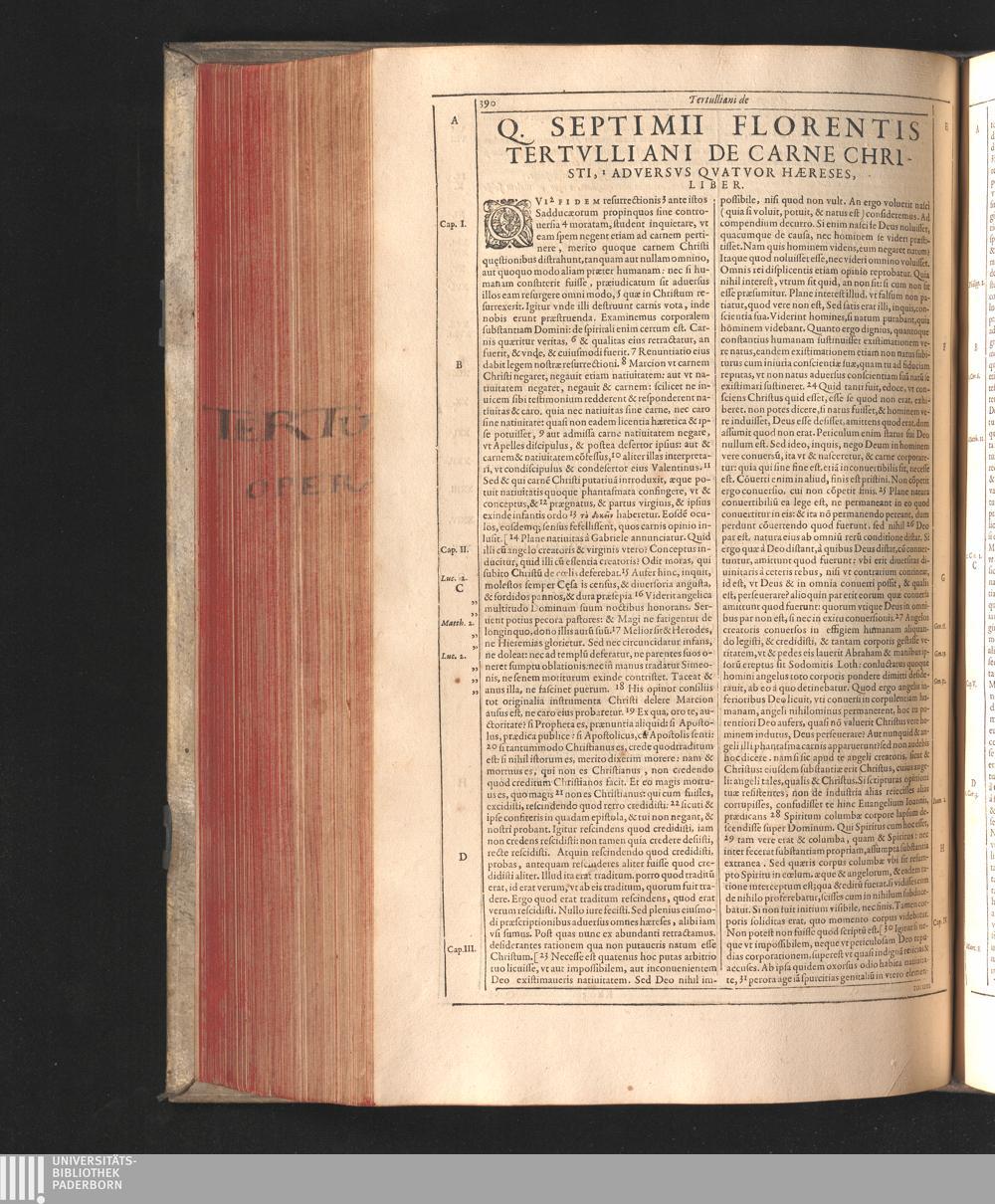 Q. Septimii Florentis Tertvlliani Carthaginiensis Presbyteri, Opera Qvæ Hactenvs Reperiri Potvervnt Omnia : Iam Postremvm, Ad Exemplaria manuscripta collatione facta, quàm accuratiss. recognita, aliquot etiam libris auctiora; nunc primùm in capita, & certo ordine, habita quantum fieri potuit temporum ratione, in quinque Tomos distincta / Cum Iacobi Pamelii Brvgensis, Theologi, Archidiaconi Audomaropolitani, Argumentis & Adnotationibus toti operi interiectis, quibus tum loci obscuriores explicantur, tum quicquid ad Antiquitatem Ecclesiasticam spectat, illustratur ... Acceßère & Loci ex coniectura Latini Latinii Viterbiensis restituti, & erudita in lib. de Pallio Joannis Mercerii Antecessoris Bituricensis Commentaria