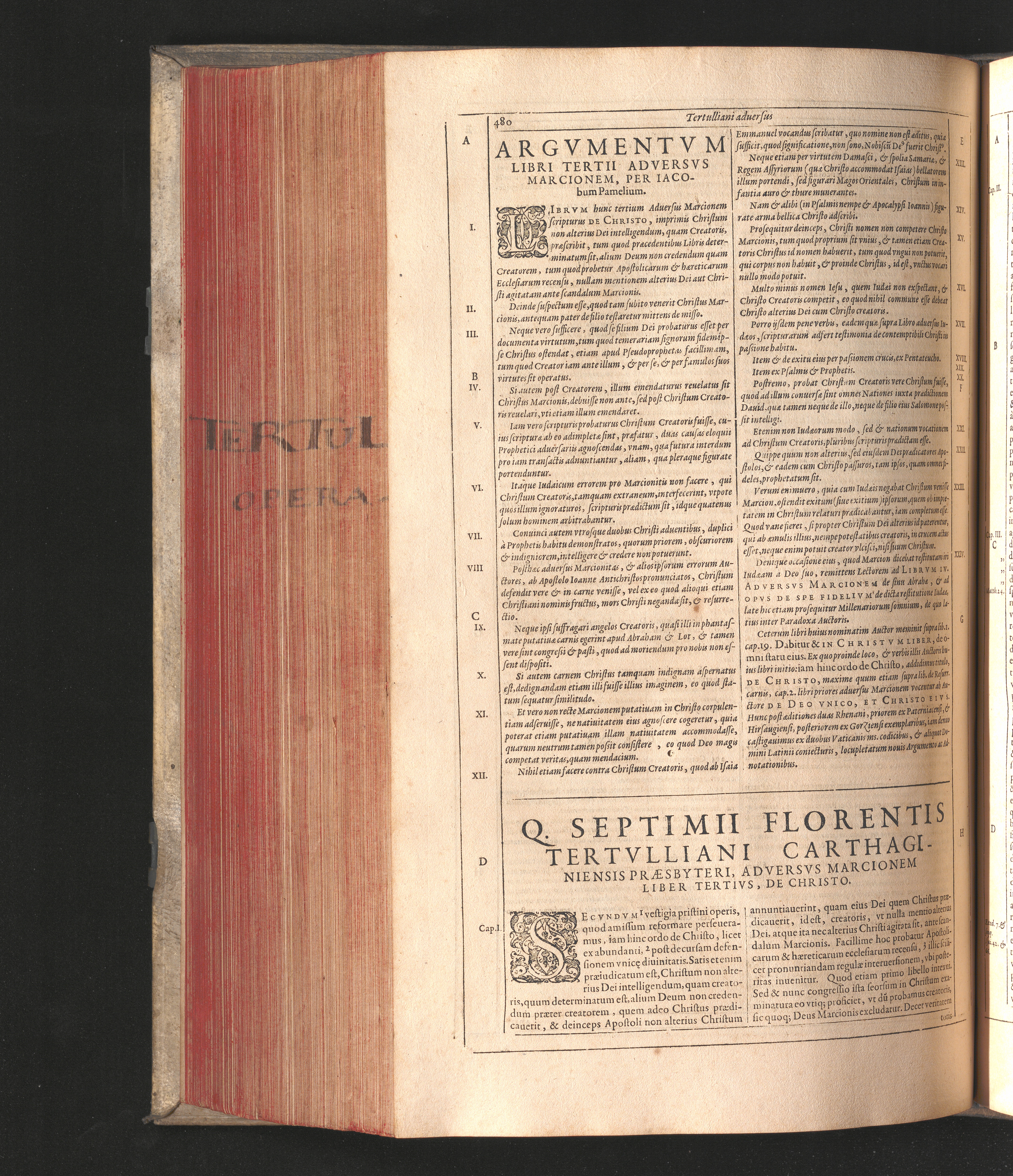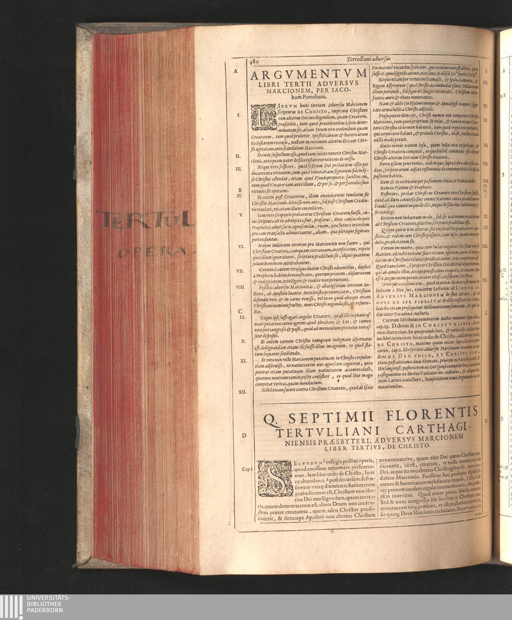 Q. Septimii Florentis Tertvlliani Carthaginiensis Presbyteri, Opera Qvæ Hactenvs Reperiri Potvervnt Omnia : Iam Postremvm, Ad Exemplaria manuscripta collatione facta, quàm accuratiss. recognita, aliquot etiam libris auctiora; nunc primùm in capita, & certo ordine, habita quantum fieri potuit temporum ratione, in quinque Tomos distincta / Cum Iacobi Pamelii Brvgensis, Theologi, Archidiaconi Audomaropolitani, Argumentis & Adnotationibus toti operi interiectis, quibus tum loci obscuriores explicantur, tum quicquid ad Antiquitatem Ecclesiasticam spectat, illustratur ... Acceßère & Loci ex coniectura Latini Latinii Viterbiensis restituti, & erudita in lib. de Pallio Joannis Mercerii Antecessoris Bituricensis Commentaria