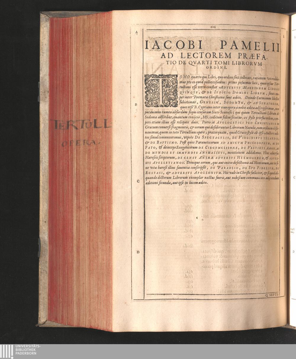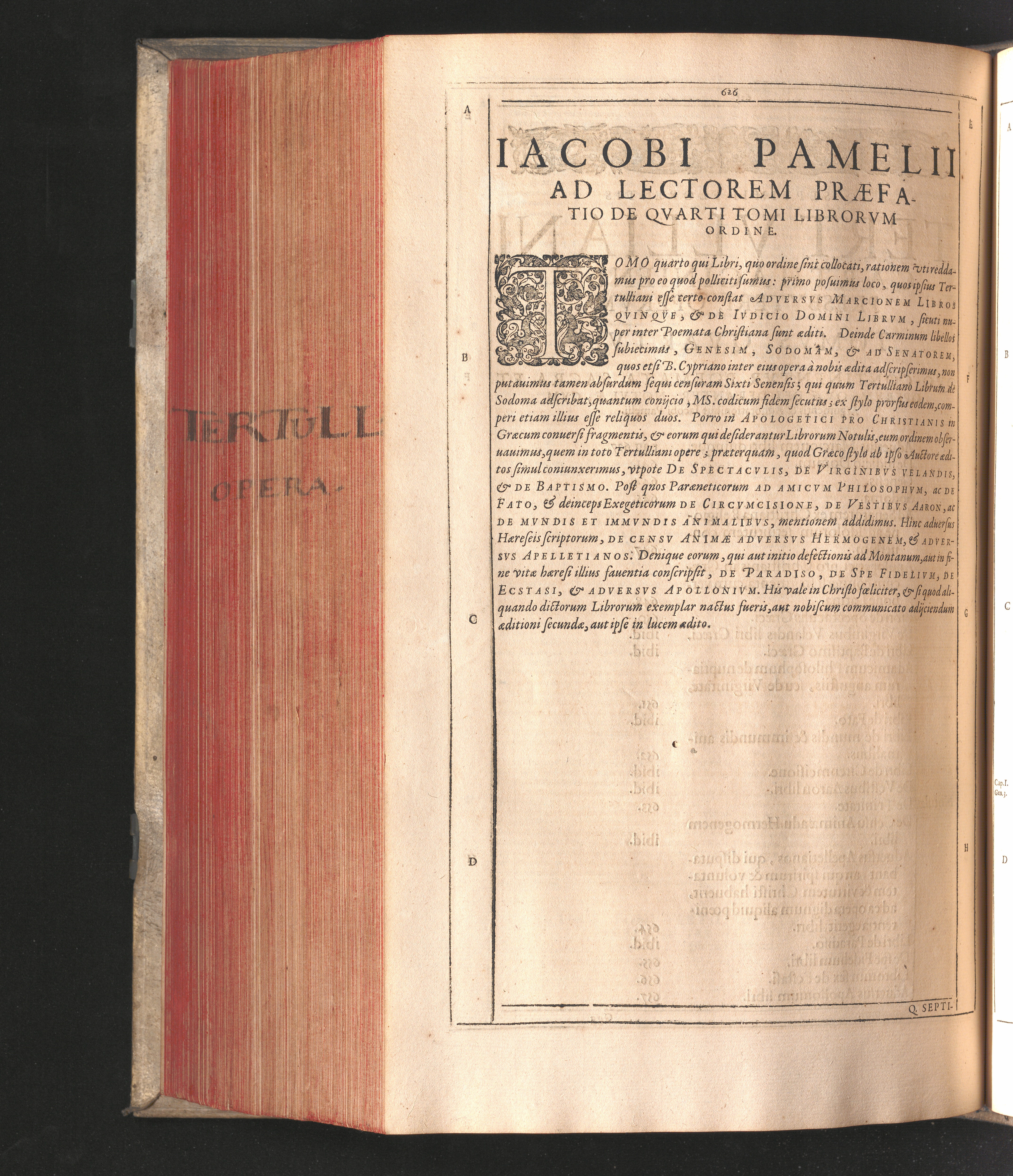 Q. Septimii Florentis Tertvlliani Carthaginiensis Presbyteri, Opera Qvæ Hactenvs Reperiri Potvervnt Omnia : Iam Postremvm, Ad Exemplaria manuscripta collatione facta, quàm accuratiss. recognita, aliquot etiam libris auctiora; nunc primùm in capita, & certo ordine, habita quantum fieri potuit temporum ratione, in quinque Tomos distincta / Cum Iacobi Pamelii Brvgensis, Theologi, Archidiaconi Audomaropolitani, Argumentis & Adnotationibus toti operi interiectis, quibus tum loci obscuriores explicantur, tum quicquid ad Antiquitatem Ecclesiasticam spectat, illustratur ... Acceßère & Loci ex coniectura Latini Latinii Viterbiensis restituti, & erudita in lib. de Pallio Joannis Mercerii Antecessoris Bituricensis Commentaria