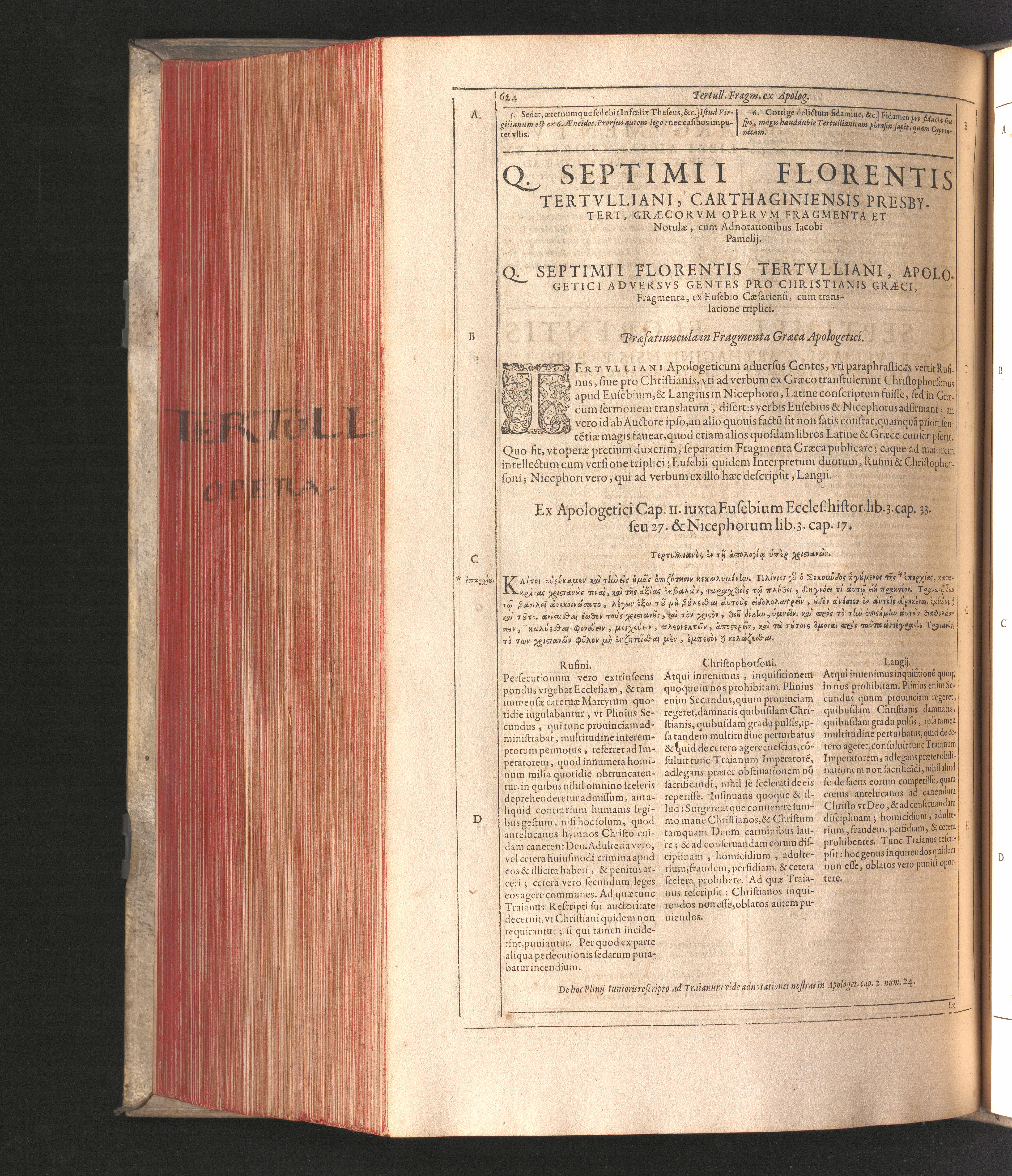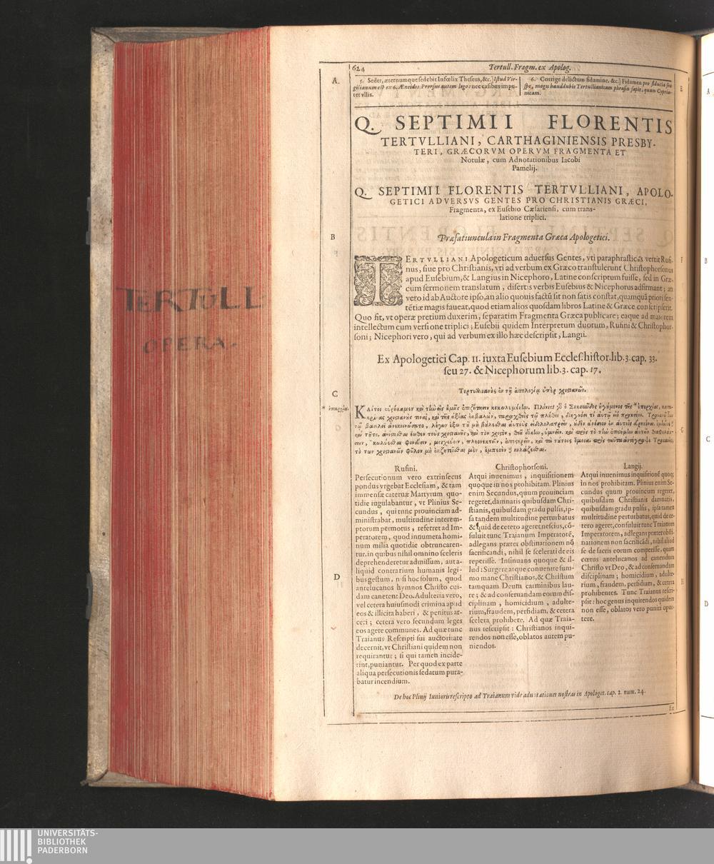 Q. Septimii Florentis Tertvlliani Carthaginiensis Presbyteri, Opera Qvæ Hactenvs Reperiri Potvervnt Omnia : Iam Postremvm, Ad Exemplaria manuscripta collatione facta, quàm accuratiss. recognita, aliquot etiam libris auctiora; nunc primùm in capita, & certo ordine, habita quantum fieri potuit temporum ratione, in quinque Tomos distincta / Cum Iacobi Pamelii Brvgensis, Theologi, Archidiaconi Audomaropolitani, Argumentis & Adnotationibus toti operi interiectis, quibus tum loci obscuriores explicantur, tum quicquid ad Antiquitatem Ecclesiasticam spectat, illustratur ... Acceßère & Loci ex coniectura Latini Latinii Viterbiensis restituti, & erudita in lib. de Pallio Joannis Mercerii Antecessoris Bituricensis Commentaria
