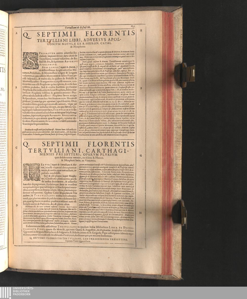 Q. Septimii Florentis Tertvlliani Carthaginiensis Presbyteri, Opera Qvæ Hactenvs Reperiri Potvervnt Omnia : Iam Postremvm, Ad Exemplaria manuscripta collatione facta, quàm accuratiss. recognita, aliquot etiam libris auctiora; nunc primùm in capita, & certo ordine, habita quantum fieri potuit temporum ratione, in quinque Tomos distincta / Cum Iacobi Pamelii Brvgensis, Theologi, Archidiaconi Audomaropolitani, Argumentis & Adnotationibus toti operi interiectis, quibus tum loci obscuriores explicantur, tum quicquid ad Antiquitatem Ecclesiasticam spectat, illustratur ... Acceßère & Loci ex coniectura Latini Latinii Viterbiensis restituti, & erudita in lib. de Pallio Joannis Mercerii Antecessoris Bituricensis Commentaria