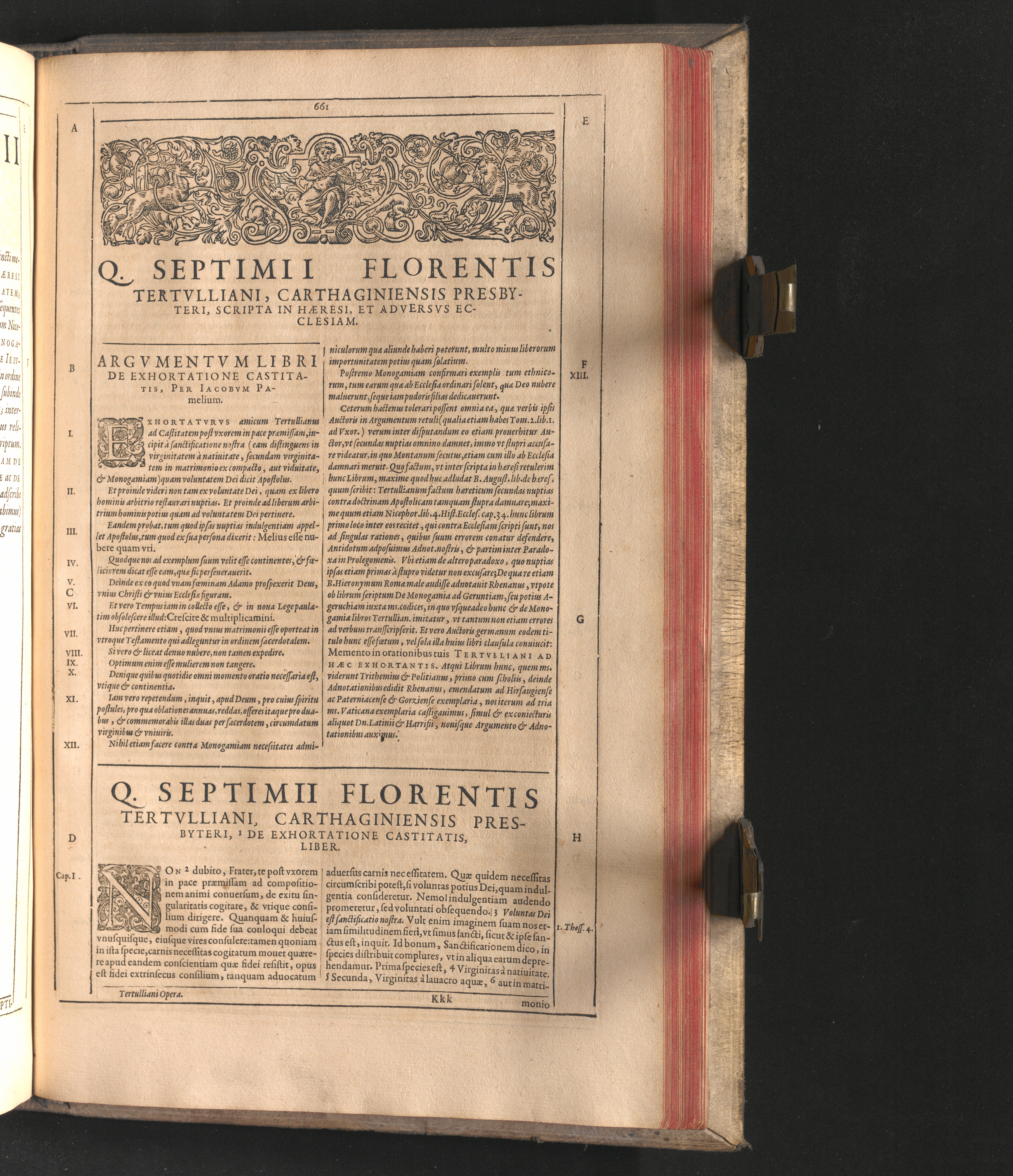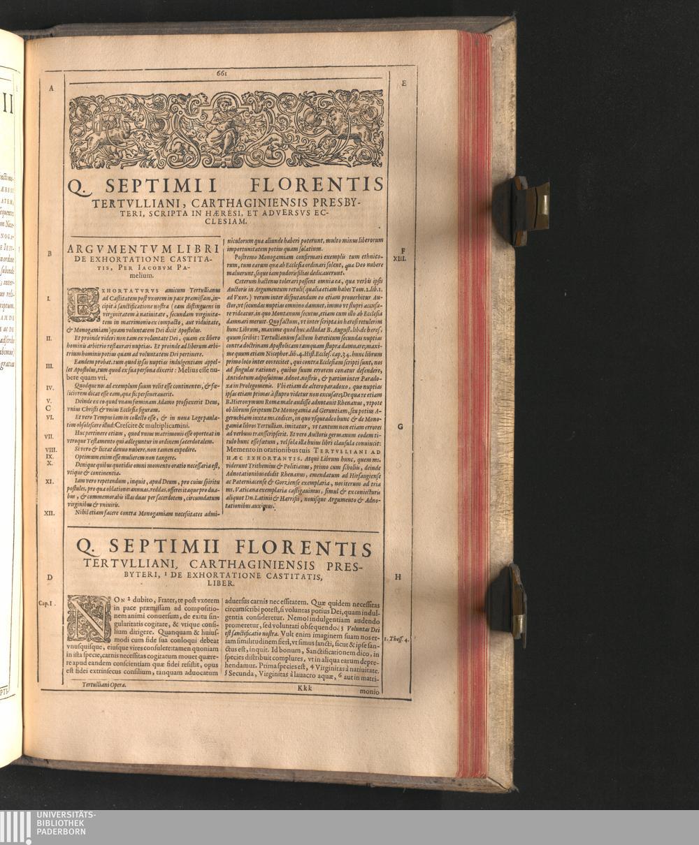 Q. Septimii Florentis Tertvlliani Carthaginiensis Presbyteri, Opera Qvæ Hactenvs Reperiri Potvervnt Omnia : Iam Postremvm, Ad Exemplaria manuscripta collatione facta, quàm accuratiss. recognita, aliquot etiam libris auctiora; nunc primùm in capita, & certo ordine, habita quantum fieri potuit temporum ratione, in quinque Tomos distincta / Cum Iacobi Pamelii Brvgensis, Theologi, Archidiaconi Audomaropolitani, Argumentis & Adnotationibus toti operi interiectis, quibus tum loci obscuriores explicantur, tum quicquid ad Antiquitatem Ecclesiasticam spectat, illustratur ... Acceßère & Loci ex coniectura Latini Latinii Viterbiensis restituti, & erudita in lib. de Pallio Joannis Mercerii Antecessoris Bituricensis Commentaria