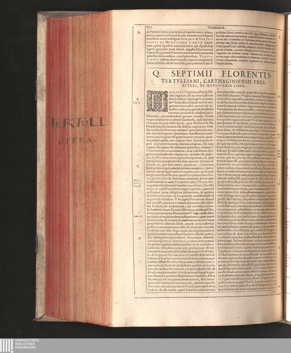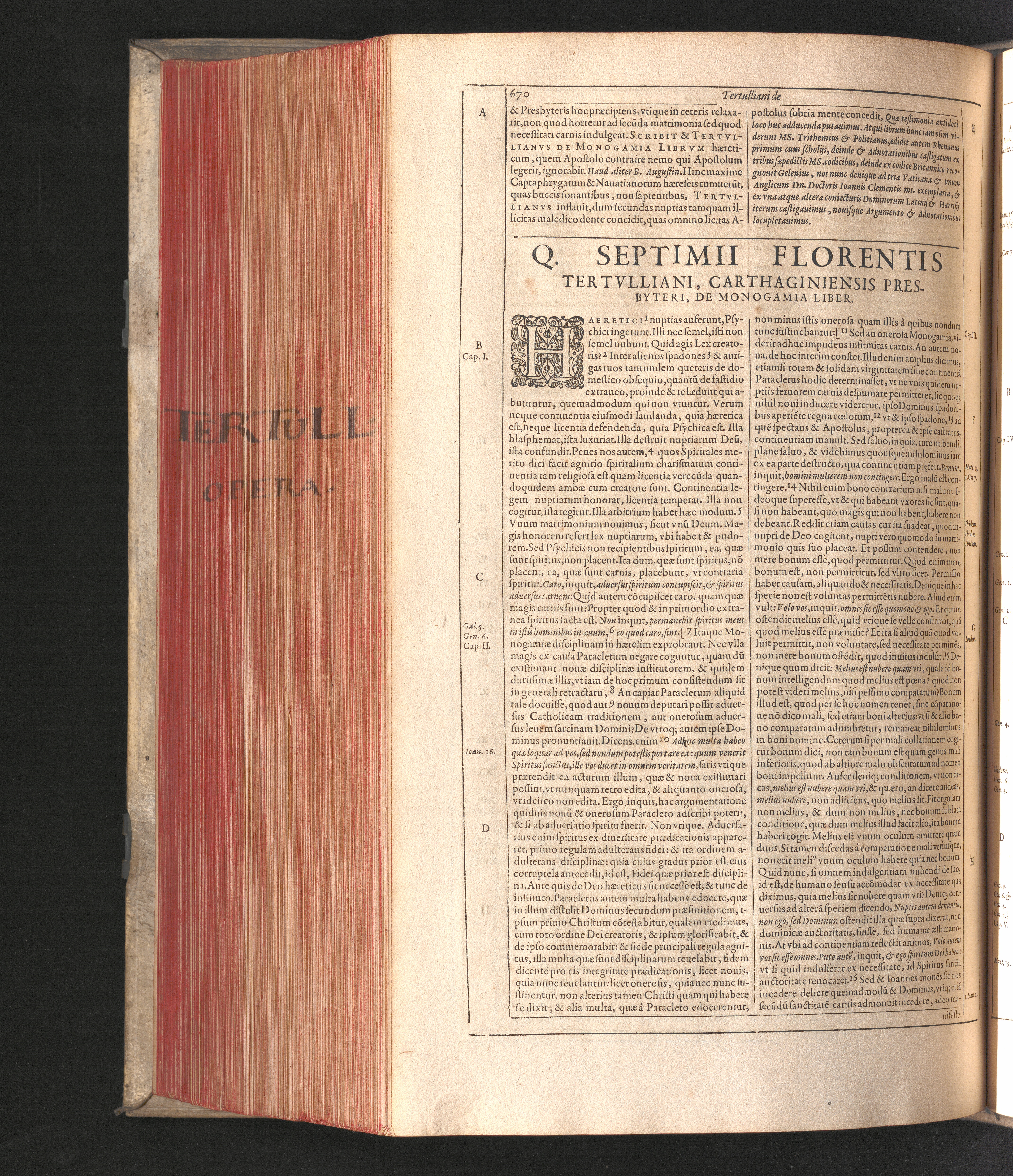 Q. Septimii Florentis Tertvlliani Carthaginiensis Presbyteri, Opera Qvæ Hactenvs Reperiri Potvervnt Omnia : Iam Postremvm, Ad Exemplaria manuscripta collatione facta, quàm accuratiss. recognita, aliquot etiam libris auctiora; nunc primùm in capita, & certo ordine, habita quantum fieri potuit temporum ratione, in quinque Tomos distincta / Cum Iacobi Pamelii Brvgensis, Theologi, Archidiaconi Audomaropolitani, Argumentis & Adnotationibus toti operi interiectis, quibus tum loci obscuriores explicantur, tum quicquid ad Antiquitatem Ecclesiasticam spectat, illustratur ... Acceßère & Loci ex coniectura Latini Latinii Viterbiensis restituti, & erudita in lib. de Pallio Joannis Mercerii Antecessoris Bituricensis Commentaria