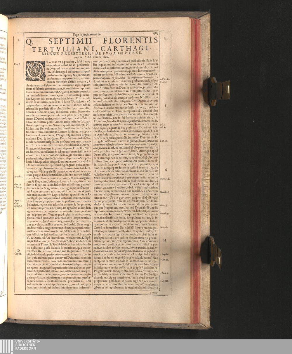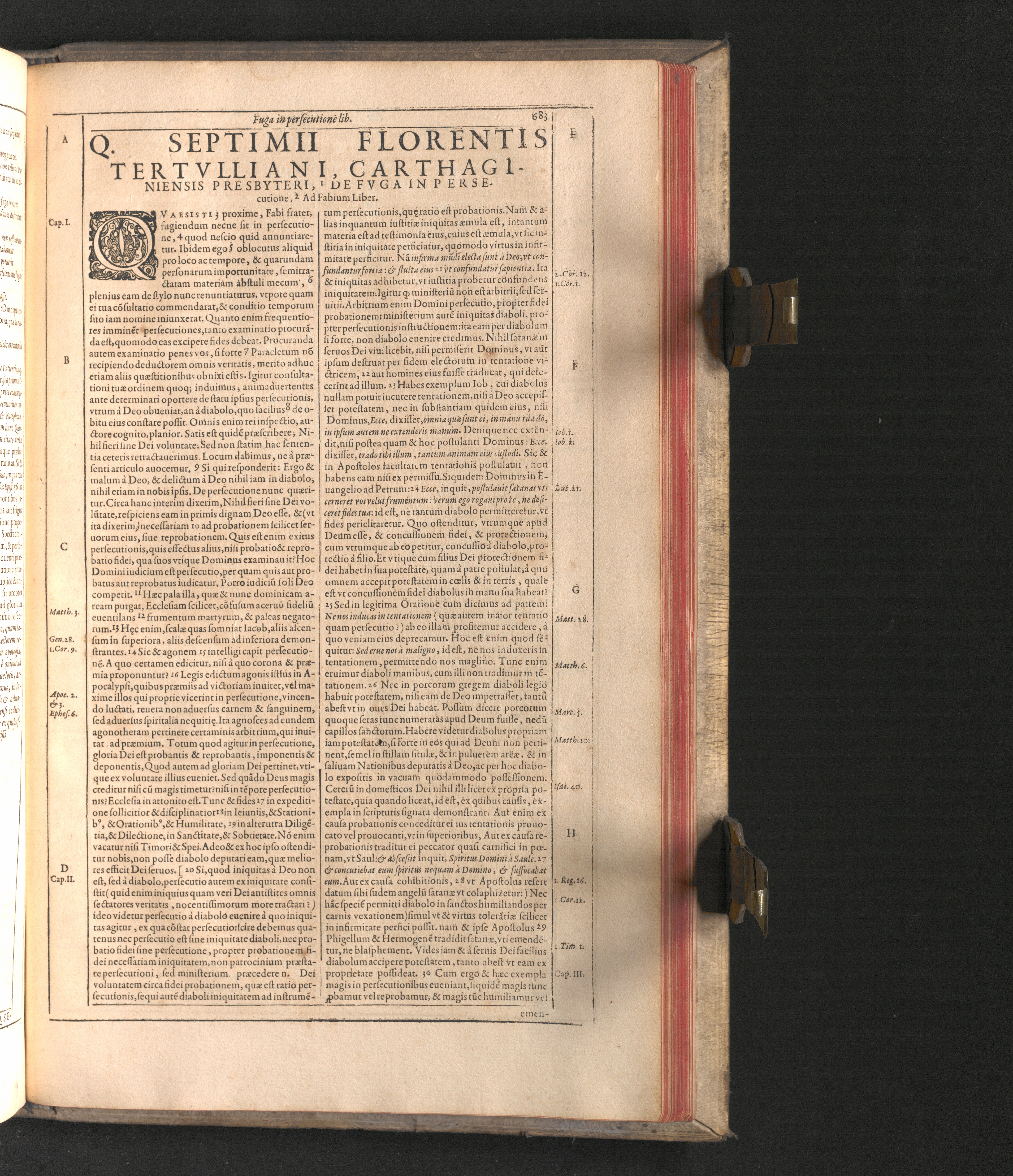 Q. Septimii Florentis Tertvlliani Carthaginiensis Presbyteri, Opera Qvæ Hactenvs Reperiri Potvervnt Omnia : Iam Postremvm, Ad Exemplaria manuscripta collatione facta, quàm accuratiss. recognita, aliquot etiam libris auctiora; nunc primùm in capita, & certo ordine, habita quantum fieri potuit temporum ratione, in quinque Tomos distincta / Cum Iacobi Pamelii Brvgensis, Theologi, Archidiaconi Audomaropolitani, Argumentis & Adnotationibus toti operi interiectis, quibus tum loci obscuriores explicantur, tum quicquid ad Antiquitatem Ecclesiasticam spectat, illustratur ... Acceßère & Loci ex coniectura Latini Latinii Viterbiensis restituti, & erudita in lib. de Pallio Joannis Mercerii Antecessoris Bituricensis Commentaria