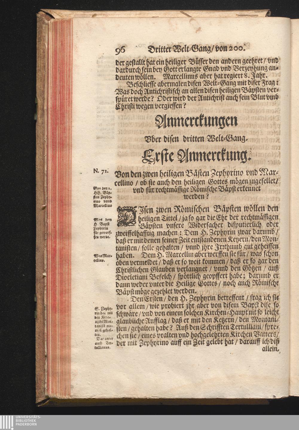 Roma Gloriosa, oder Das Glorwürdige Rom In seinen Zweyhundert Drey vnd Viertzig Bäpsten. Daß ist/ Römische Bäpst/ angefangen von S. Peter Biß auff den heutiges Tags glorwürdig regierenden vnseren Allerheiligsten Vatter Clemens Den Zehenden : Deren aller hart angefochtene Ehr vnd Ruhm/ neben erzehlung ihrer glorwürdigen Thaten/ in disem Tractat verfochten wird/ wider die grausame/ durchauß vngegründte vilfältige Schmach-Reden ihrer Feinden/ die auß disen wahrhafften Statthaltern Christi/ lauter Antichristen/ Zwar vergebens/ gantz lächerlich/ vnd vngeschickt wöllen machen ... / In Druck gegeben von Christophoro Ott Auß der Gesellschafft Jesu Priestern