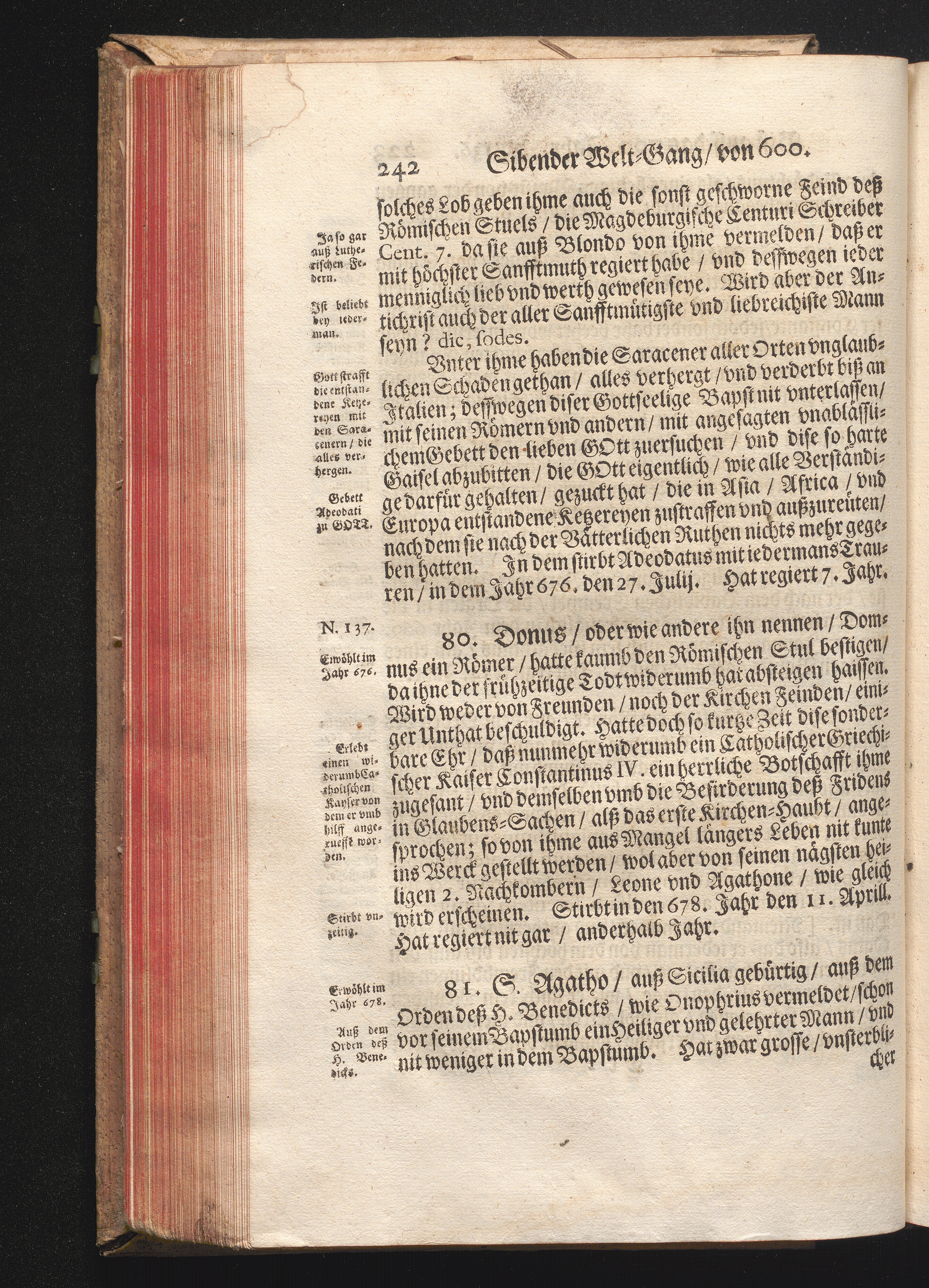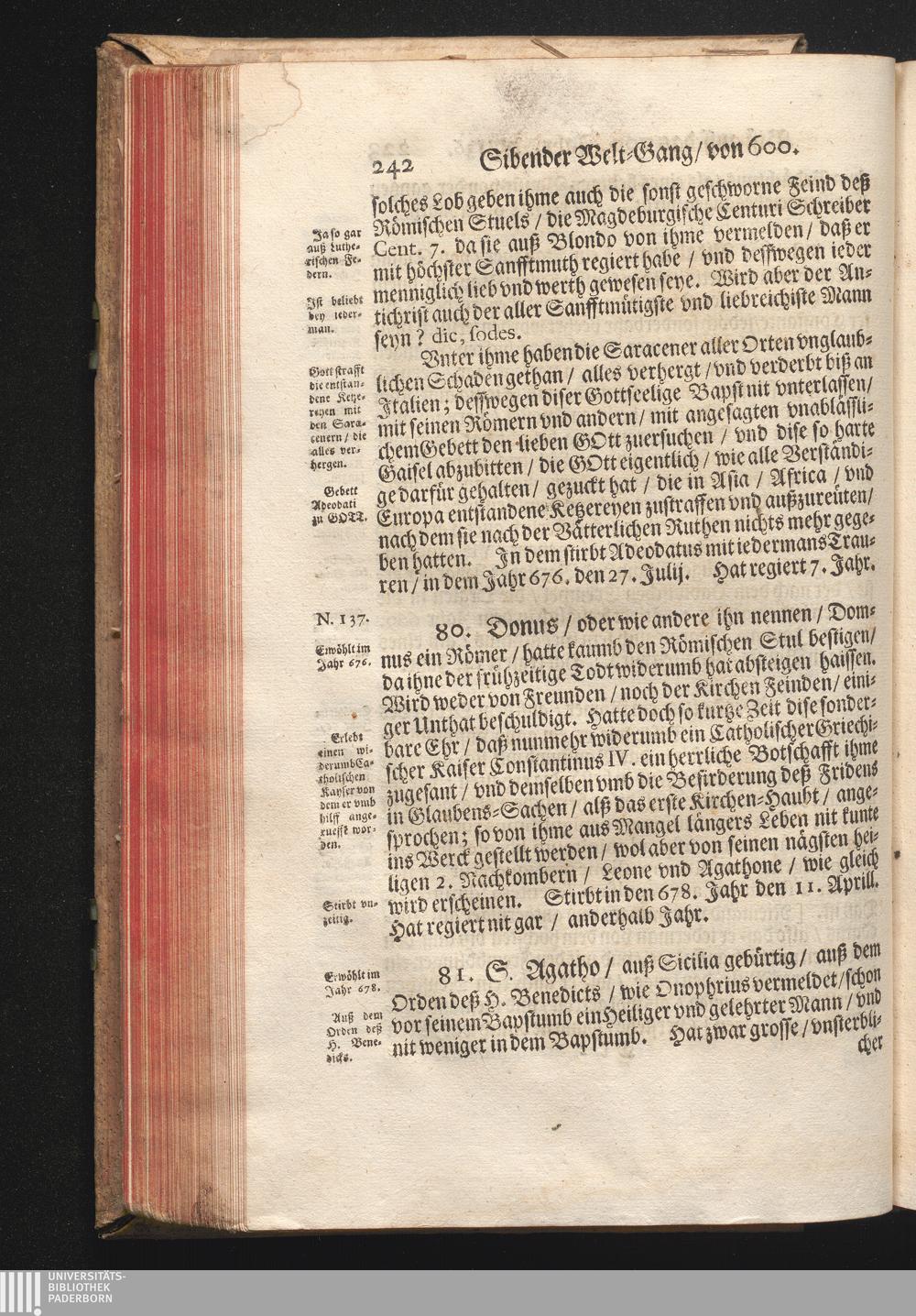 Roma Gloriosa, oder Das Glorwürdige Rom In seinen Zweyhundert Drey vnd Viertzig Bäpsten. Daß ist/ Römische Bäpst/ angefangen von S. Peter Biß auff den heutiges Tags glorwürdig regierenden vnseren Allerheiligsten Vatter Clemens Den Zehenden : Deren aller hart angefochtene Ehr vnd Ruhm/ neben erzehlung ihrer glorwürdigen Thaten/ in disem Tractat verfochten wird/ wider die grausame/ durchauß vngegründte vilfältige Schmach-Reden ihrer Feinden/ die auß disen wahrhafften Statthaltern Christi/ lauter Antichristen/ Zwar vergebens/ gantz lächerlich/ vnd vngeschickt wöllen machen ... / In Druck gegeben von Christophoro Ott Auß der Gesellschafft Jesu Priestern