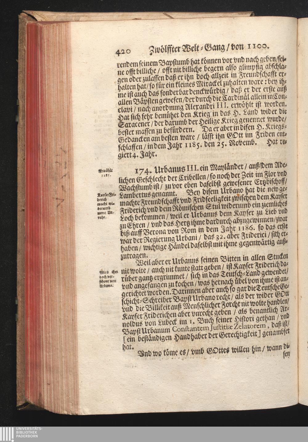 Roma Gloriosa, oder Das Glorwürdige Rom In seinen Zweyhundert Drey vnd Viertzig Bäpsten. Daß ist/ Römische Bäpst/ angefangen von S. Peter Biß auff den heutiges Tags glorwürdig regierenden vnseren Allerheiligsten Vatter Clemens Den Zehenden : Deren aller hart angefochtene Ehr vnd Ruhm/ neben erzehlung ihrer glorwürdigen Thaten/ in disem Tractat verfochten wird/ wider die grausame/ durchauß vngegründte vilfältige Schmach-Reden ihrer Feinden/ die auß disen wahrhafften Statthaltern Christi/ lauter Antichristen/ Zwar vergebens/ gantz lächerlich/ vnd vngeschickt wöllen machen ... / In Druck gegeben von Christophoro Ott Auß der Gesellschafft Jesu Priestern