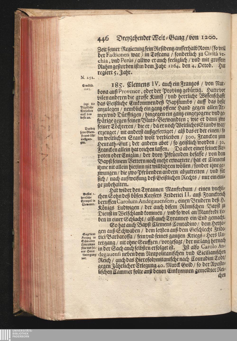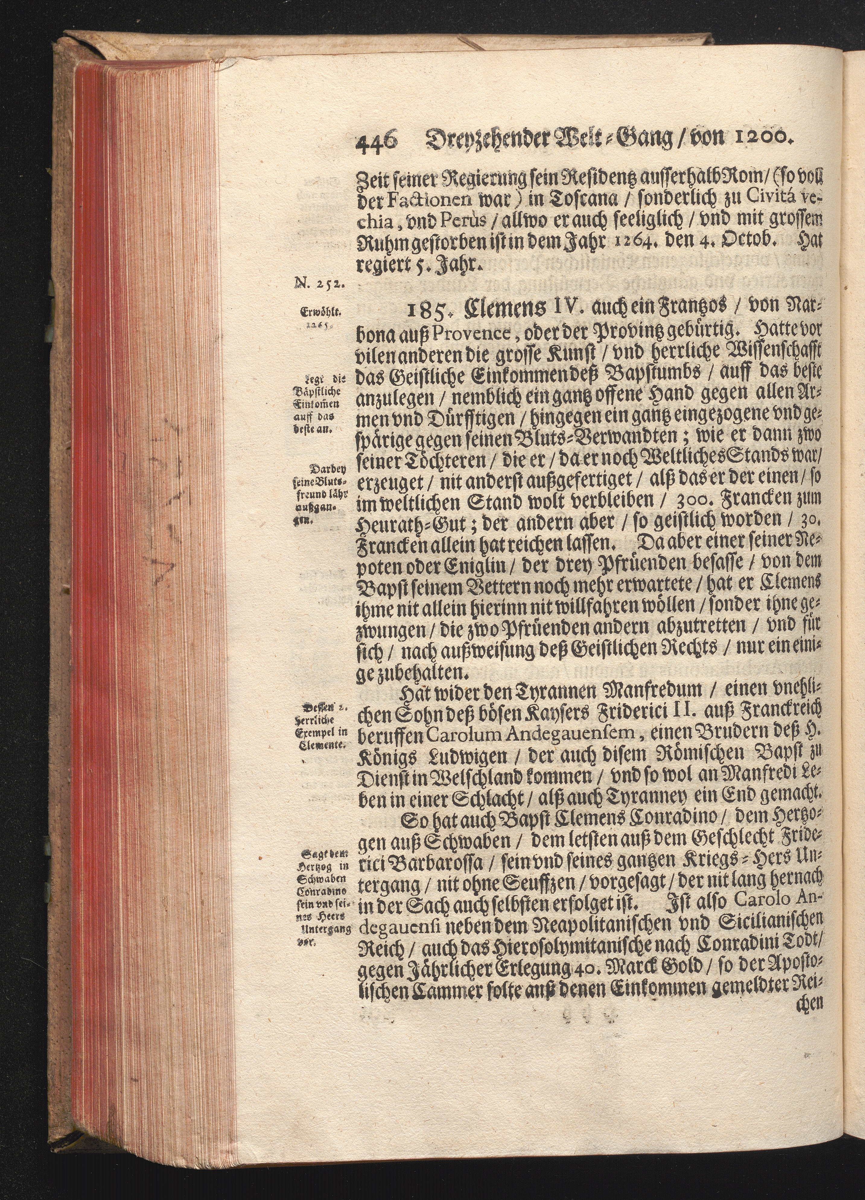 Roma Gloriosa, oder Das Glorwürdige Rom In seinen Zweyhundert Drey vnd Viertzig Bäpsten. Daß ist/ Römische Bäpst/ angefangen von S. Peter Biß auff den heutiges Tags glorwürdig regierenden vnseren Allerheiligsten Vatter Clemens Den Zehenden : Deren aller hart angefochtene Ehr vnd Ruhm/ neben erzehlung ihrer glorwürdigen Thaten/ in disem Tractat verfochten wird/ wider die grausame/ durchauß vngegründte vilfältige Schmach-Reden ihrer Feinden/ die auß disen wahrhafften Statthaltern Christi/ lauter Antichristen/ Zwar vergebens/ gantz lächerlich/ vnd vngeschickt wöllen machen ... / In Druck gegeben von Christophoro Ott Auß der Gesellschafft Jesu Priestern