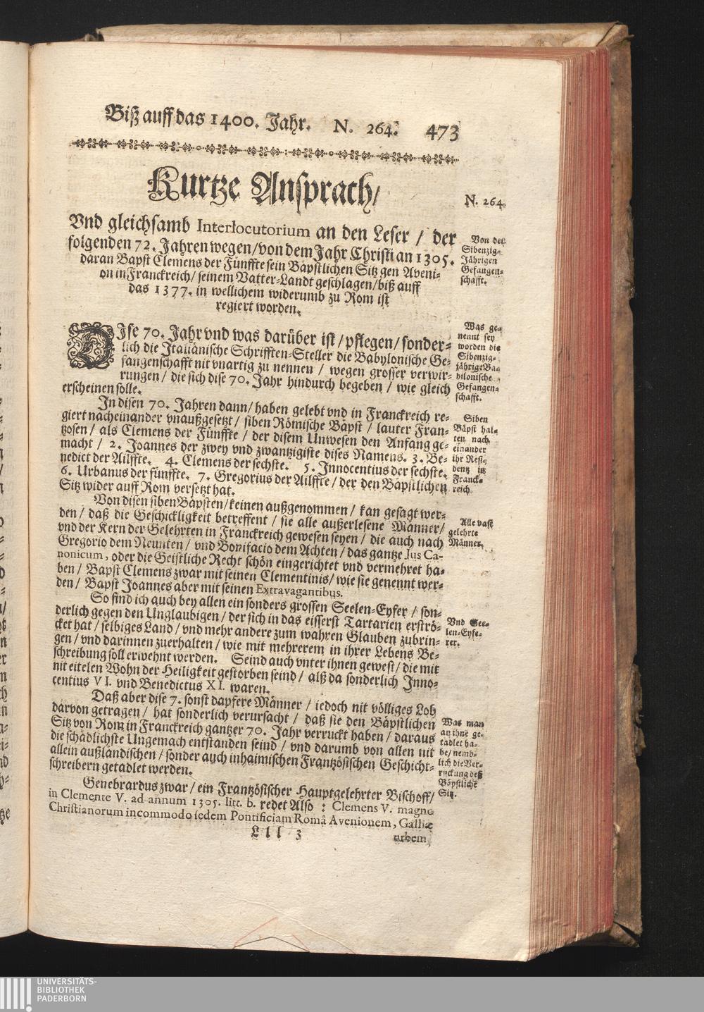 Roma Gloriosa, oder Das Glorwürdige Rom In seinen Zweyhundert Drey vnd Viertzig Bäpsten. Daß ist/ Römische Bäpst/ angefangen von S. Peter Biß auff den heutiges Tags glorwürdig regierenden vnseren Allerheiligsten Vatter Clemens Den Zehenden : Deren aller hart angefochtene Ehr vnd Ruhm/ neben erzehlung ihrer glorwürdigen Thaten/ in disem Tractat verfochten wird/ wider die grausame/ durchauß vngegründte vilfältige Schmach-Reden ihrer Feinden/ die auß disen wahrhafften Statthaltern Christi/ lauter Antichristen/ Zwar vergebens/ gantz lächerlich/ vnd vngeschickt wöllen machen ... / In Druck gegeben von Christophoro Ott Auß der Gesellschafft Jesu Priestern