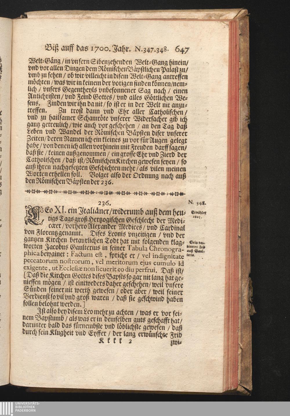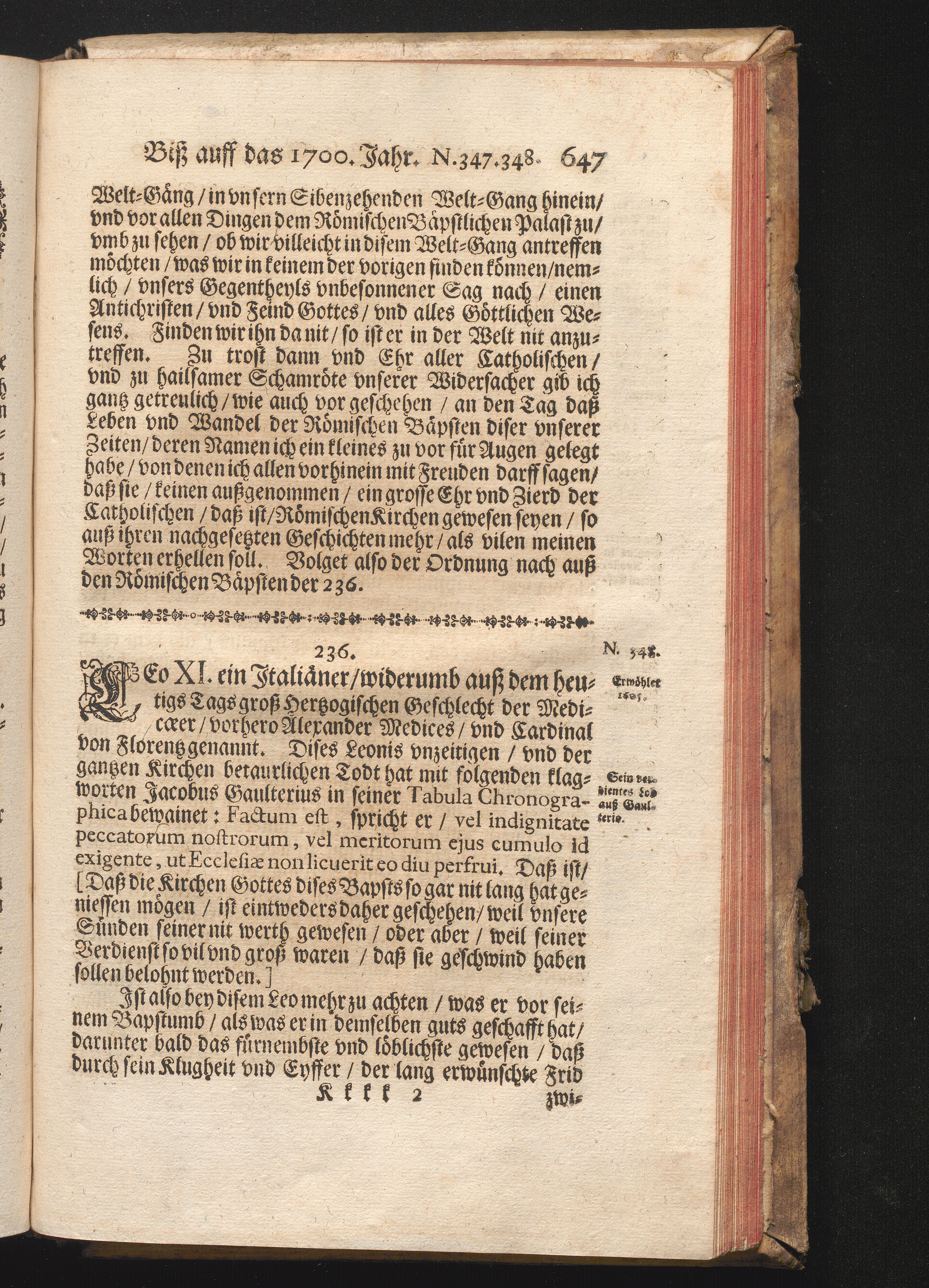 Roma Gloriosa, oder Das Glorwürdige Rom In seinen Zweyhundert Drey vnd Viertzig Bäpsten. Daß ist/ Römische Bäpst/ angefangen von S. Peter Biß auff den heutiges Tags glorwürdig regierenden vnseren Allerheiligsten Vatter Clemens Den Zehenden : Deren aller hart angefochtene Ehr vnd Ruhm/ neben erzehlung ihrer glorwürdigen Thaten/ in disem Tractat verfochten wird/ wider die grausame/ durchauß vngegründte vilfältige Schmach-Reden ihrer Feinden/ die auß disen wahrhafften Statthaltern Christi/ lauter Antichristen/ Zwar vergebens/ gantz lächerlich/ vnd vngeschickt wöllen machen ... / In Druck gegeben von Christophoro Ott Auß der Gesellschafft Jesu Priestern