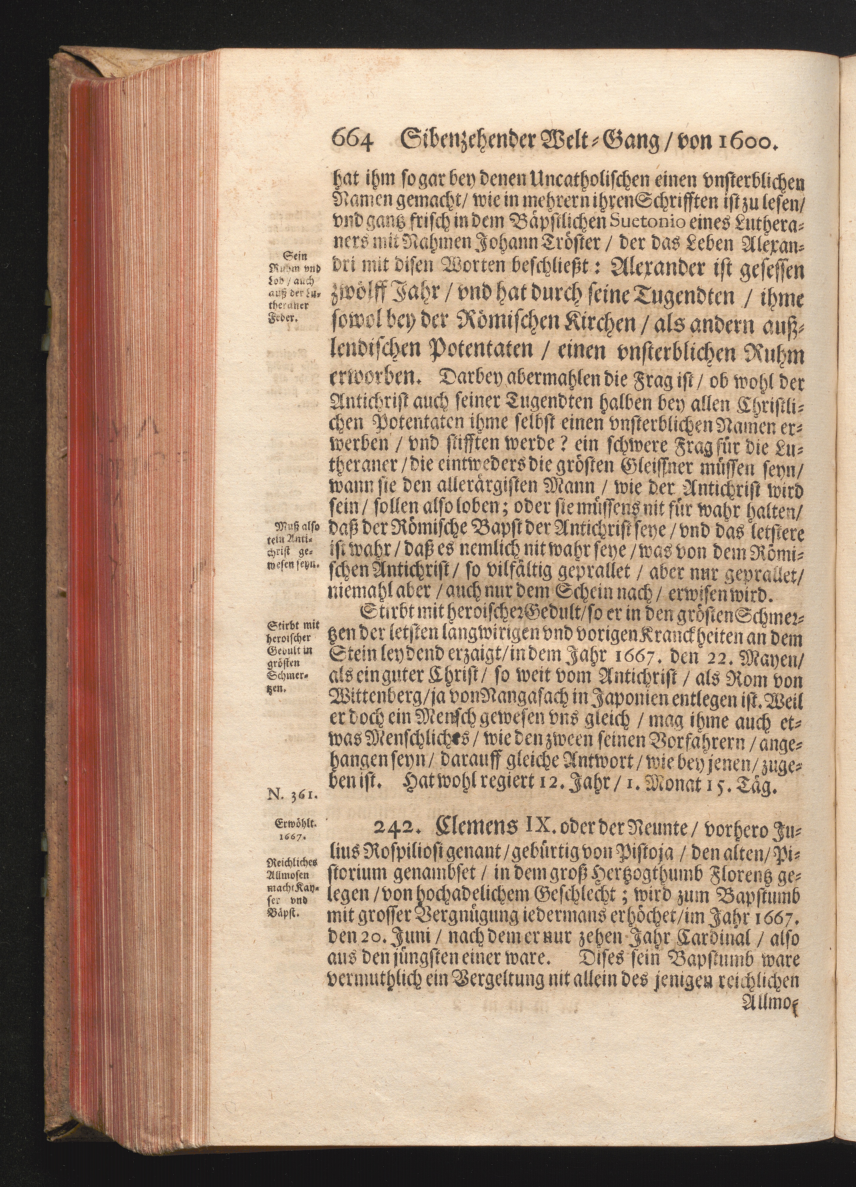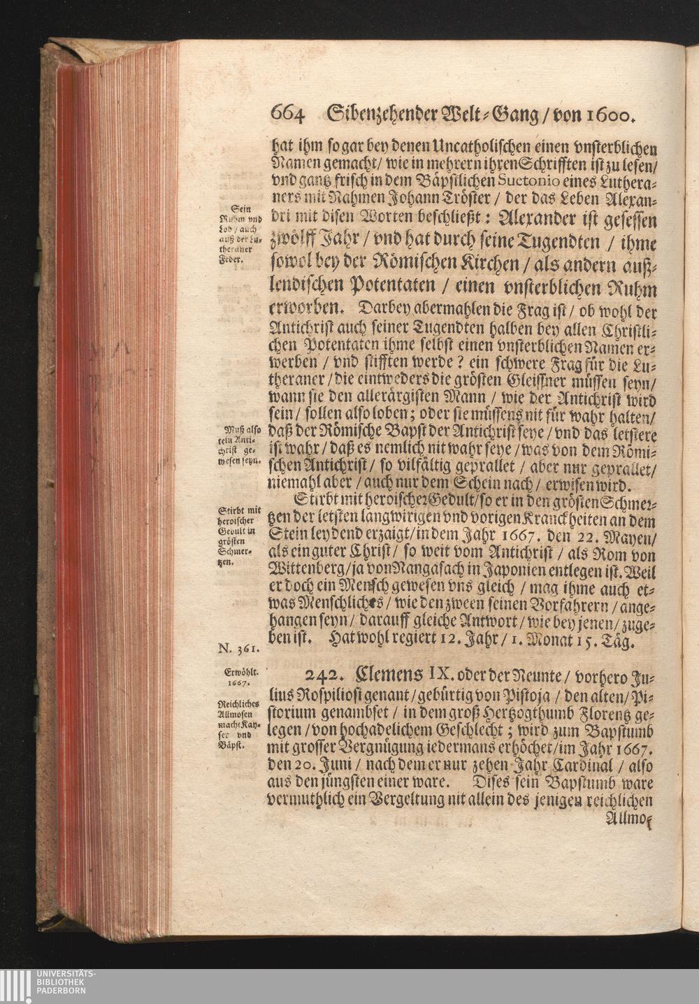 Roma Gloriosa, oder Das Glorwürdige Rom In seinen Zweyhundert Drey vnd Viertzig Bäpsten. Daß ist/ Römische Bäpst/ angefangen von S. Peter Biß auff den heutiges Tags glorwürdig regierenden vnseren Allerheiligsten Vatter Clemens Den Zehenden : Deren aller hart angefochtene Ehr vnd Ruhm/ neben erzehlung ihrer glorwürdigen Thaten/ in disem Tractat verfochten wird/ wider die grausame/ durchauß vngegründte vilfältige Schmach-Reden ihrer Feinden/ die auß disen wahrhafften Statthaltern Christi/ lauter Antichristen/ Zwar vergebens/ gantz lächerlich/ vnd vngeschickt wöllen machen ... / In Druck gegeben von Christophoro Ott Auß der Gesellschafft Jesu Priestern