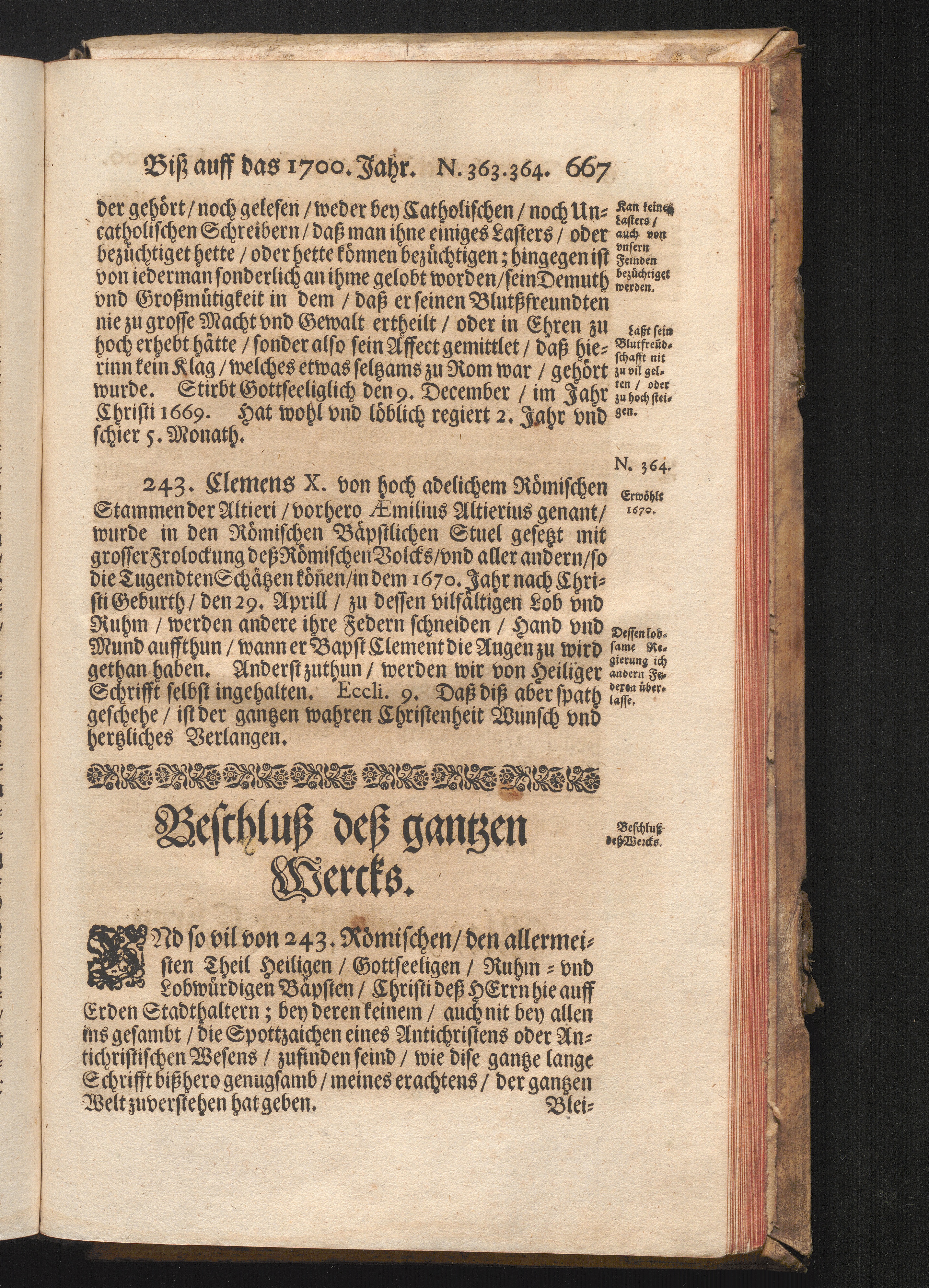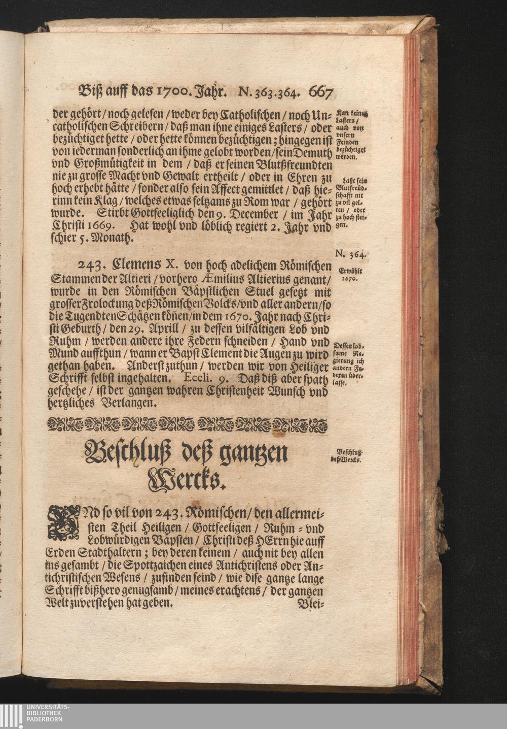 Roma Gloriosa, oder Das Glorwürdige Rom In seinen Zweyhundert Drey vnd Viertzig Bäpsten. Daß ist/ Römische Bäpst/ angefangen von S. Peter Biß auff den heutiges Tags glorwürdig regierenden vnseren Allerheiligsten Vatter Clemens Den Zehenden : Deren aller hart angefochtene Ehr vnd Ruhm/ neben erzehlung ihrer glorwürdigen Thaten/ in disem Tractat verfochten wird/ wider die grausame/ durchauß vngegründte vilfältige Schmach-Reden ihrer Feinden/ die auß disen wahrhafften Statthaltern Christi/ lauter Antichristen/ Zwar vergebens/ gantz lächerlich/ vnd vngeschickt wöllen machen ... / In Druck gegeben von Christophoro Ott Auß der Gesellschafft Jesu Priestern