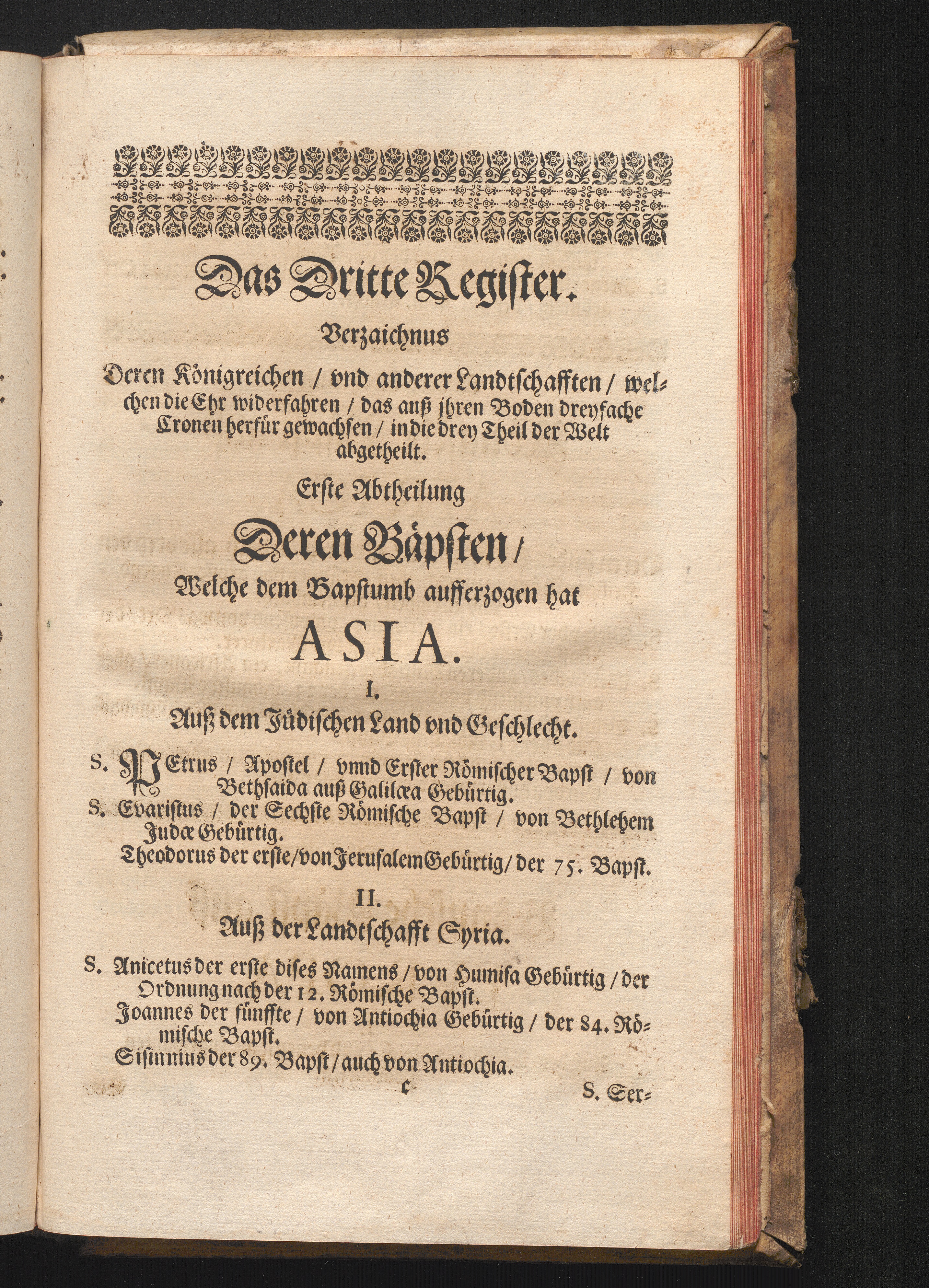 Roma Gloriosa, oder Das Glorwürdige Rom In seinen Zweyhundert Drey vnd Viertzig Bäpsten. Daß ist/ Römische Bäpst/ angefangen von S. Peter Biß auff den heutiges Tags glorwürdig regierenden vnseren Allerheiligsten Vatter Clemens Den Zehenden : Deren aller hart angefochtene Ehr vnd Ruhm/ neben erzehlung ihrer glorwürdigen Thaten/ in disem Tractat verfochten wird/ wider die grausame/ durchauß vngegründte vilfältige Schmach-Reden ihrer Feinden/ die auß disen wahrhafften Statthaltern Christi/ lauter Antichristen/ Zwar vergebens/ gantz lächerlich/ vnd vngeschickt wöllen machen ... / In Druck gegeben von Christophoro Ott Auß der Gesellschafft Jesu Priestern