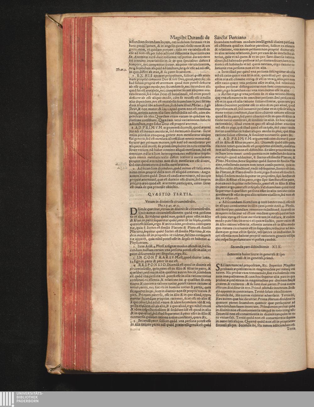 DN. DVRANDI|| à Sancto Portiano, in Senten=||tias Theologicas Petri Lombardi|| Commentariorum libri|| quatuor.|| / Primùm quidem per Nicolaum à Martimbos, eximium Nauarrensis|| Collegij Theologum, nunc verò denuo per alios quosdam|| non inferioris notæ Doctores quanta fieri po-||tuit cura diligentiáque emendati.|| Vná cum Auctoris Vita, & copiosissimo|| decisionum omnium|| Indice.||