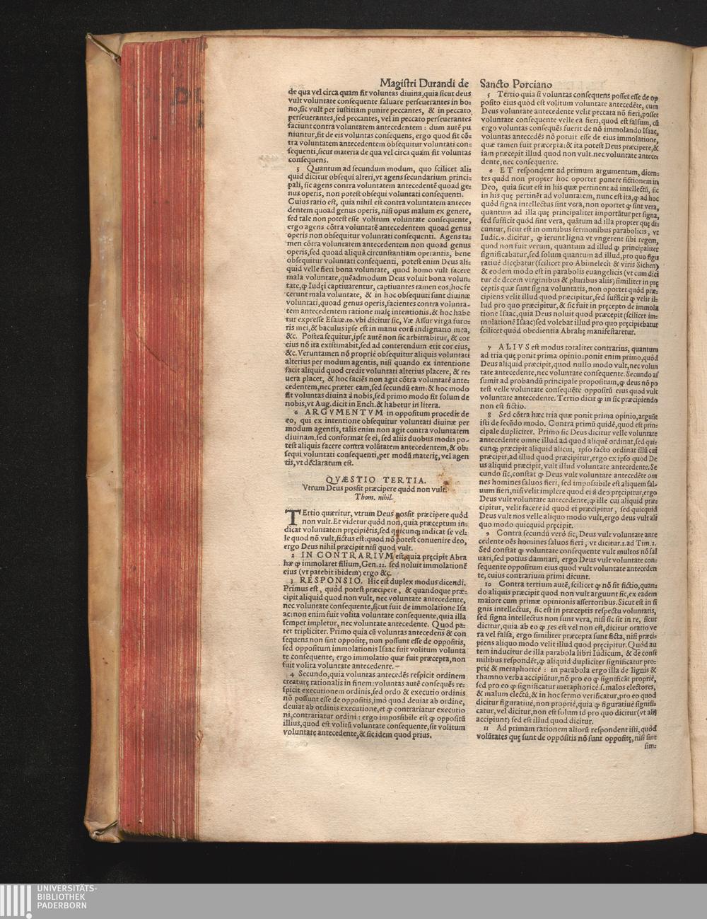 DN. DVRANDI|| à Sancto Portiano, in Senten=||tias Theologicas Petri Lombardi|| Commentariorum libri|| quatuor.|| / Primùm quidem per Nicolaum à Martimbos, eximium Nauarrensis|| Collegij Theologum, nunc verò denuo per alios quosdam|| non inferioris notæ Doctores quanta fieri po-||tuit cura diligentiáque emendati.|| Vná cum Auctoris Vita, & copiosissimo|| decisionum omnium|| Indice.||