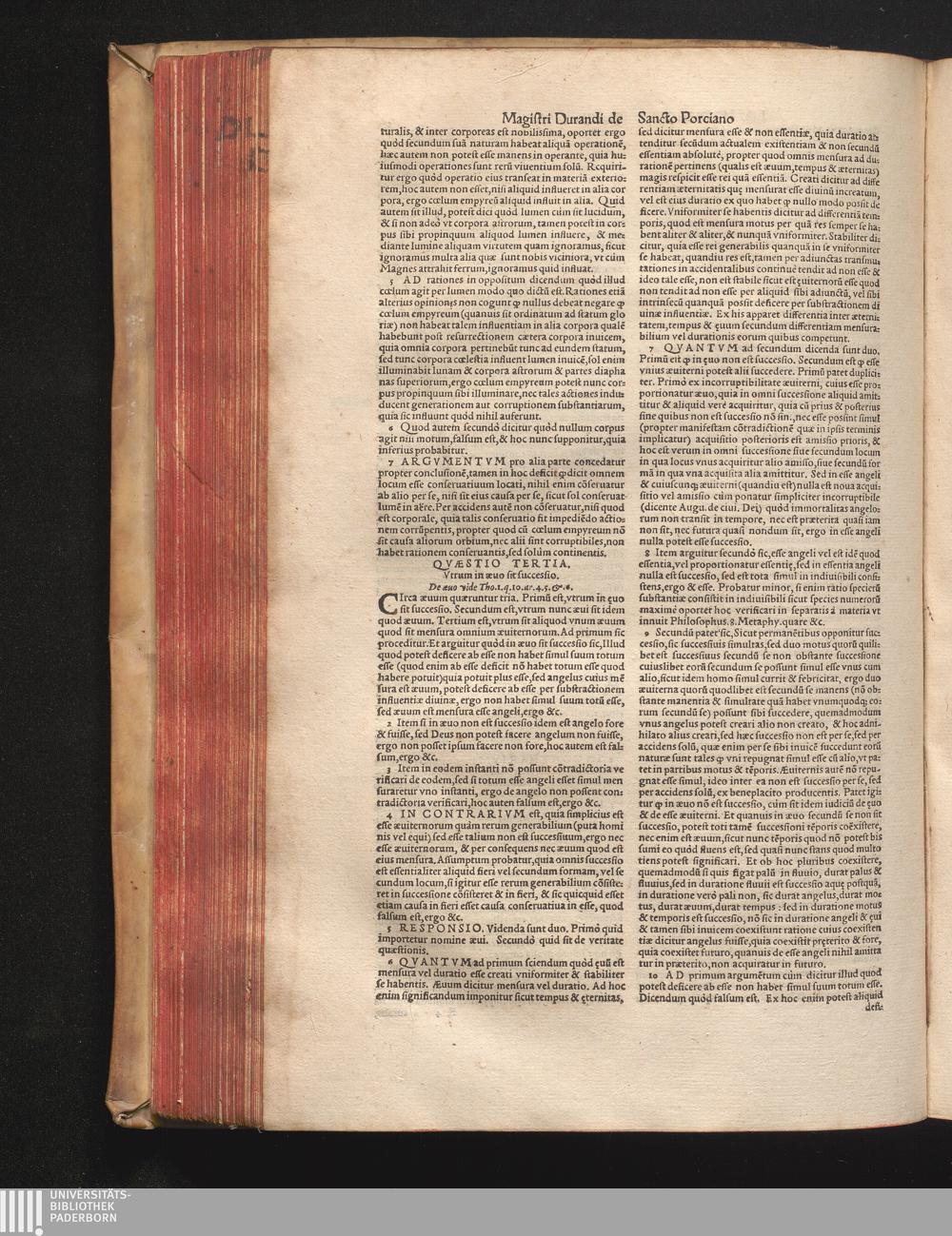 DN. DVRANDI|| à Sancto Portiano, in Senten=||tias Theologicas Petri Lombardi|| Commentariorum libri|| quatuor.|| / Primùm quidem per Nicolaum à Martimbos, eximium Nauarrensis|| Collegij Theologum, nunc verò denuo per alios quosdam|| non inferioris notæ Doctores quanta fieri po-||tuit cura diligentiáque emendati.|| Vná cum Auctoris Vita, & copiosissimo|| decisionum omnium|| Indice.||