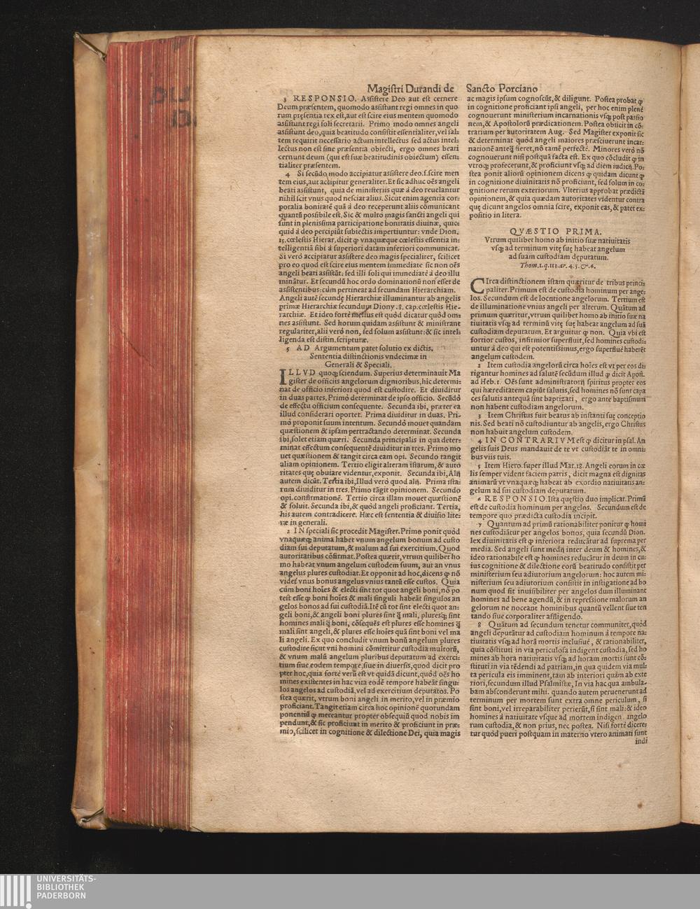 DN. DVRANDI|| à Sancto Portiano, in Senten=||tias Theologicas Petri Lombardi|| Commentariorum libri|| quatuor.|| / Primùm quidem per Nicolaum à Martimbos, eximium Nauarrensis|| Collegij Theologum, nunc verò denuo per alios quosdam|| non inferioris notæ Doctores quanta fieri po-||tuit cura diligentiáque emendati.|| Vná cum Auctoris Vita, & copiosissimo|| decisionum omnium|| Indice.||