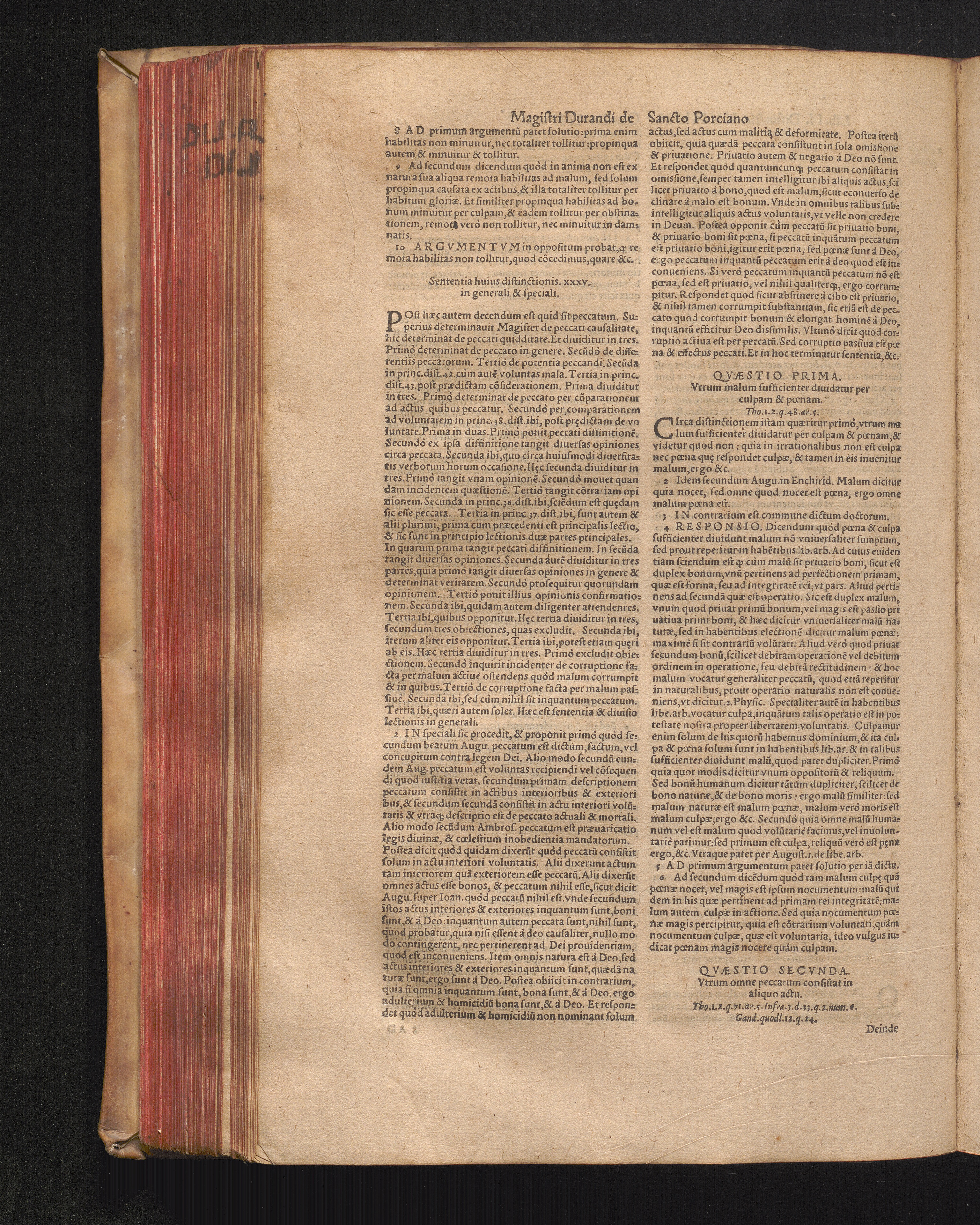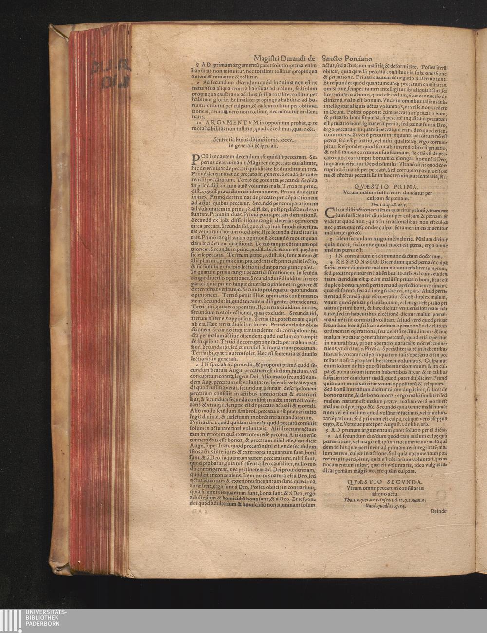 DN. DVRANDI|| à Sancto Portiano, in Senten=||tias Theologicas Petri Lombardi|| Commentariorum libri|| quatuor.|| / Primùm quidem per Nicolaum à Martimbos, eximium Nauarrensis|| Collegij Theologum, nunc verò denuo per alios quosdam|| non inferioris notæ Doctores quanta fieri po-||tuit cura diligentiáque emendati.|| Vná cum Auctoris Vita, & copiosissimo|| decisionum omnium|| Indice.||
