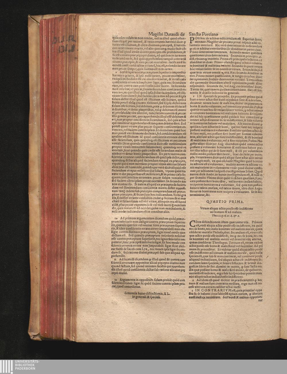 DN. DVRANDI|| à Sancto Portiano, in Senten=||tias Theologicas Petri Lombardi|| Commentariorum libri|| quatuor.|| / Primùm quidem per Nicolaum à Martimbos, eximium Nauarrensis|| Collegij Theologum, nunc verò denuo per alios quosdam|| non inferioris notæ Doctores quanta fieri po-||tuit cura diligentiáque emendati.|| Vná cum Auctoris Vita, & copiosissimo|| decisionum omnium|| Indice.||