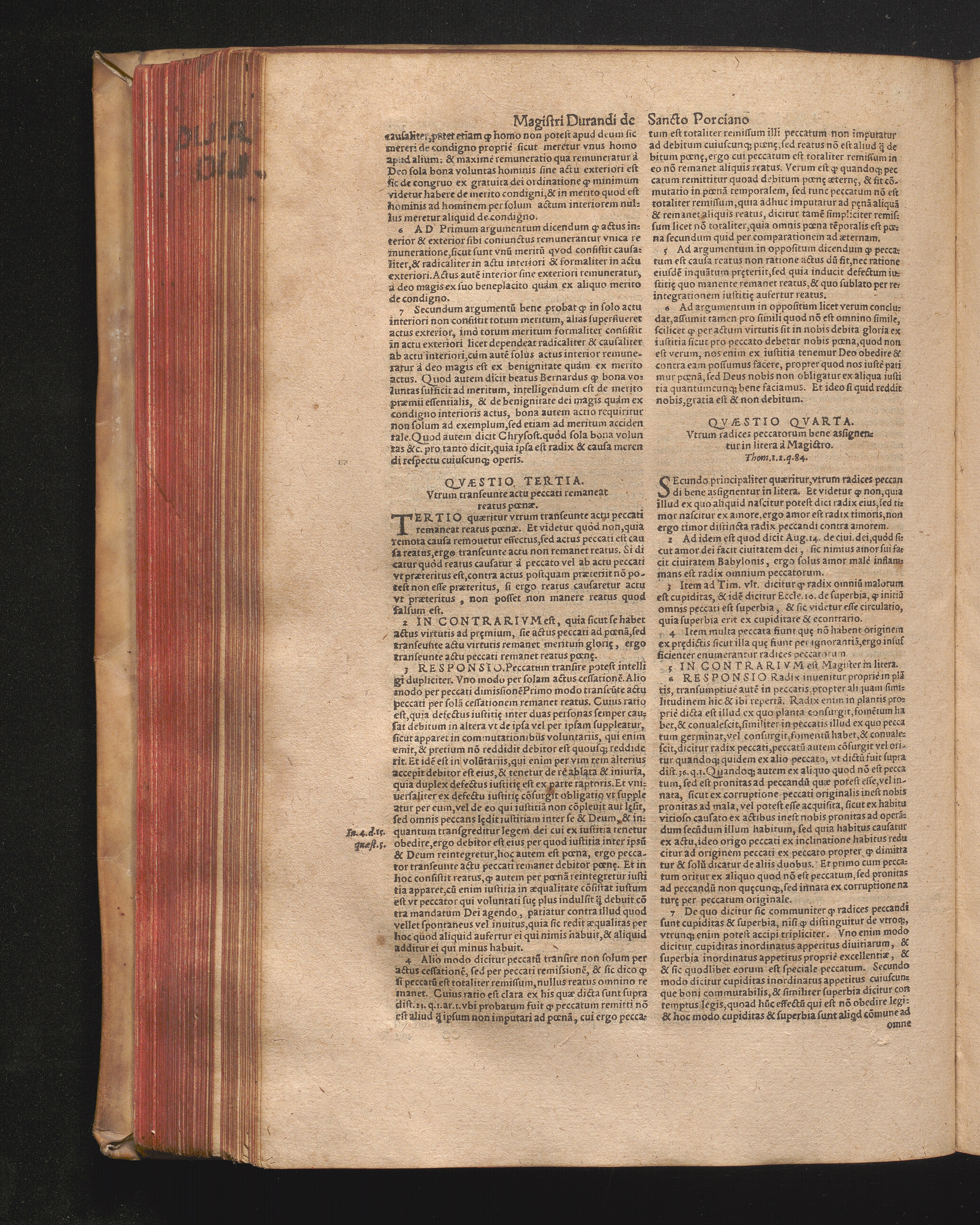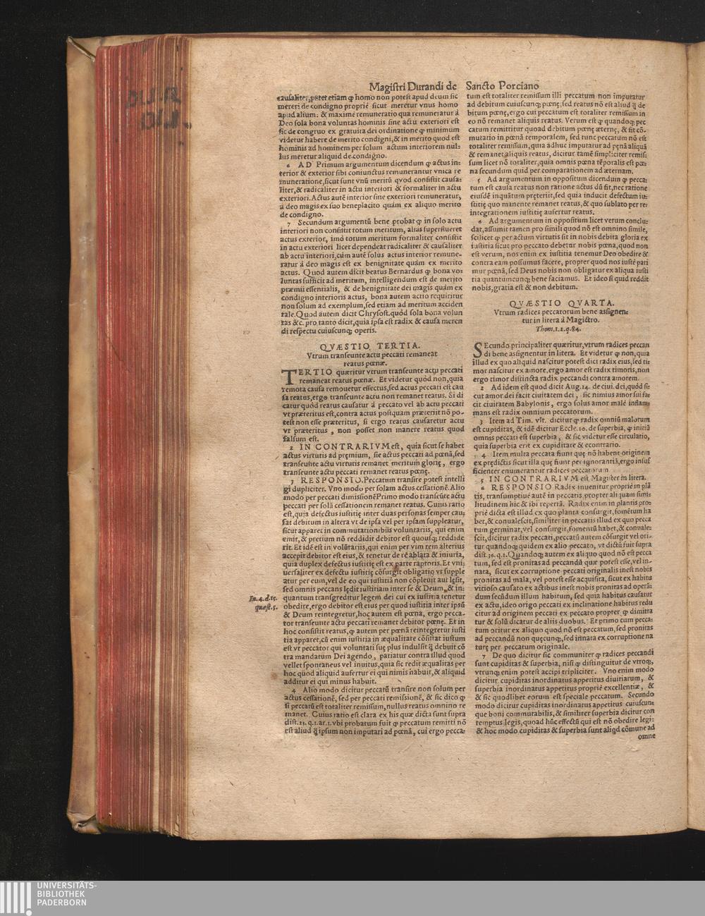 DN. DVRANDI|| à Sancto Portiano, in Senten=||tias Theologicas Petri Lombardi|| Commentariorum libri|| quatuor.|| / Primùm quidem per Nicolaum à Martimbos, eximium Nauarrensis|| Collegij Theologum, nunc verò denuo per alios quosdam|| non inferioris notæ Doctores quanta fieri po-||tuit cura diligentiáque emendati.|| Vná cum Auctoris Vita, & copiosissimo|| decisionum omnium|| Indice.||