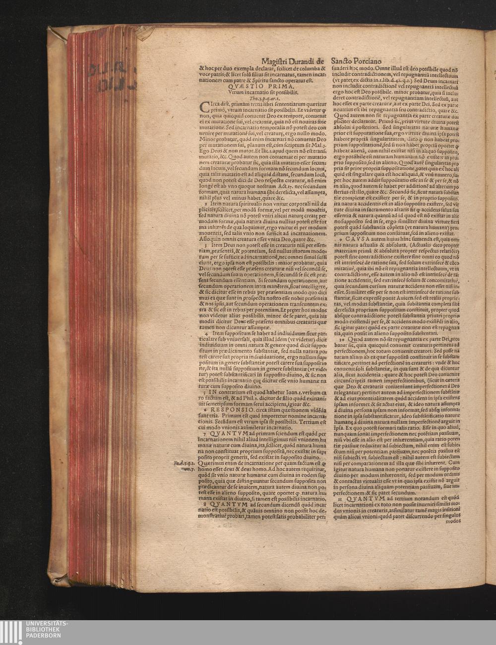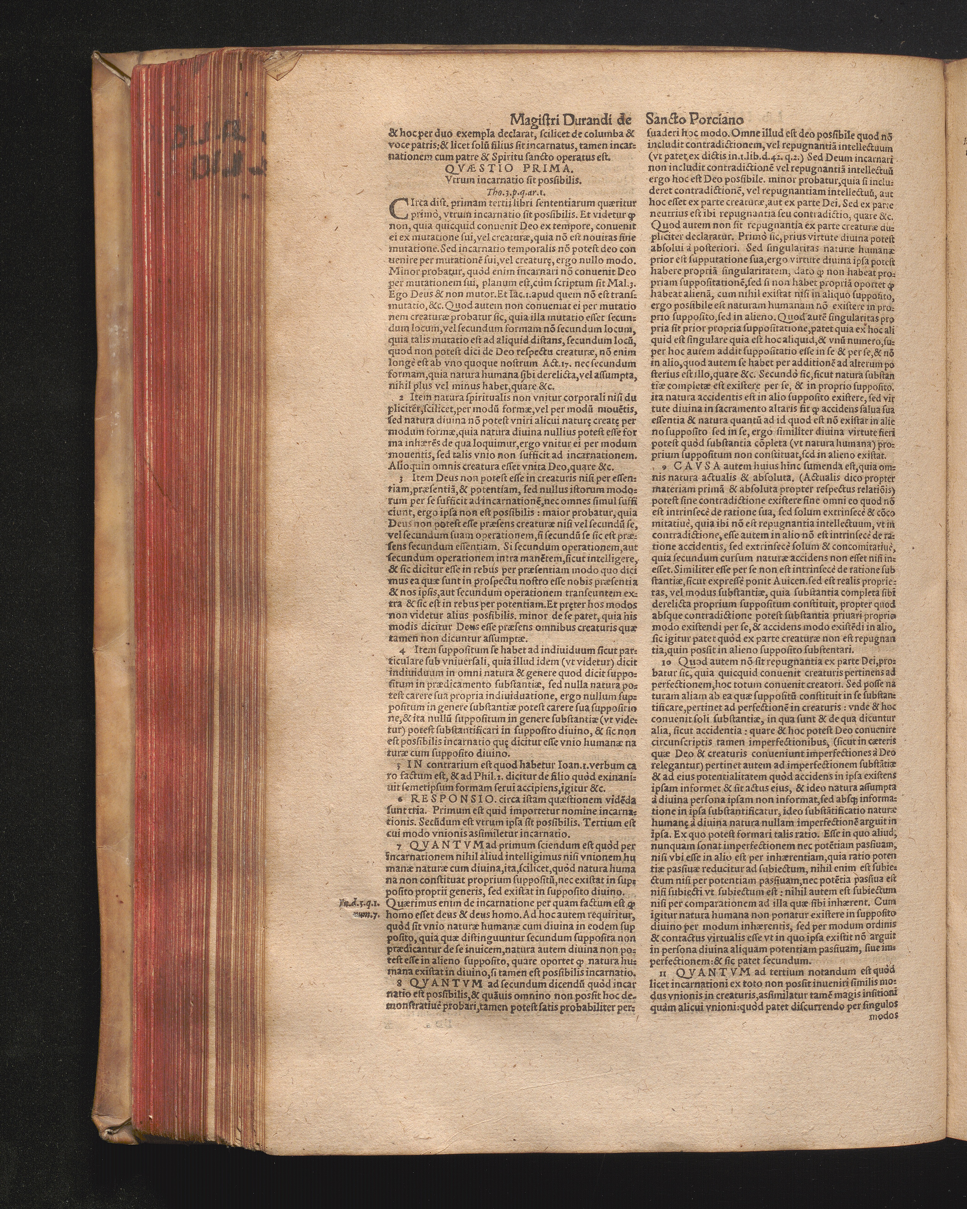DN. DVRANDI|| à Sancto Portiano, in Senten=||tias Theologicas Petri Lombardi|| Commentariorum libri|| quatuor.|| / Primùm quidem per Nicolaum à Martimbos, eximium Nauarrensis|| Collegij Theologum, nunc verò denuo per alios quosdam|| non inferioris notæ Doctores quanta fieri po-||tuit cura diligentiáque emendati.|| Vná cum Auctoris Vita, & copiosissimo|| decisionum omnium|| Indice.||
